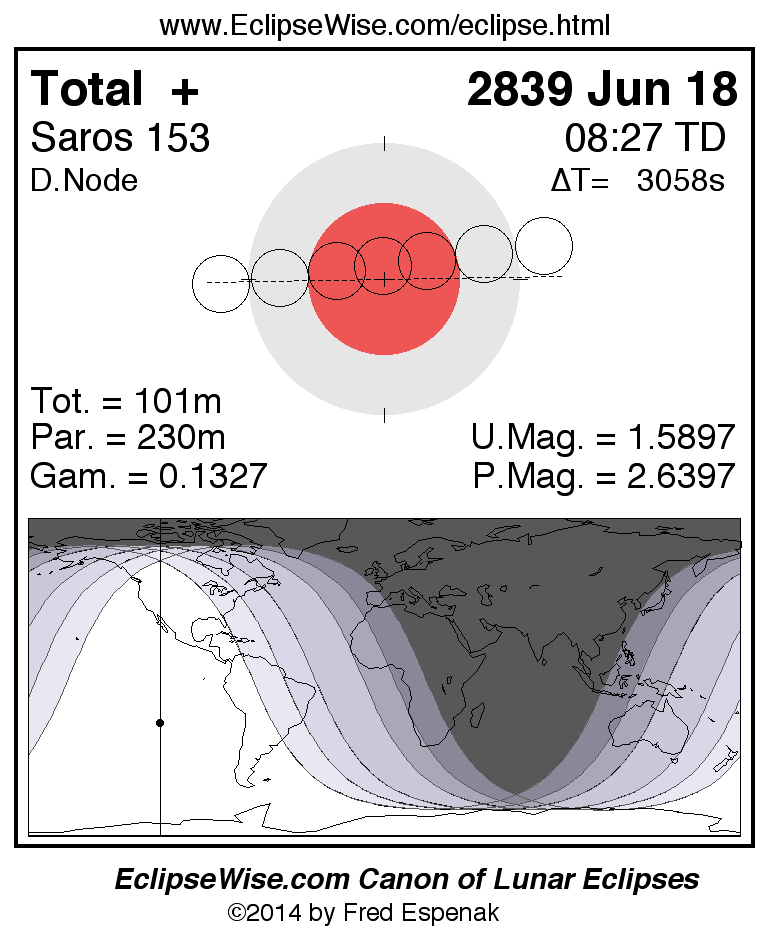 The total lunar eclipse of 2839 Jun 18 is preceded two weeks earlier by a partial solar eclipse on 2839 Jun 03,