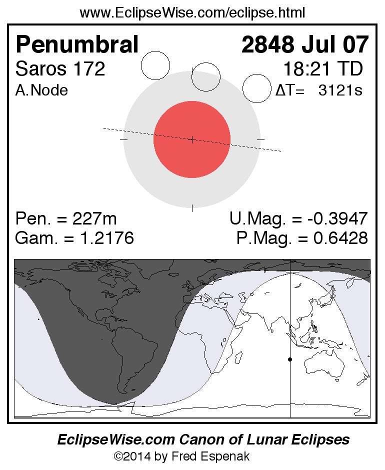 The penumbral lunar eclipse of 2848 Jul 07 is preceded two weeks earlier by a total solar eclipse on 2848 Jun 22.
