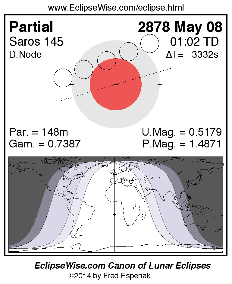 The instant of greatest eclipse takes place on 2878 May 08 at 01:02:01 TD (00:06:29 UT1).