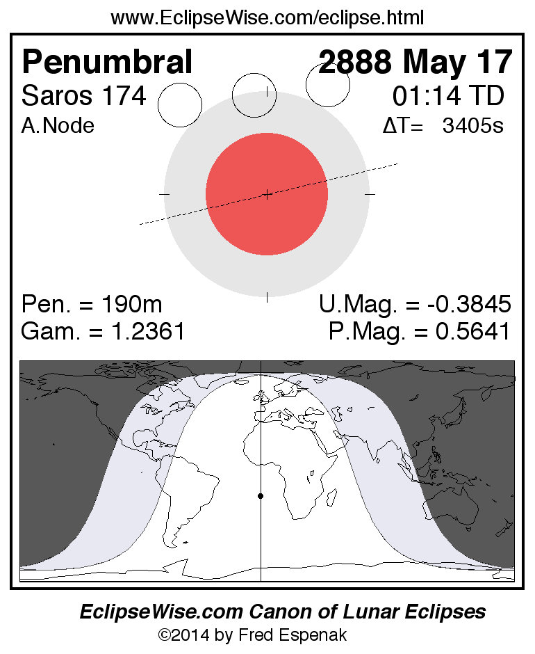 Another lunar eclipse occurs one synodic month before the 2888 May 17 eclipse. It is the penumbral lunar eclipse of 2888 Apr 17.
