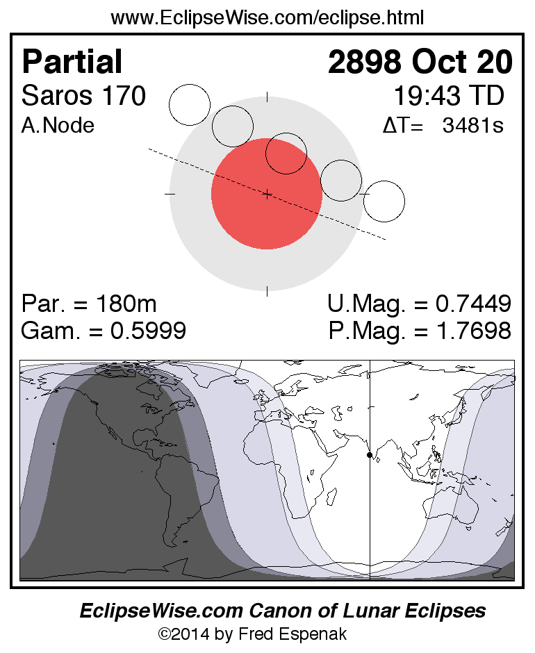 The instant of greatest eclipse takes place on 2898 Oct 20 at 19:43:12 TD (18:45:11 UT1).