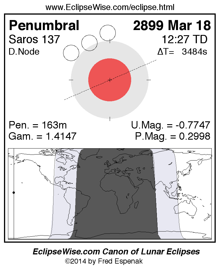 Another lunar eclipse occurs one synodic month after the 2899 Mar 18 eclipse. It is the penumbral lunar eclipse of 2899 Apr 17.