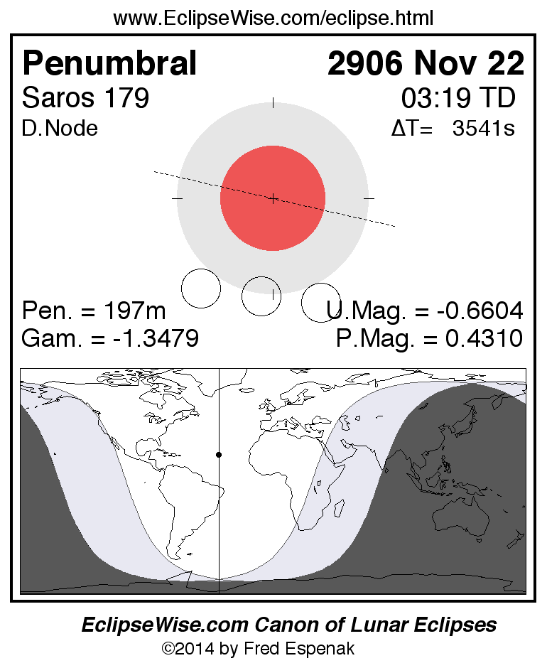 The penumbral lunar eclipse of 2906 Nov 22 is preceded two weeks earlier by a total solar eclipse on 2906 Nov 07.