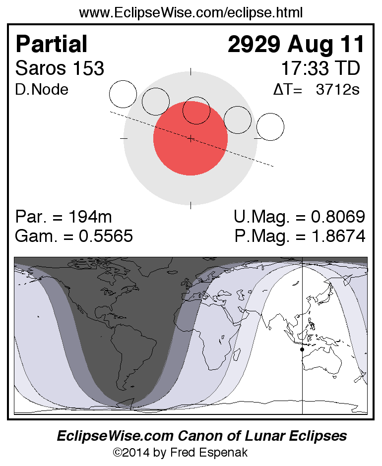 The partial lunar eclipse of 2929 Aug 11 is followed two weeks later by a total solar eclipse on 2929 Aug 25.