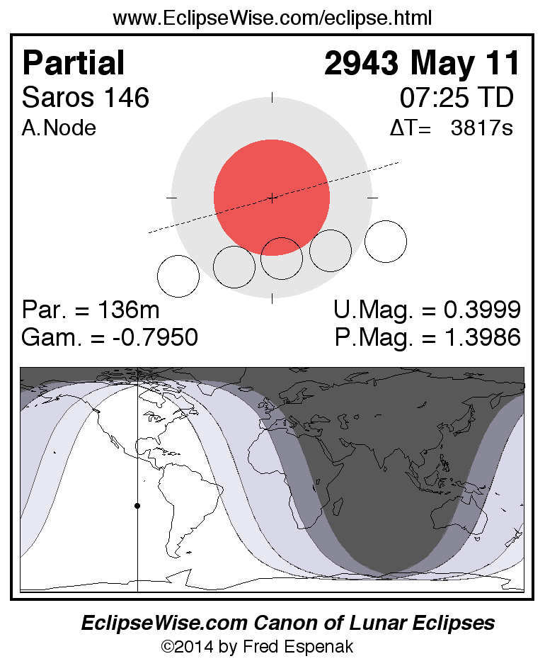 The partial lunar eclipse of 2943 May 11 is followed two weeks later by a annular solar eclipse on 2943 May 25.