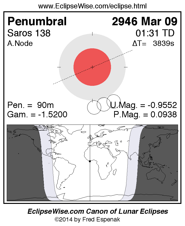 The penumbral lunar eclipse of 2946 Mar 09 is followed two weeks later by a total solar eclipse on 2946 Mar 24.