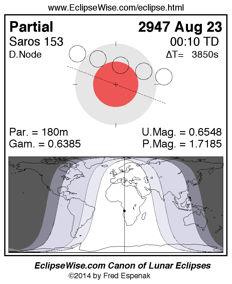 The partial lunar eclipse of 2947 Aug 23 is followed two weeks later by a total solar eclipse on 2947 Sep 06.