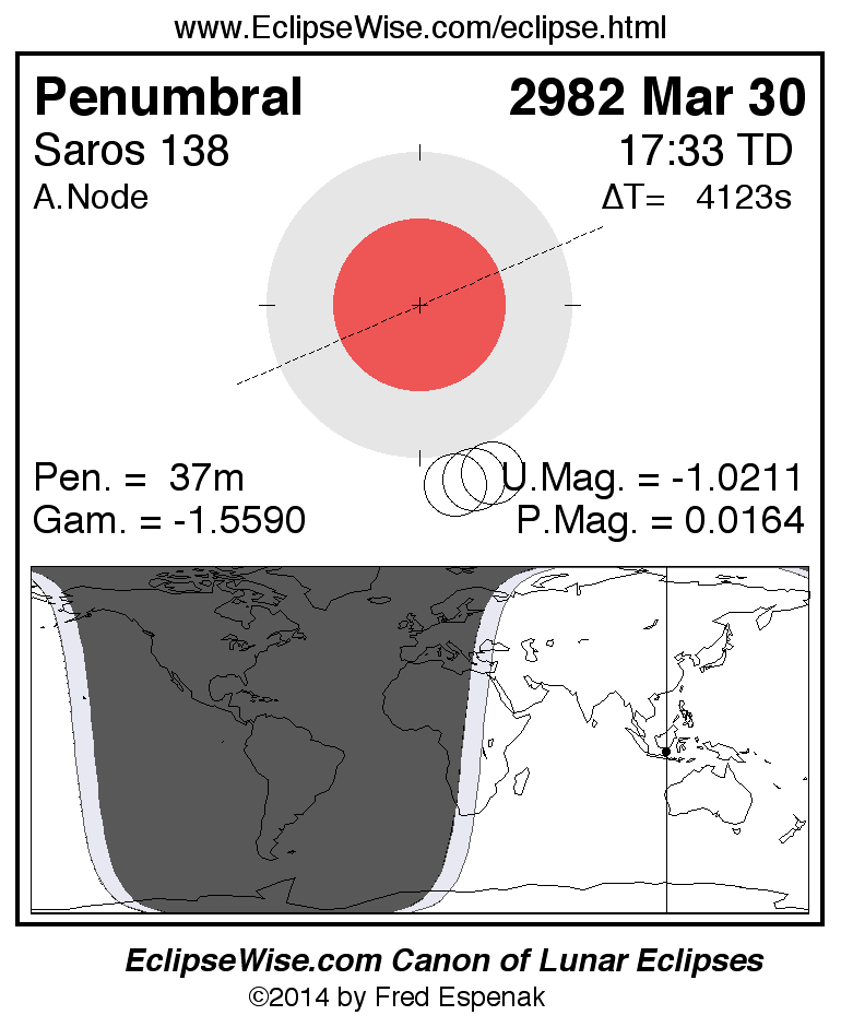 Another lunar eclipse occurs one synodic month after the 2982 Mar 30 eclipse. It is the penumbral lunar eclipse of 2982 Apr 29.