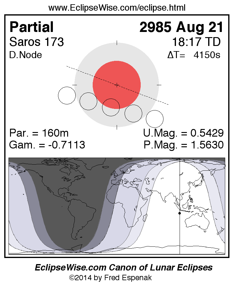 The instant of greatest eclipse takes place on 2985 Aug 21 at 18:16:51 TD (17:07:41 UT1).