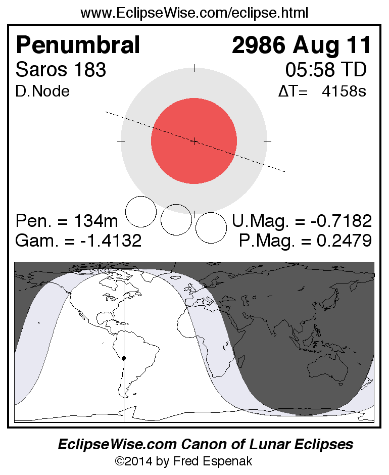 Another lunar eclipse occurs one synodic month before the 2986 Aug 11 eclipse. It is the penumbral lunar eclipse of 2986 Jul 12.