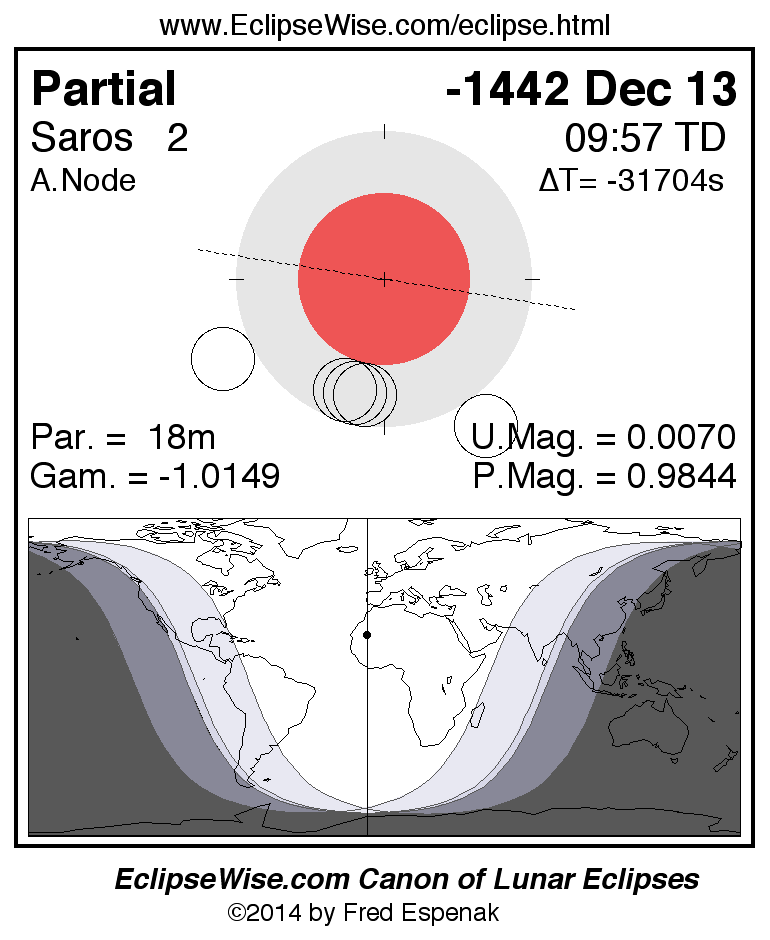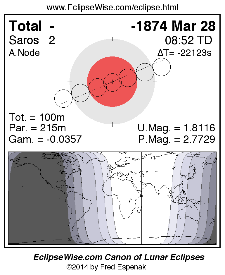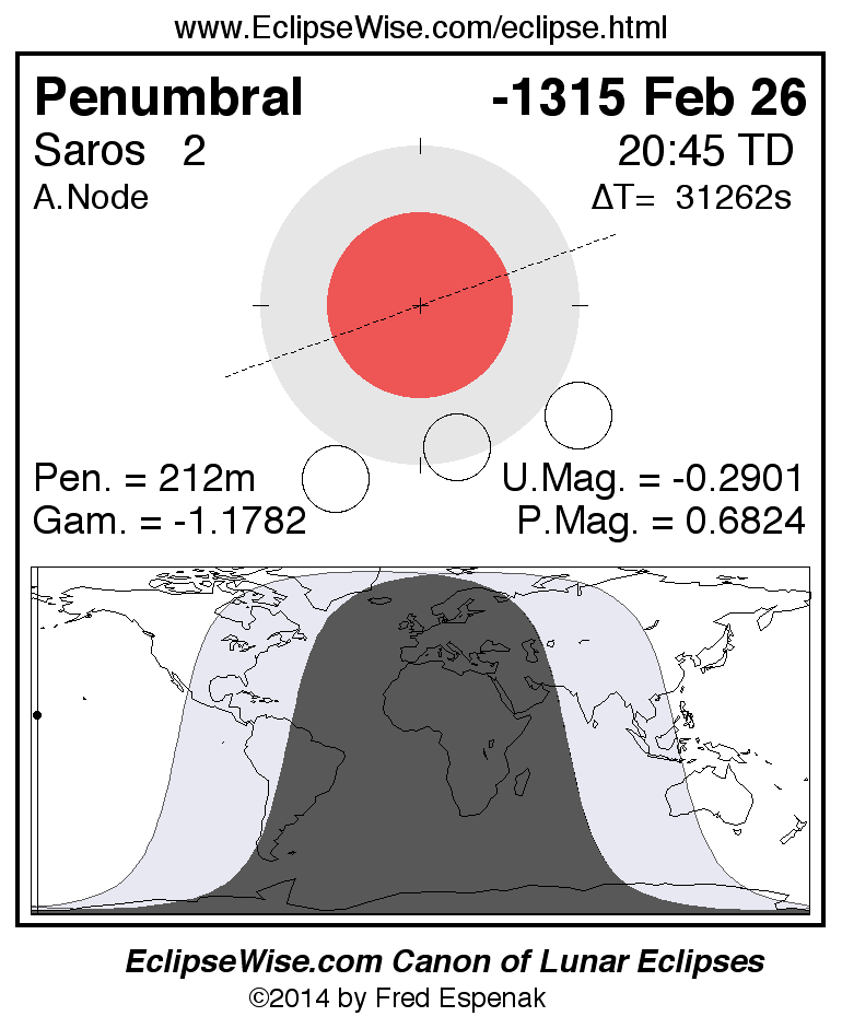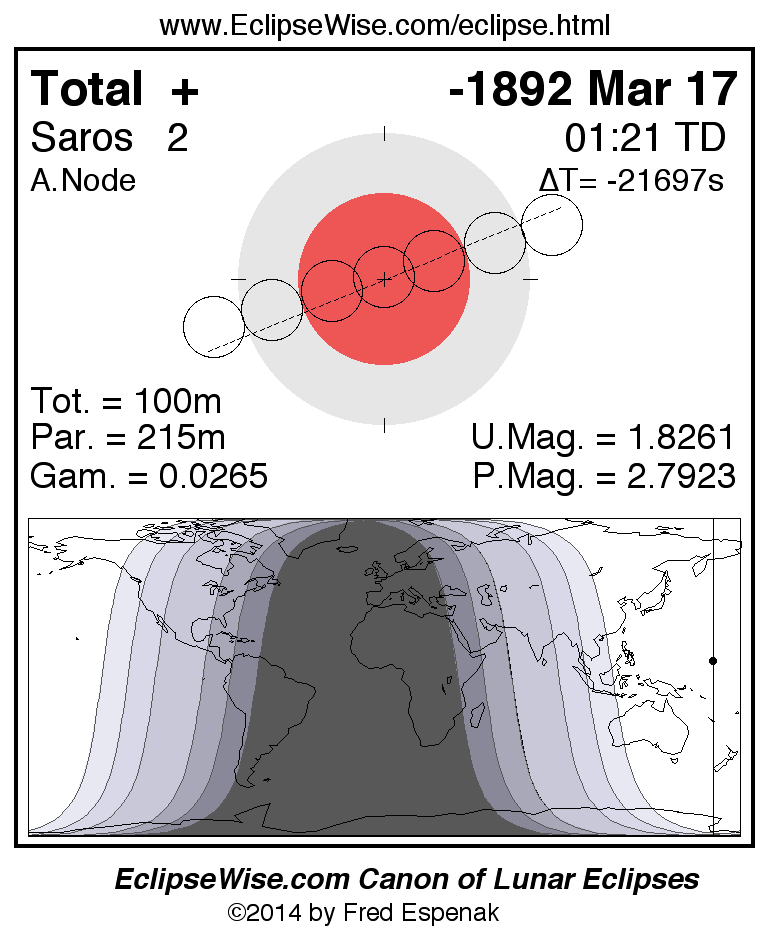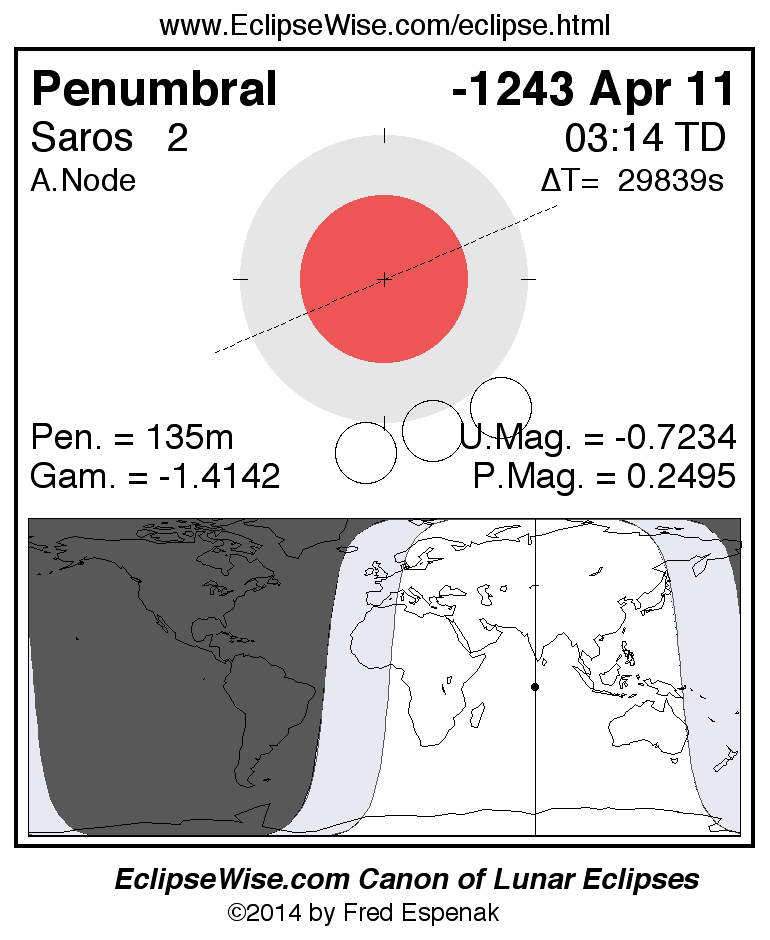 A panorama of all lunar eclipses belonging to Saros 2 is presented here. Each figure shows the Moon's path with respect to Earth's penumbral and umbral shadows. Below the path is a map depicting the geographic region of visibility for the eclipse. The date and time are given for the instant of Greatest Eclipse. Every figure serves as a hyperlink to the EclipseWise Prime page for that eclipse with a larger figure and complete details for the eclipse. Visit the Key to Lunar Eclipse Figures for a detailed explanation of these diagrams. Near the bottom of this page are a series of hyperlinks for more on lunar eclipses.