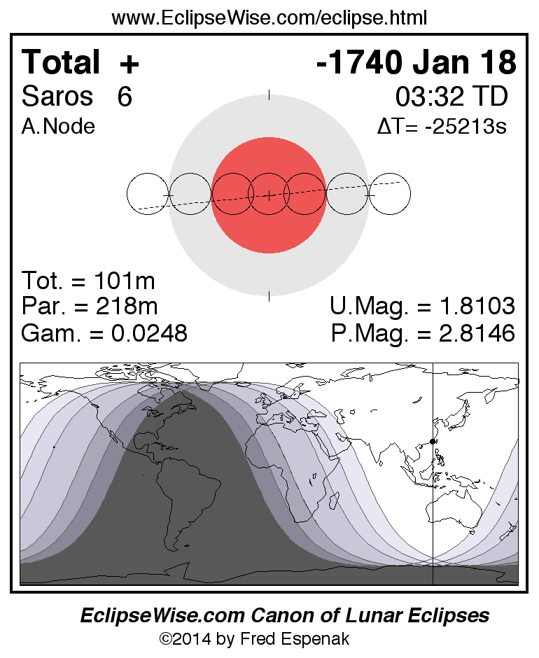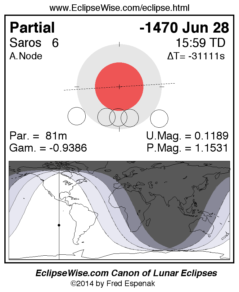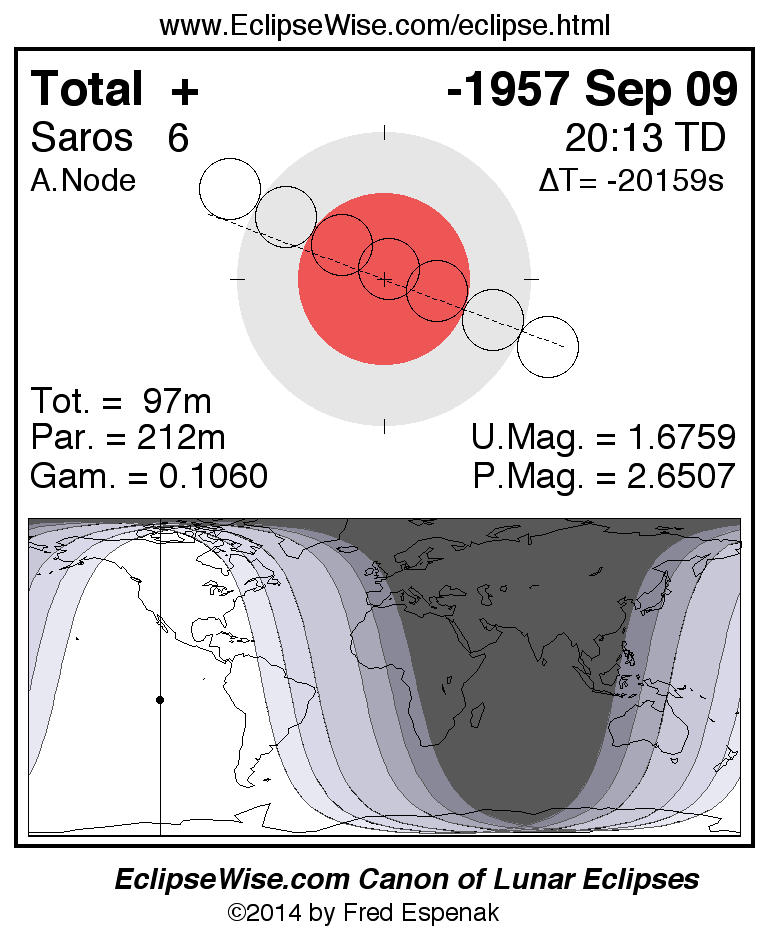 A panorama of all lunar eclipses belonging to Saros 6 is presented here. Each figure shows the Moon's path with respect to Earth's penumbral and umbral shadows. Below the path is a map depicting the geographic region of visibility for the eclipse. The date and time are given for the instant of Greatest Eclipse. Every figure serves as a hyperlink to the EclipseWise Prime page for that eclipse with a larger figure and complete details for the eclipse. Visit the Key to Lunar Eclipse Figures for a detailed explanation of these diagrams. Near the bottom of this page are a series of hyperlinks for more on lunar eclipses.