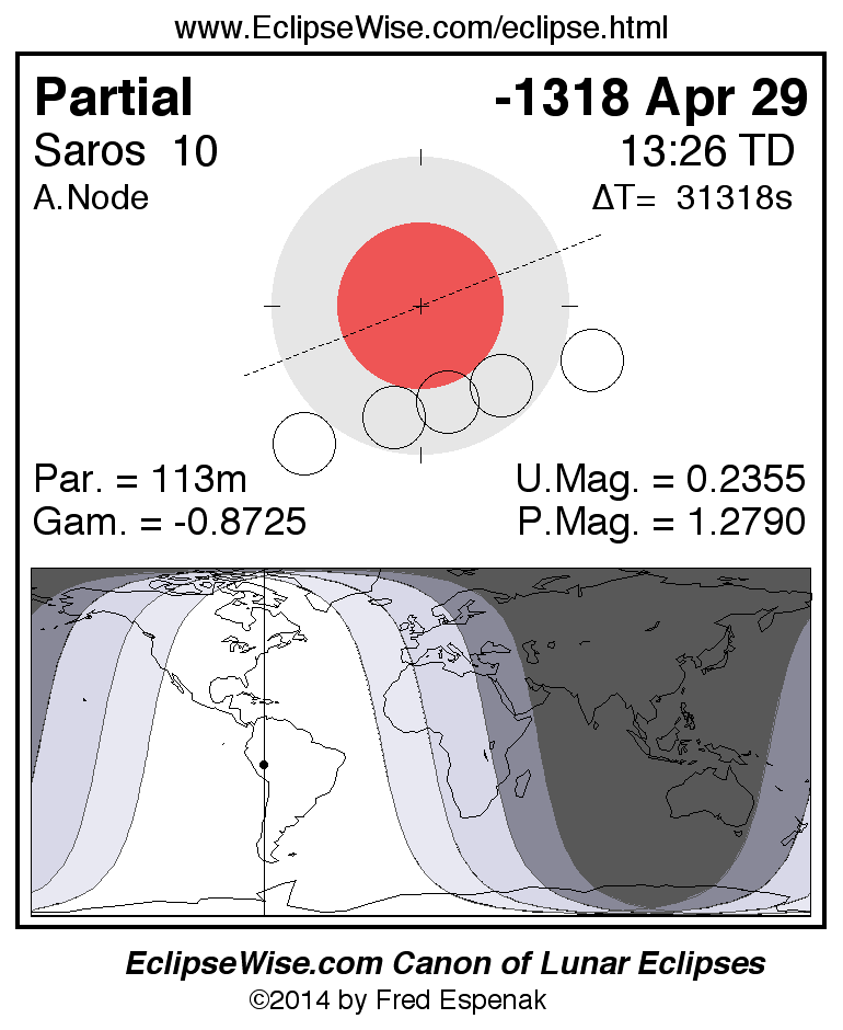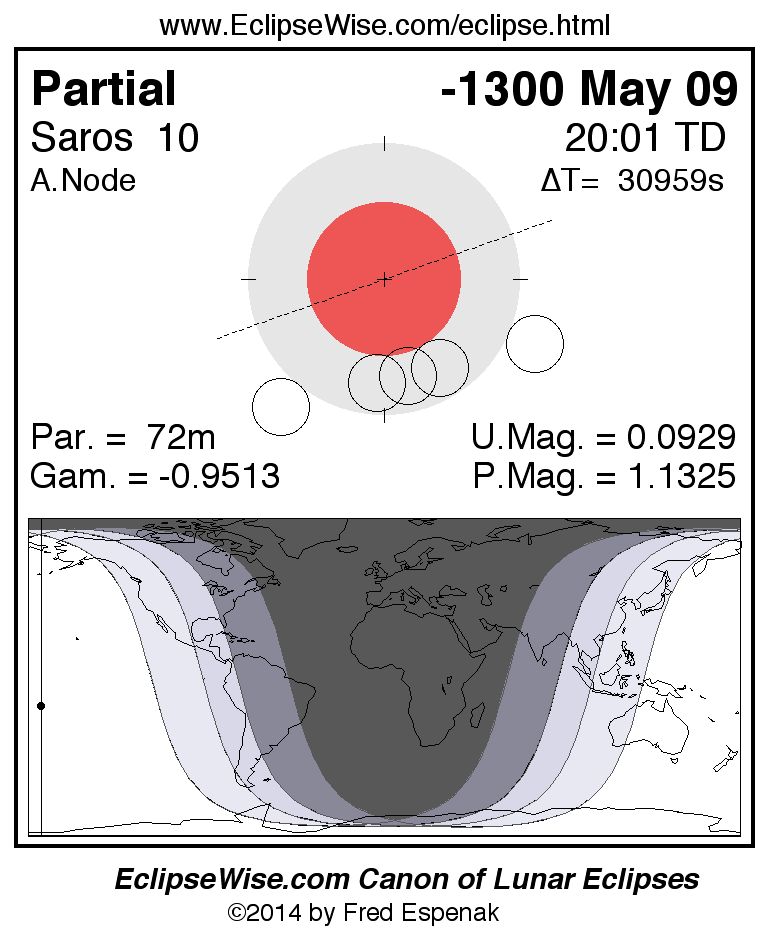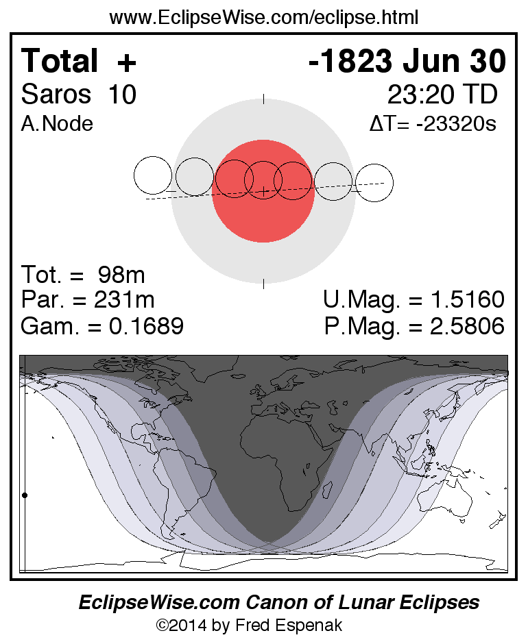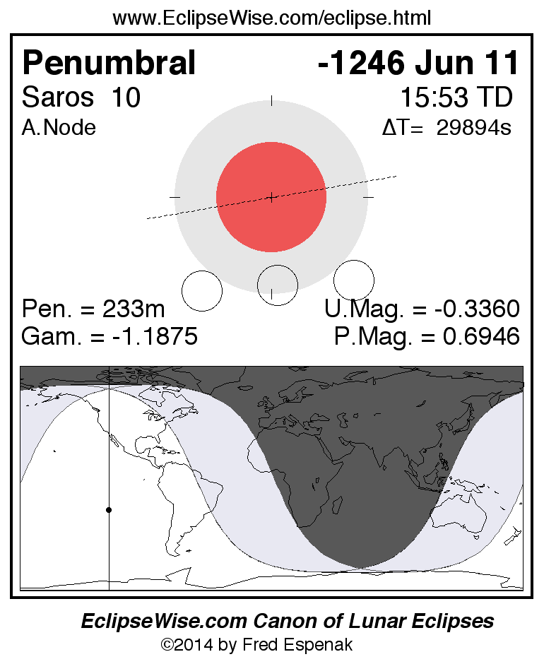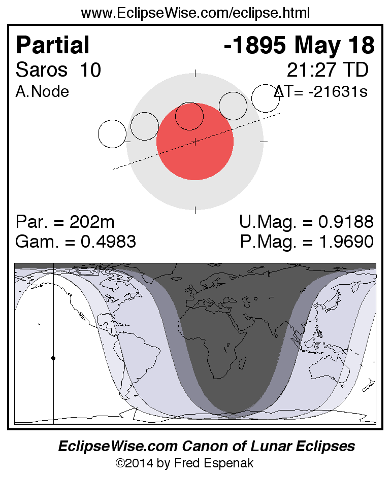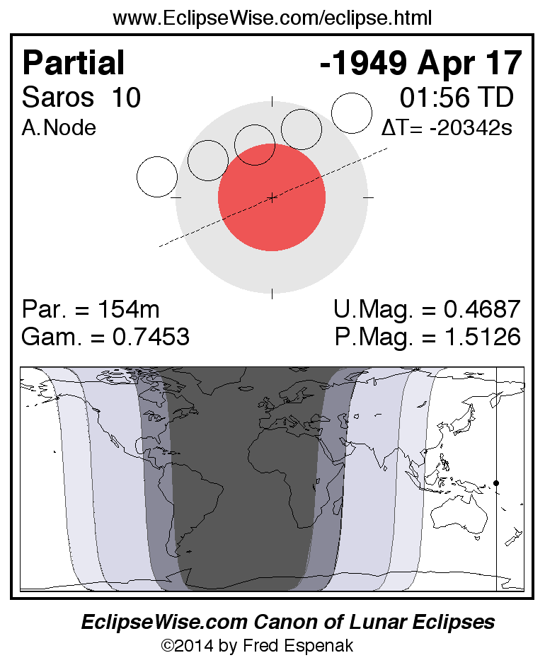 A panorama of all lunar eclipses belonging to Saros 10 is presented here. Each figure shows the Moon's path with respect to Earth's penumbral and umbral shadows. Below the path is a map depicting the geographic region of visibility for the eclipse. The date and time are given for the instant of Greatest Eclipse. Every figure serves as a hyperlink to the EclipseWise Prime page for that eclipse with a larger figure and complete details for the eclipse. Visit the Key to Lunar Eclipse Figures for a detailed explanation of these diagrams. Near the bottom of this page are a series of hyperlinks for more on lunar eclipses.