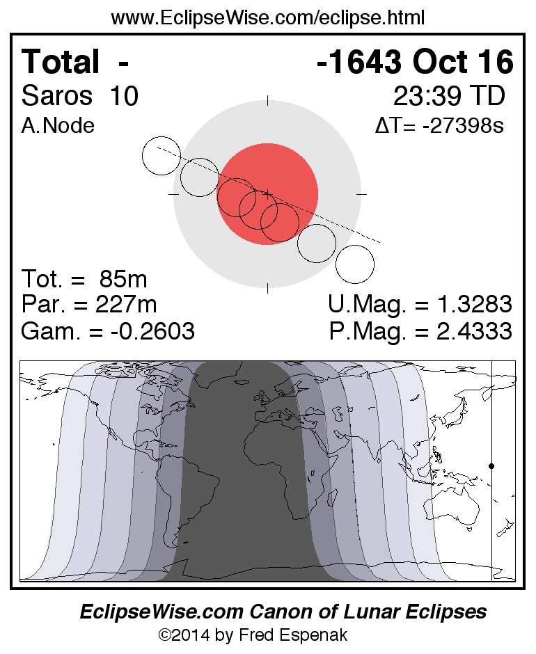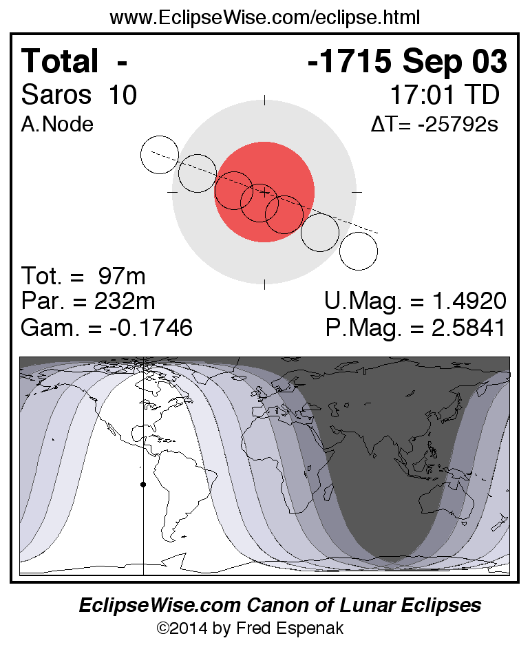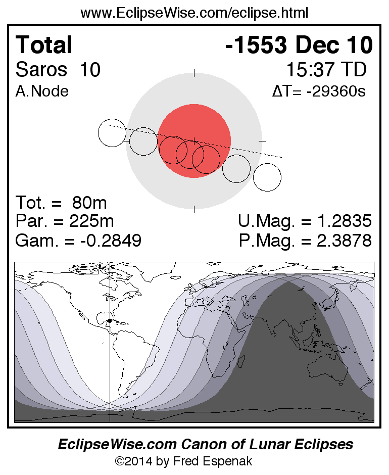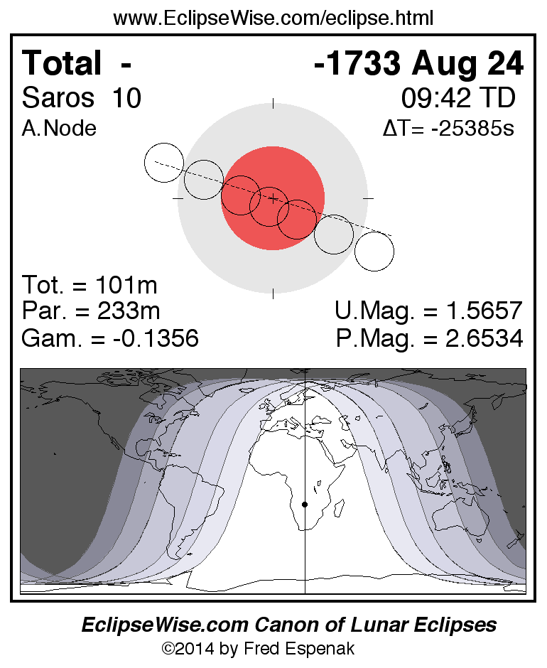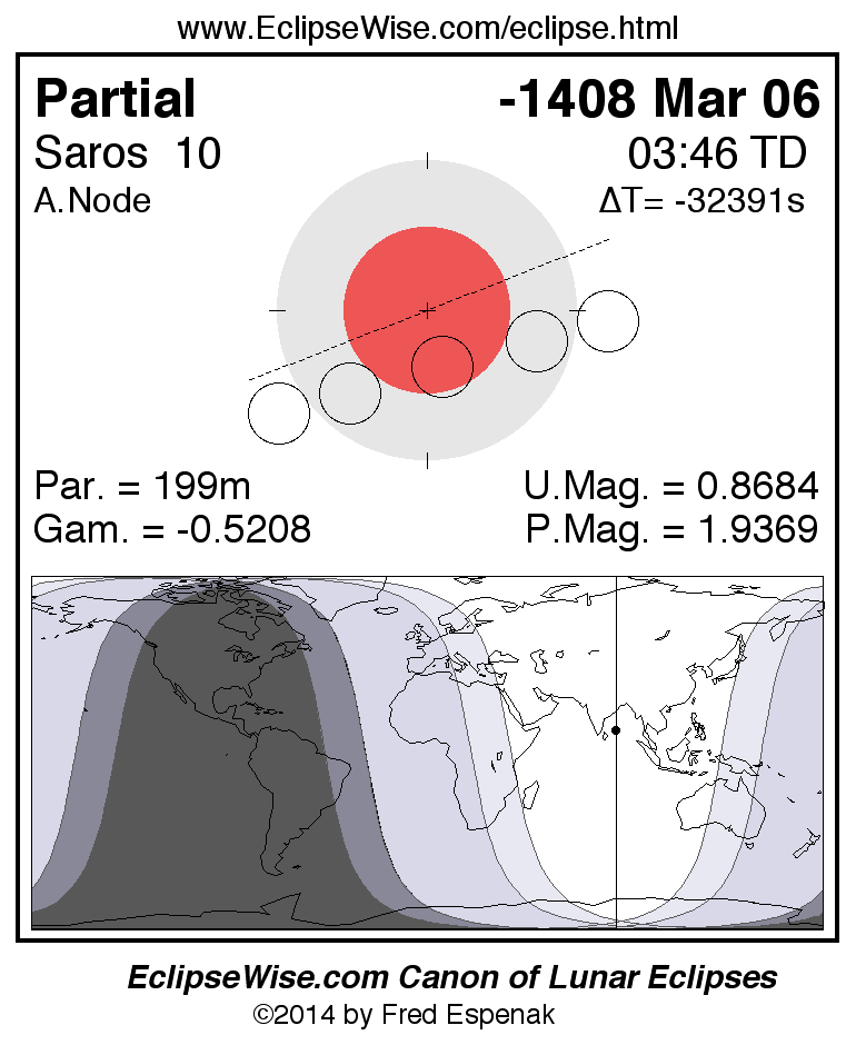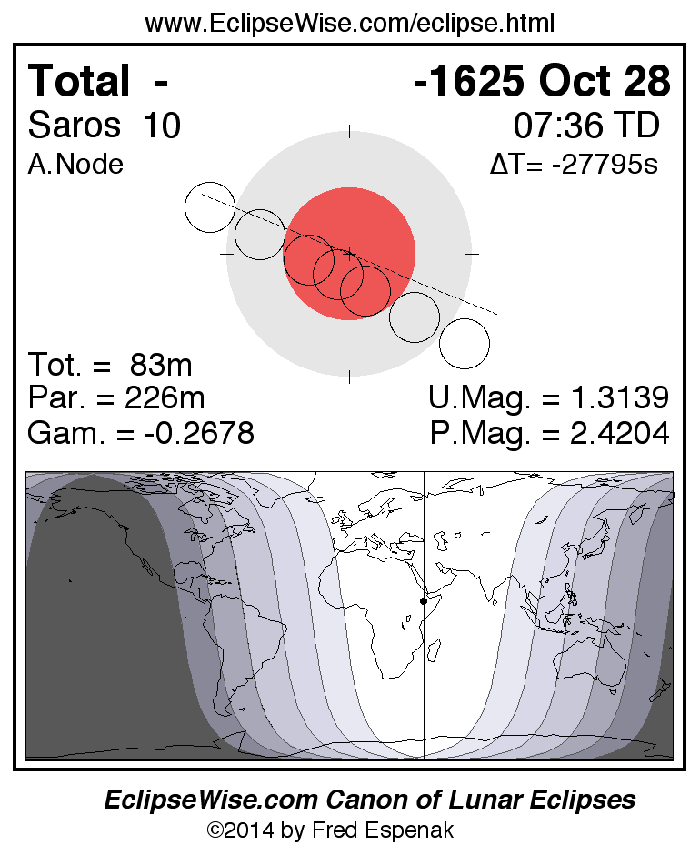 A panorama of all lunar eclipses belonging to Saros 10 is presented here. Each figure shows the Moon's path with respect to Earth's penumbral and umbral shadows. Below the path is a map depicting the geographic region of visibility for the eclipse. The date and time are given for the instant of Greatest Eclipse. Every figure serves as a hyperlink to the EclipseWise Prime page for that eclipse with a larger figure and complete details for the eclipse. Visit the Key to Lunar Eclipse Figures for a detailed explanation of these diagrams. Near the bottom of this page are a series of hyperlinks for more on lunar eclipses.