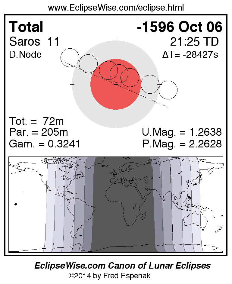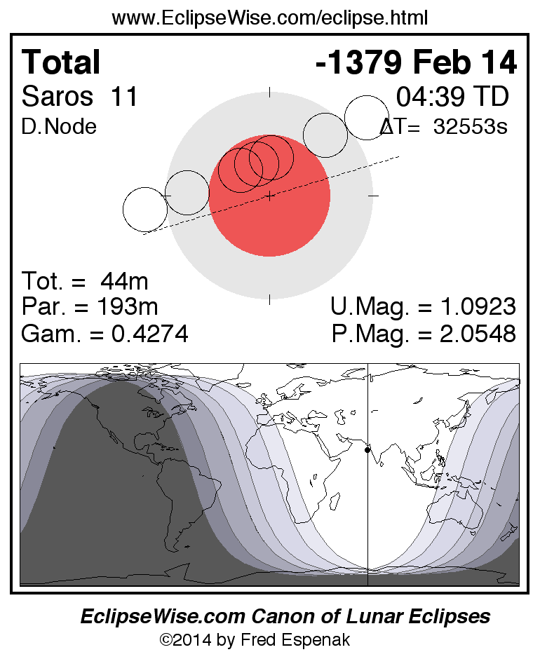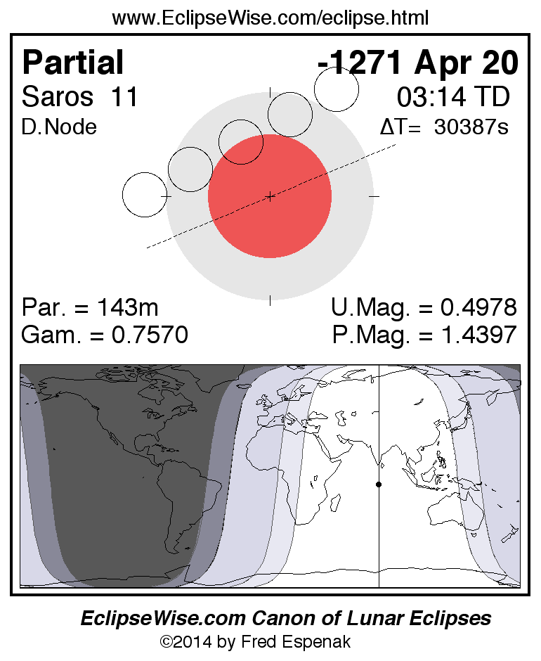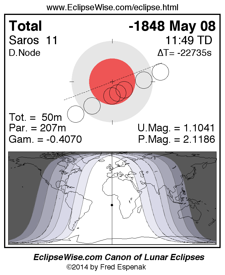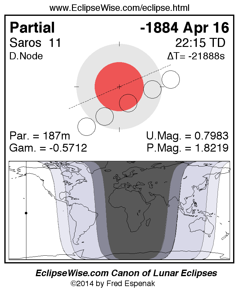 A panorama of all lunar eclipses belonging to Saros 11 is presented here. Each figure shows the Moon's path with respect to Earth's penumbral and umbral shadows. Below the path is a map depicting the geographic region of visibility for the eclipse. The date and time are given for the instant of Greatest Eclipse. Every figure serves as a hyperlink to the EclipseWise Prime page for that eclipse with a larger figure and complete details for the eclipse. Visit the Key to Lunar Eclipse Figures for a detailed explanation of these diagrams. Near the bottom of this page are a series of hyperlinks for more on lunar eclipses.