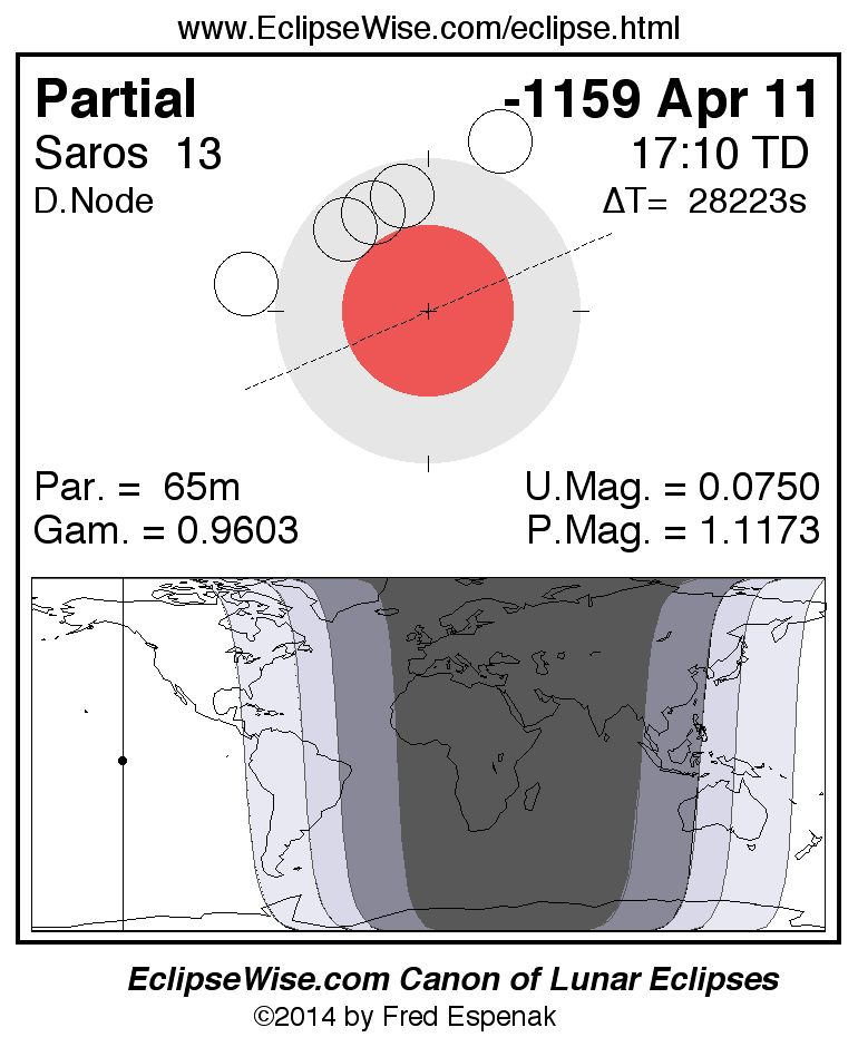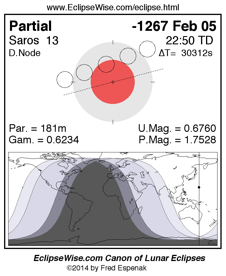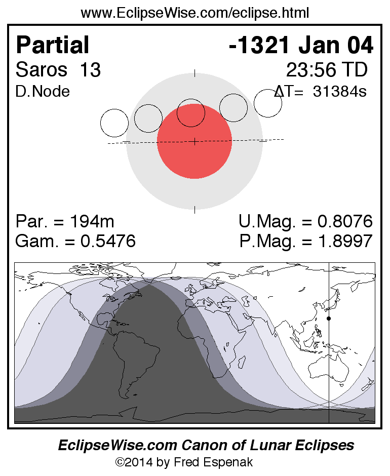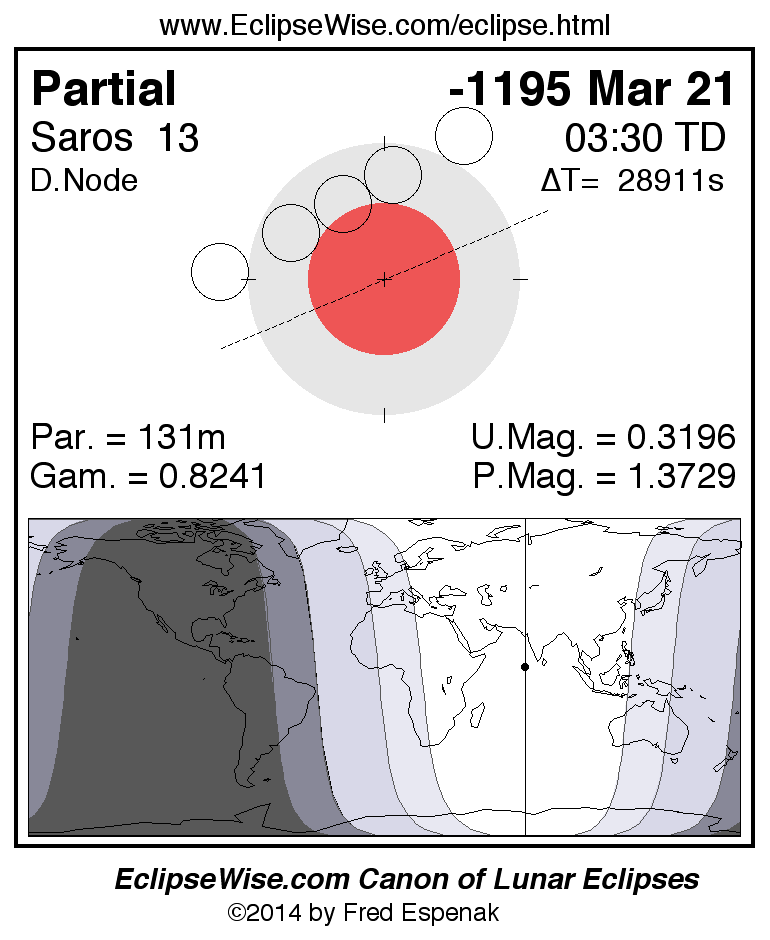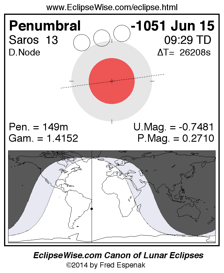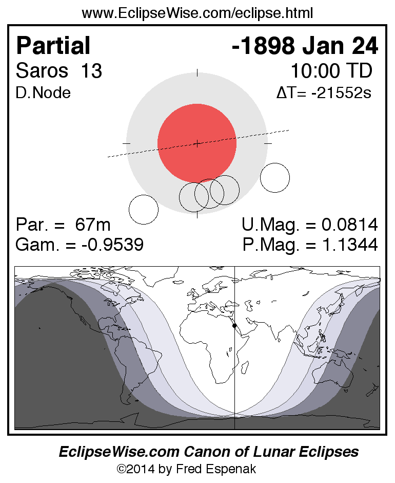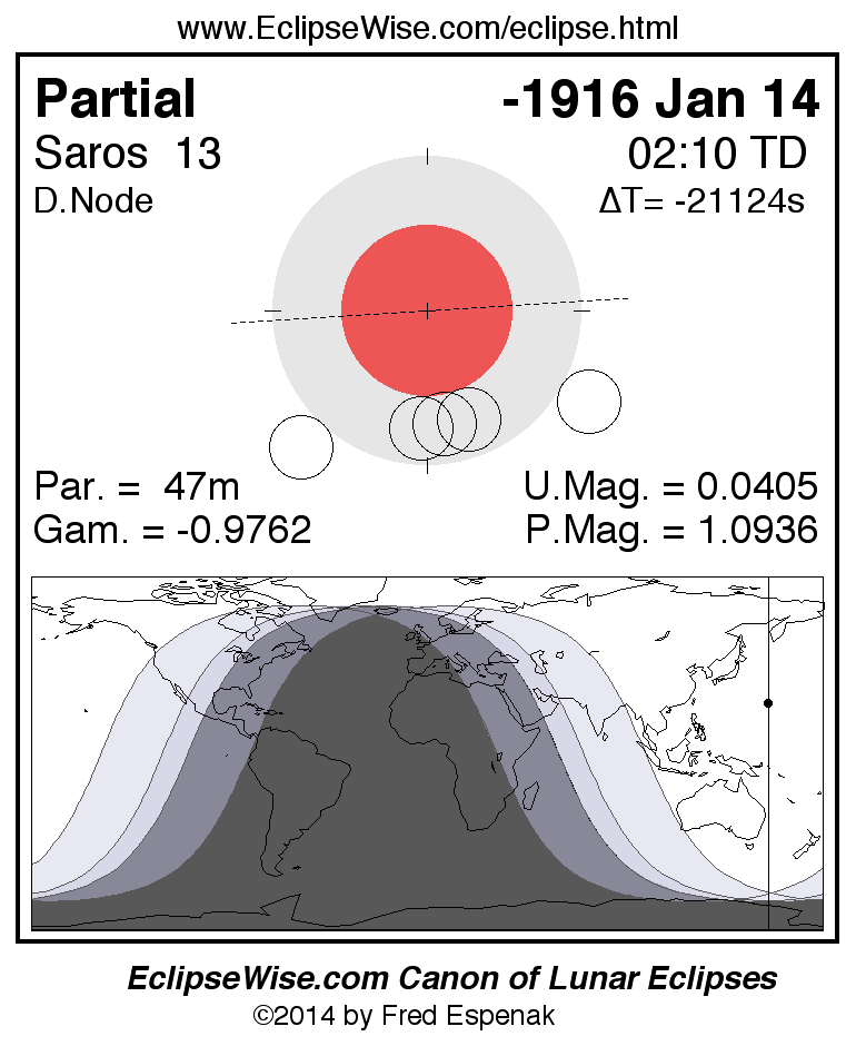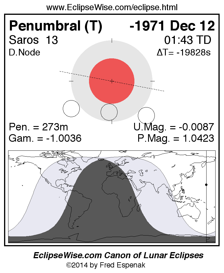 A panorama of all lunar eclipses belonging to Saros 13 is presented here. Each figure shows the Moon's path with respect to Earth's penumbral and umbral shadows. Below the path is a map depicting the geographic region of visibility for the eclipse. The date and time are given for the instant of Greatest Eclipse. Every figure serves as a hyperlink to the EclipseWise Prime page for that eclipse with a larger figure and complete details for the eclipse. Visit the Key to Lunar Eclipse Figures for a detailed explanation of these diagrams. Near the bottom of this page are a series of hyperlinks for more on lunar eclipses.