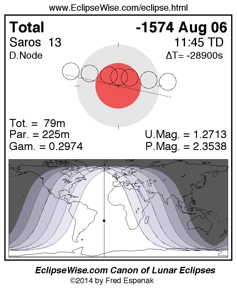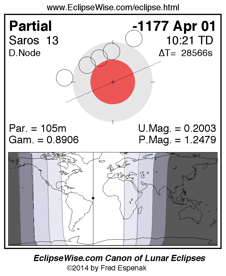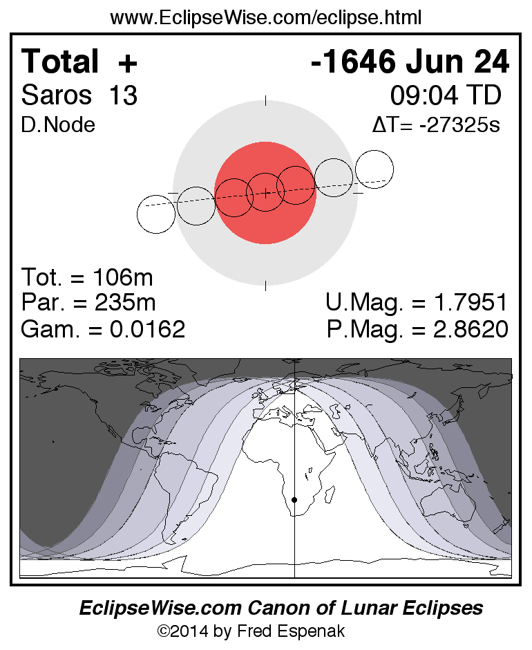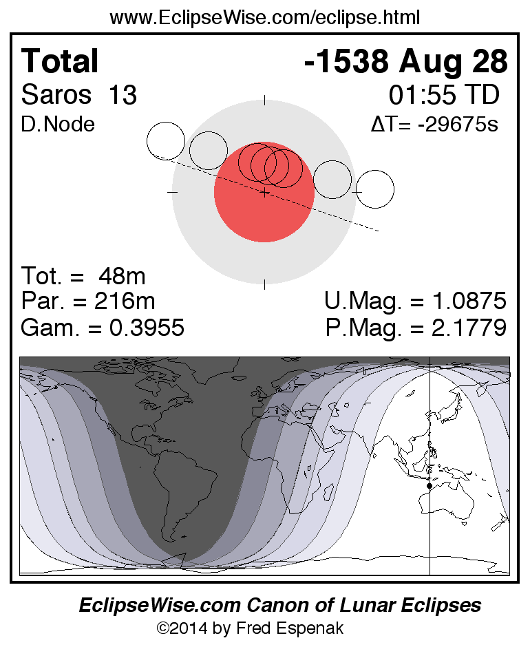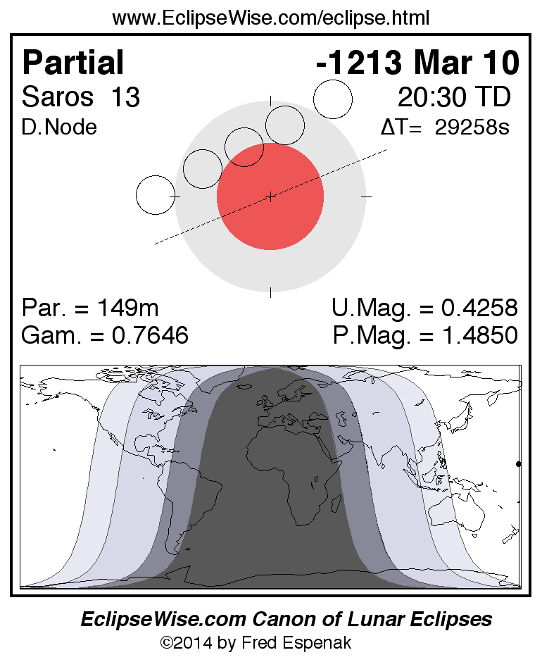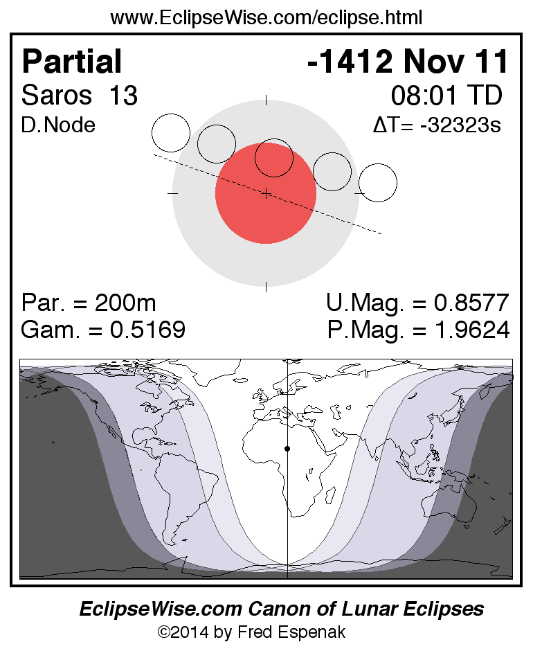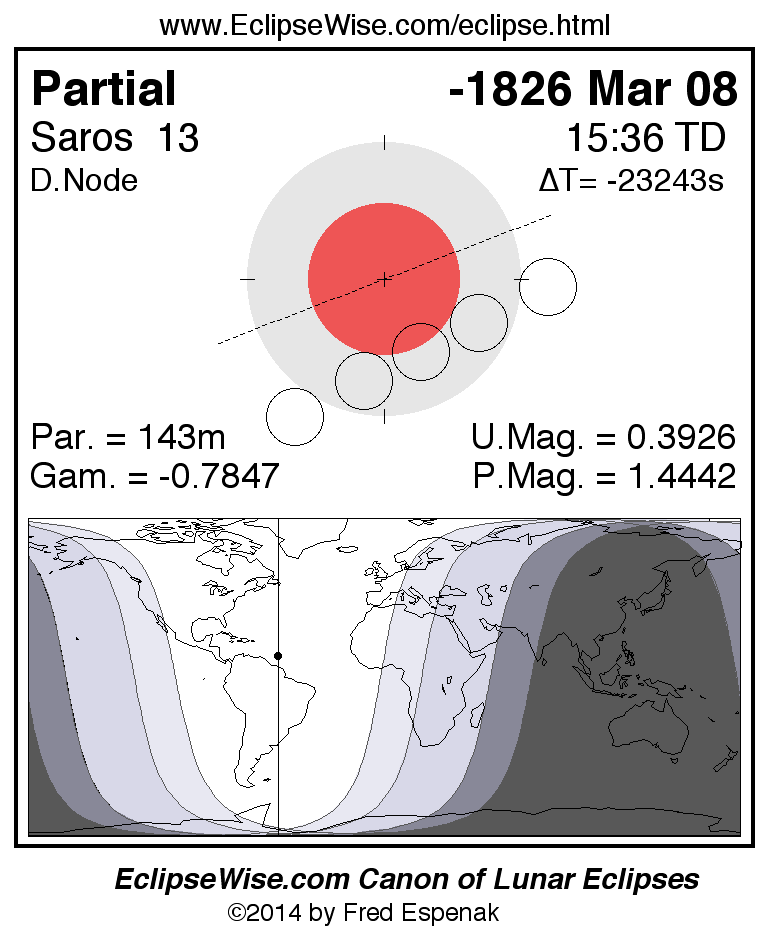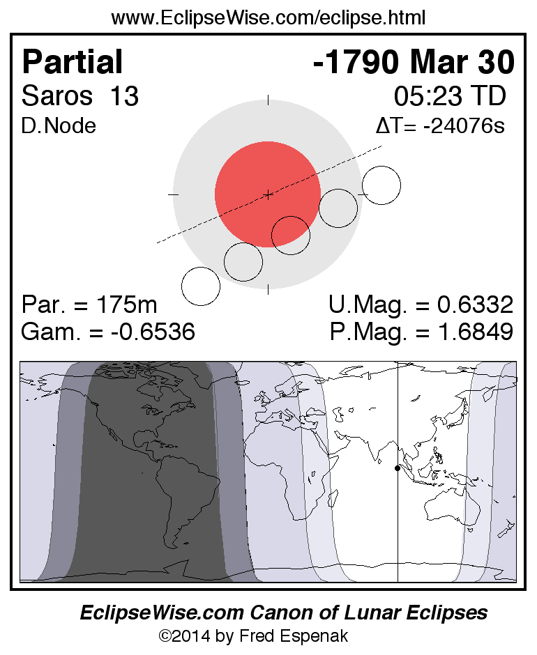 A panorama of all lunar eclipses belonging to Saros 13 is presented here. Each figure shows the Moon's path with respect to Earth's penumbral and umbral shadows. Below the path is a map depicting the geographic region of visibility for the eclipse. The date and time are given for the instant of Greatest Eclipse. Every figure serves as a hyperlink to the EclipseWise Prime page for that eclipse with a larger figure and complete details for the eclipse. Visit the Key to Lunar Eclipse Figures for a detailed explanation of these diagrams. Near the bottom of this page are a series of hyperlinks for more on lunar eclipses.