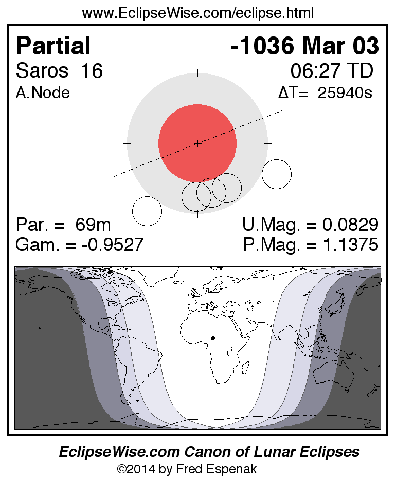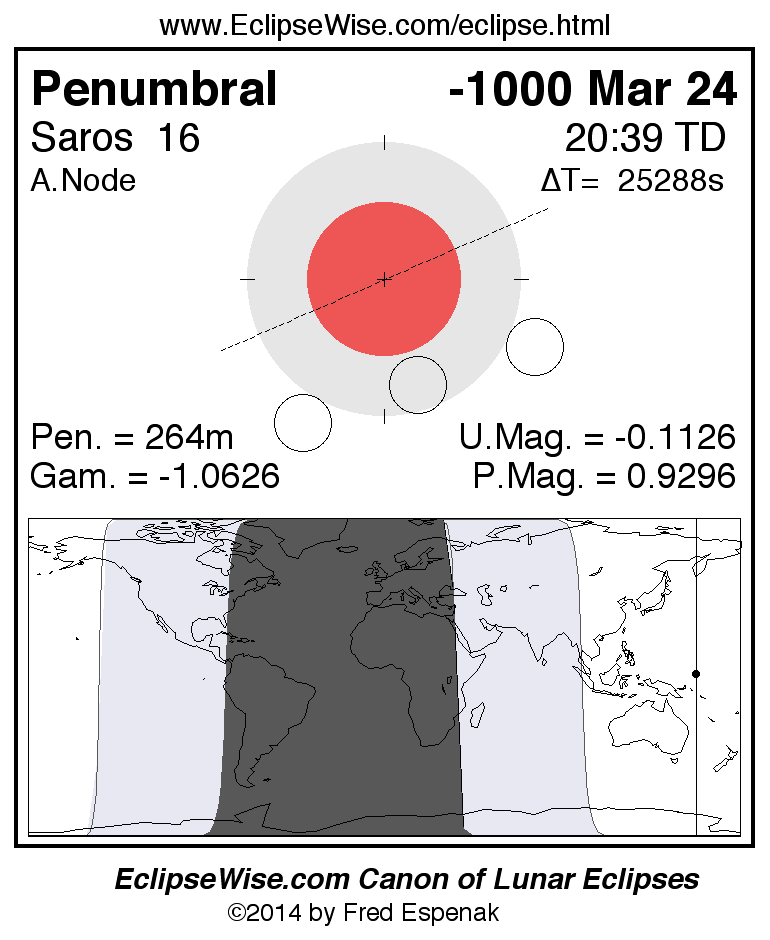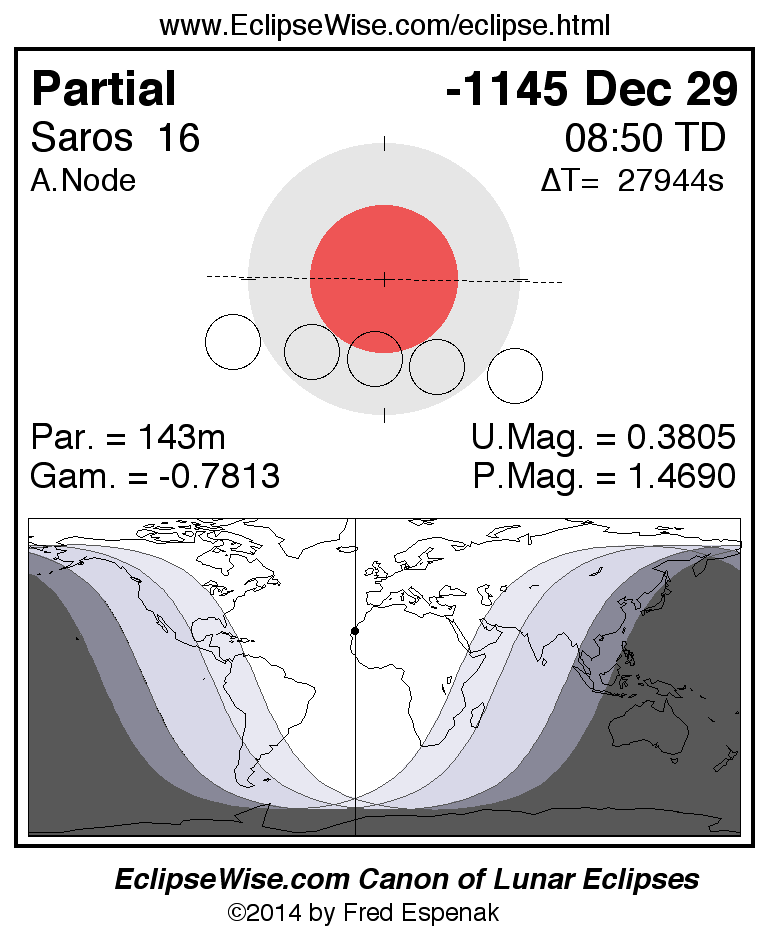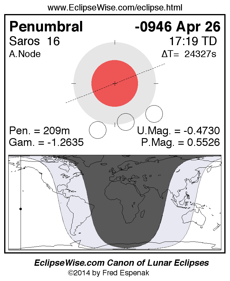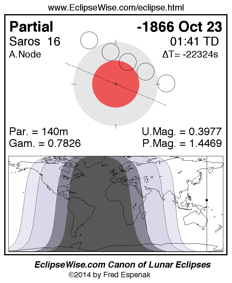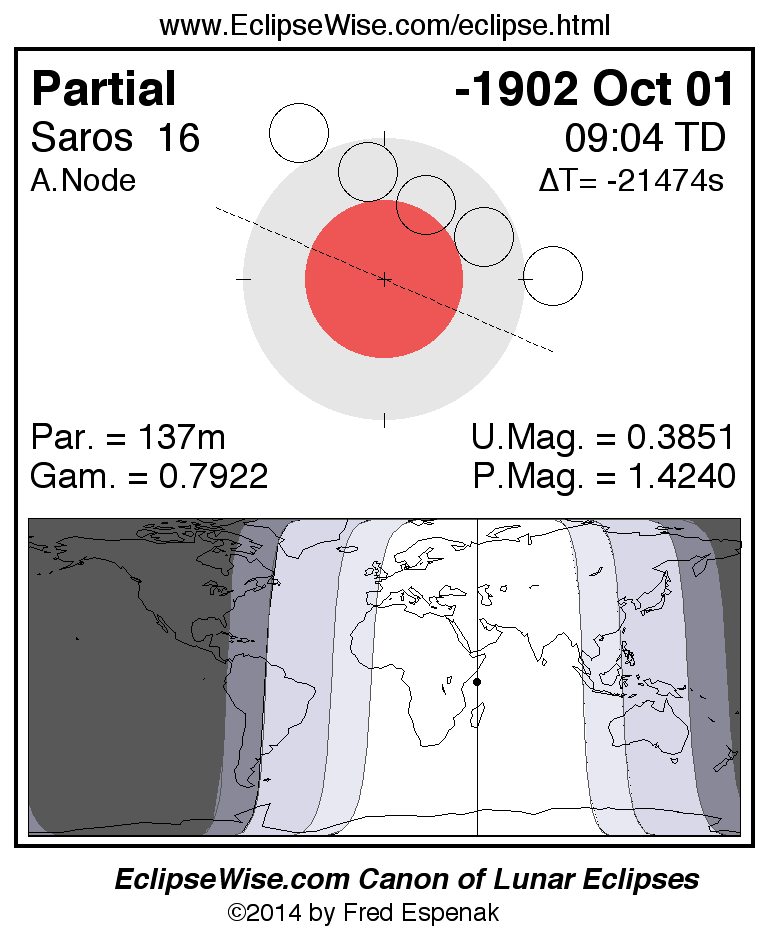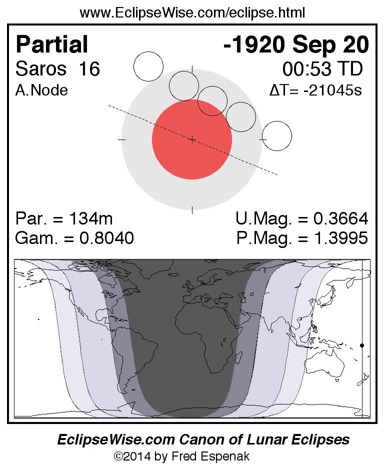 A panorama of all lunar eclipses belonging to Saros 16 is presented here. Each figure shows the Moon's path with respect to Earth's penumbral and umbral shadows. Below the path is a map depicting the geographic region of visibility for the eclipse. The date and time are given for the instant of Greatest Eclipse. Every figure serves as a hyperlink to the EclipseWise Prime page for that eclipse with a larger figure and complete details for the eclipse. Visit the Key to Lunar Eclipse Figures for a detailed explanation of these diagrams. Near the bottom of this page are a series of hyperlinks for more on lunar eclipses.