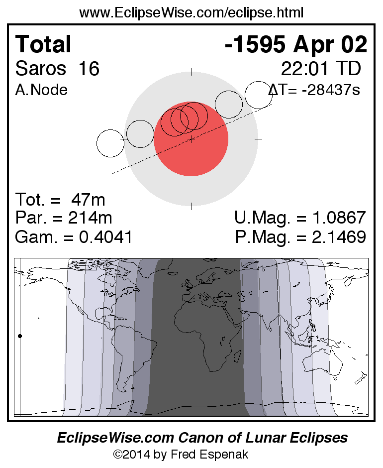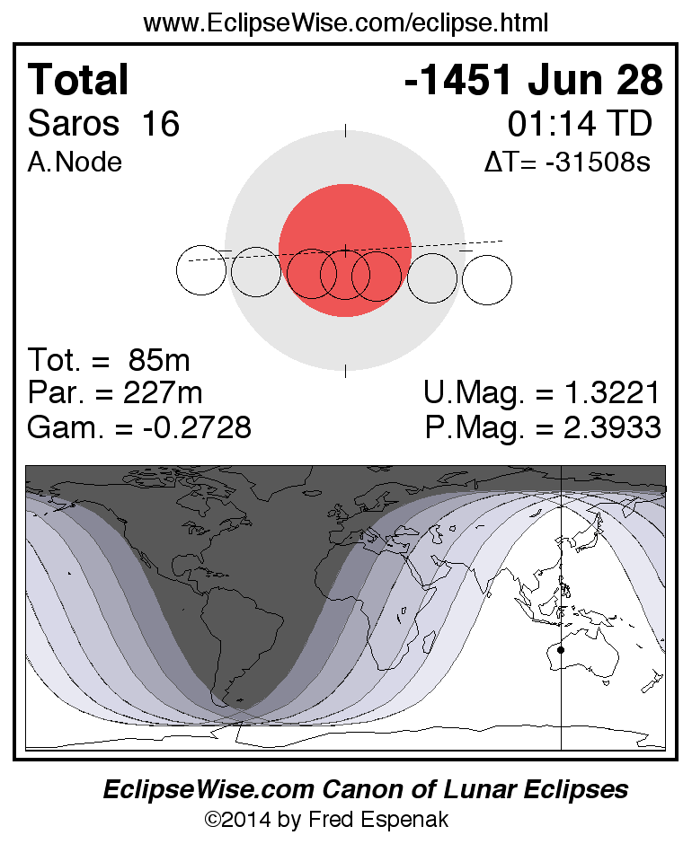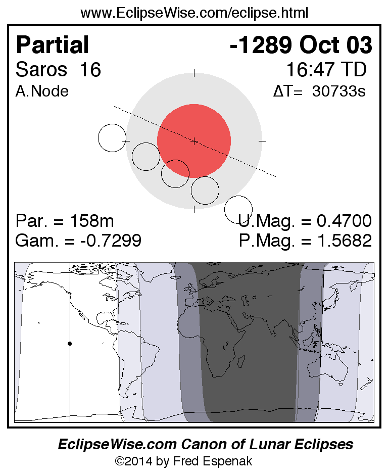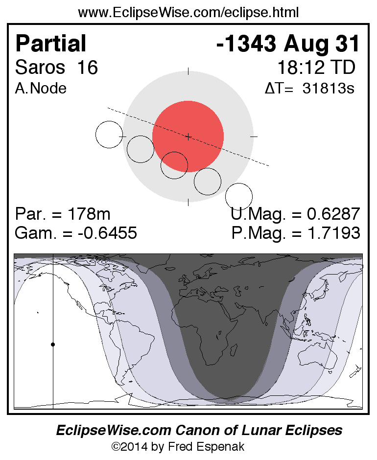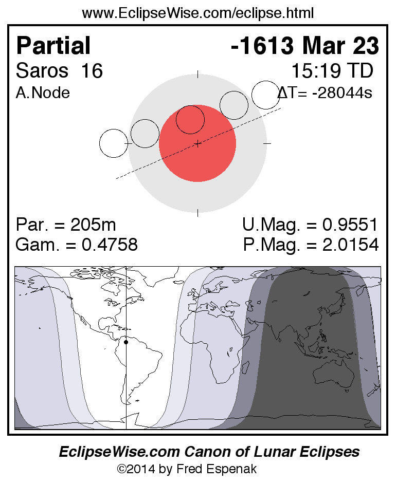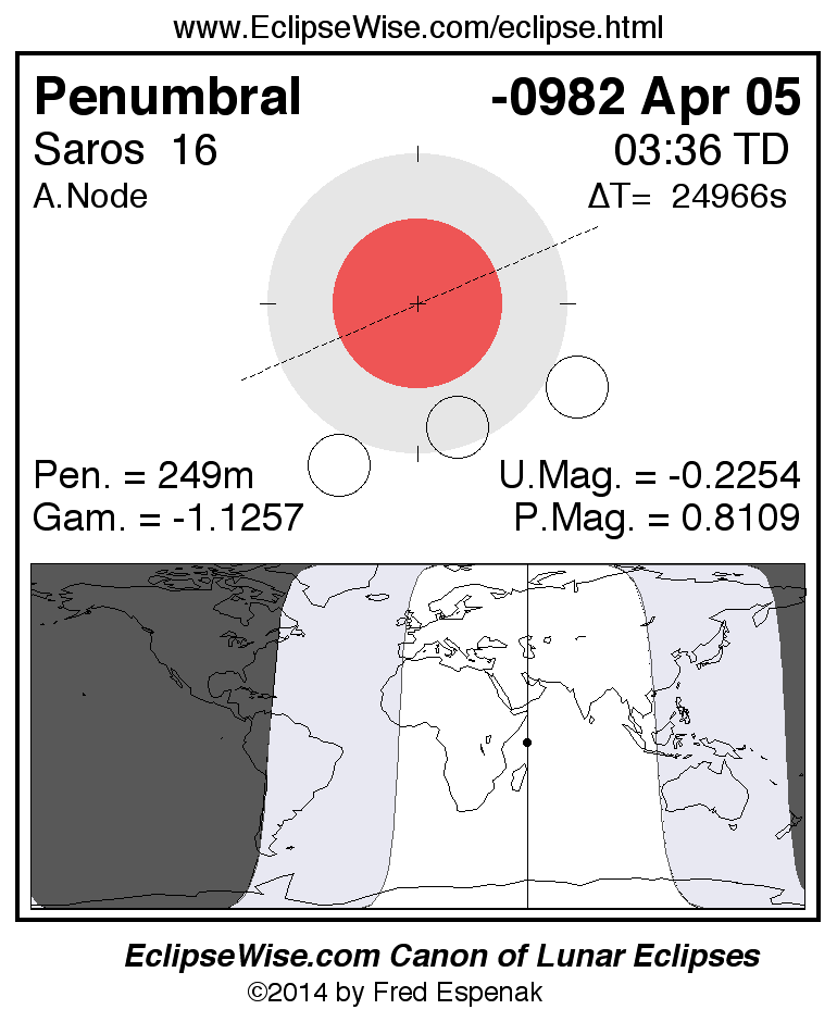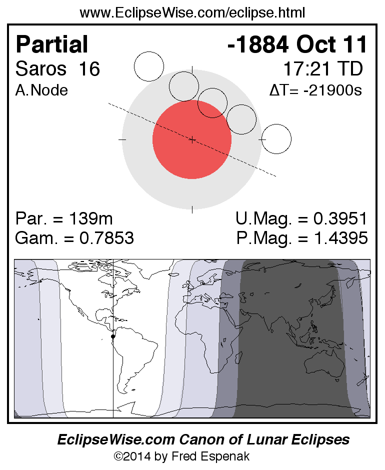 A panorama of all lunar eclipses belonging to Saros 16 is presented here. Each figure shows the Moon's path with respect to Earth's penumbral and umbral shadows. Below the path is a map depicting the geographic region of visibility for the eclipse. The date and time are given for the instant of Greatest Eclipse. Every figure serves as a hyperlink to the EclipseWise Prime page for that eclipse with a larger figure and complete details for the eclipse. Visit the Key to Lunar Eclipse Figures for a detailed explanation of these diagrams. Near the bottom of this page are a series of hyperlinks for more on lunar eclipses.