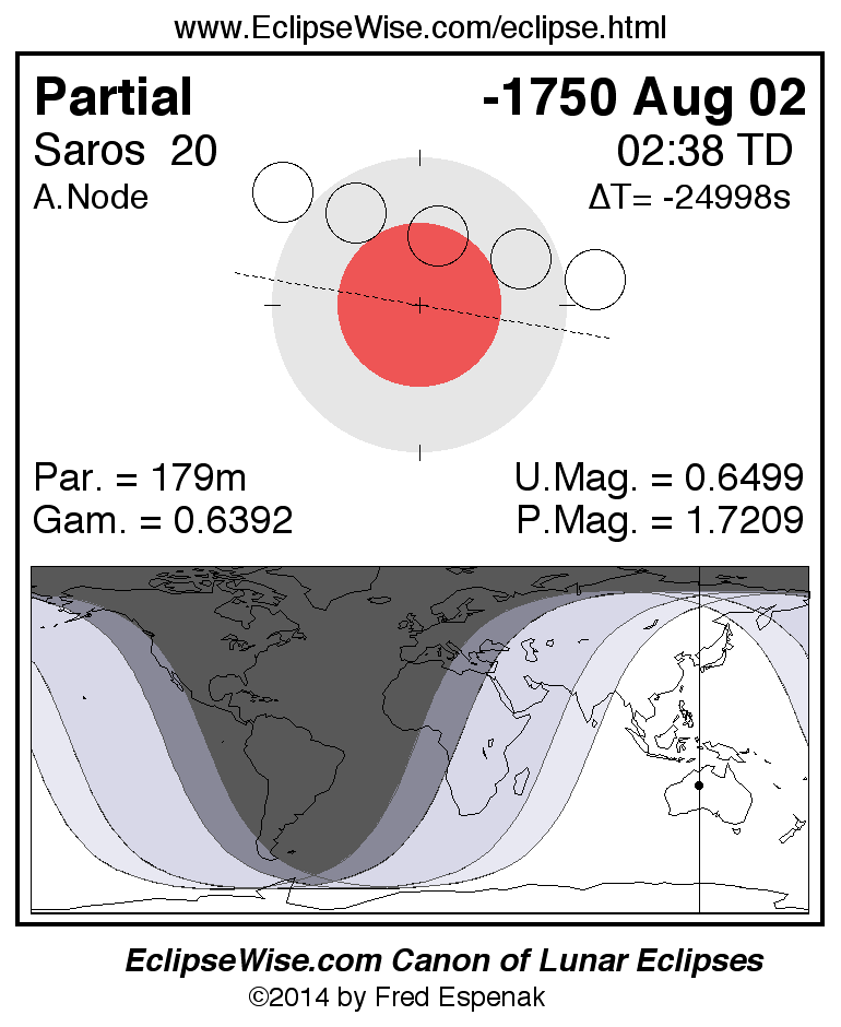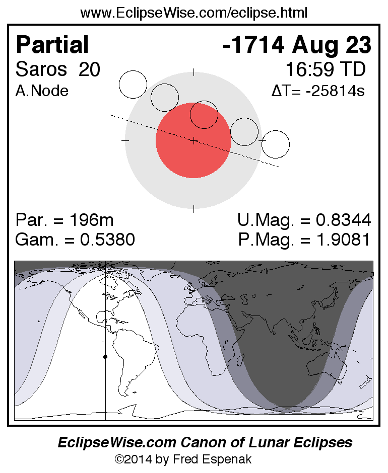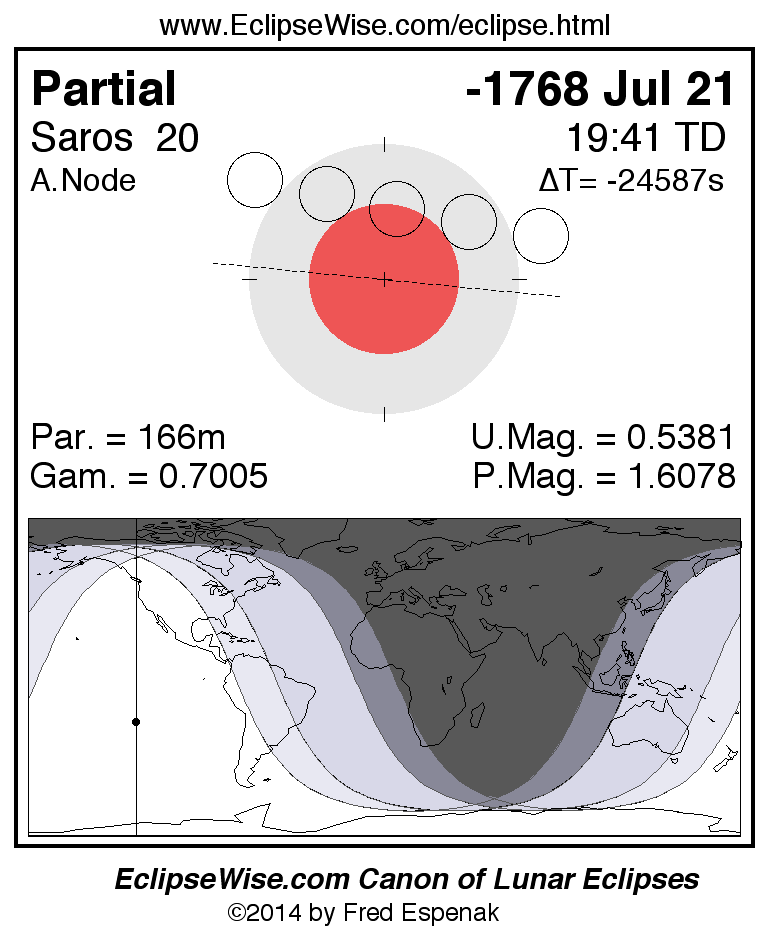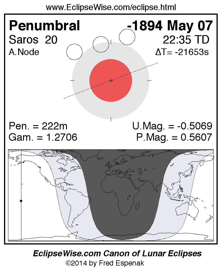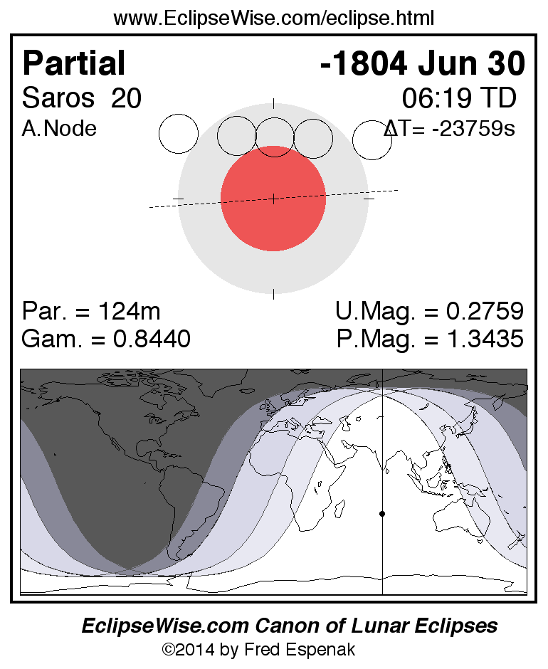 A panorama of all lunar eclipses belonging to Saros 20 is presented here. Each figure shows the Moon's path with respect to Earth's penumbral and umbral shadows. Below the path is a map depicting the geographic region of visibility for the eclipse. The date and time are given for the instant of Greatest Eclipse. Every figure serves as a hyperlink to the EclipseWise Prime page for that eclipse with a larger figure and complete details for the eclipse. Visit the Key to Lunar Eclipse Figures for a detailed explanation of these diagrams. Near the bottom of this page are a series of hyperlinks for more on lunar eclipses.