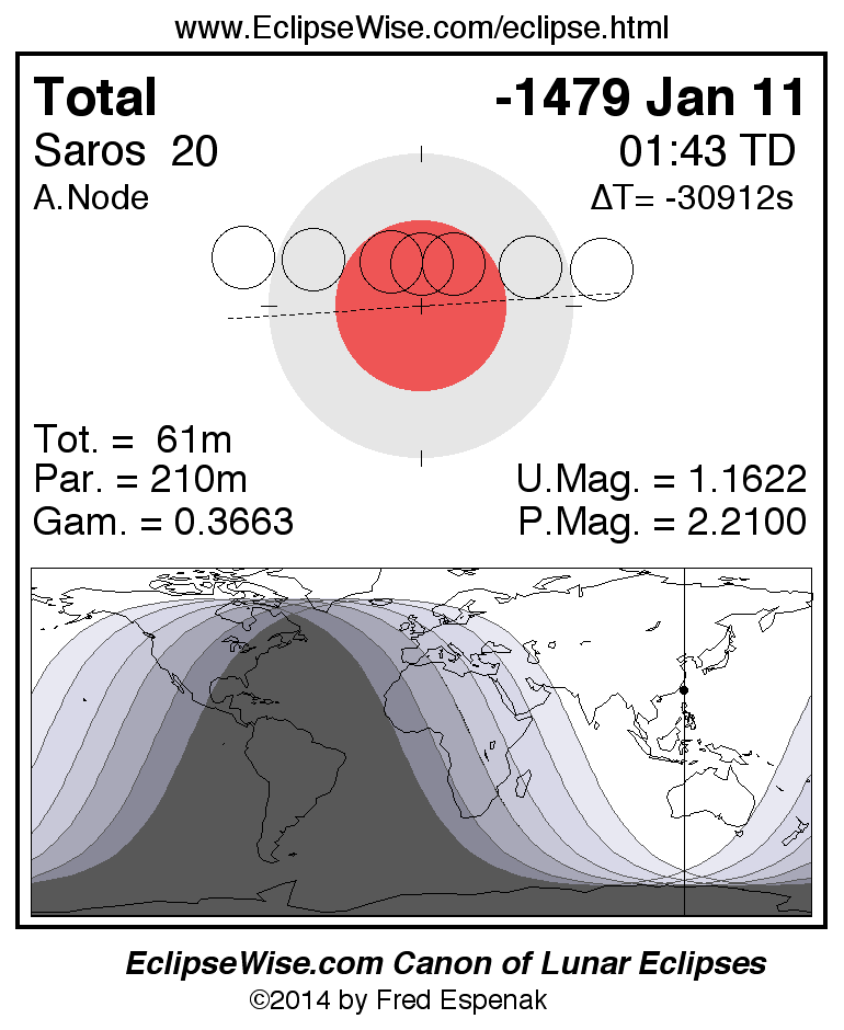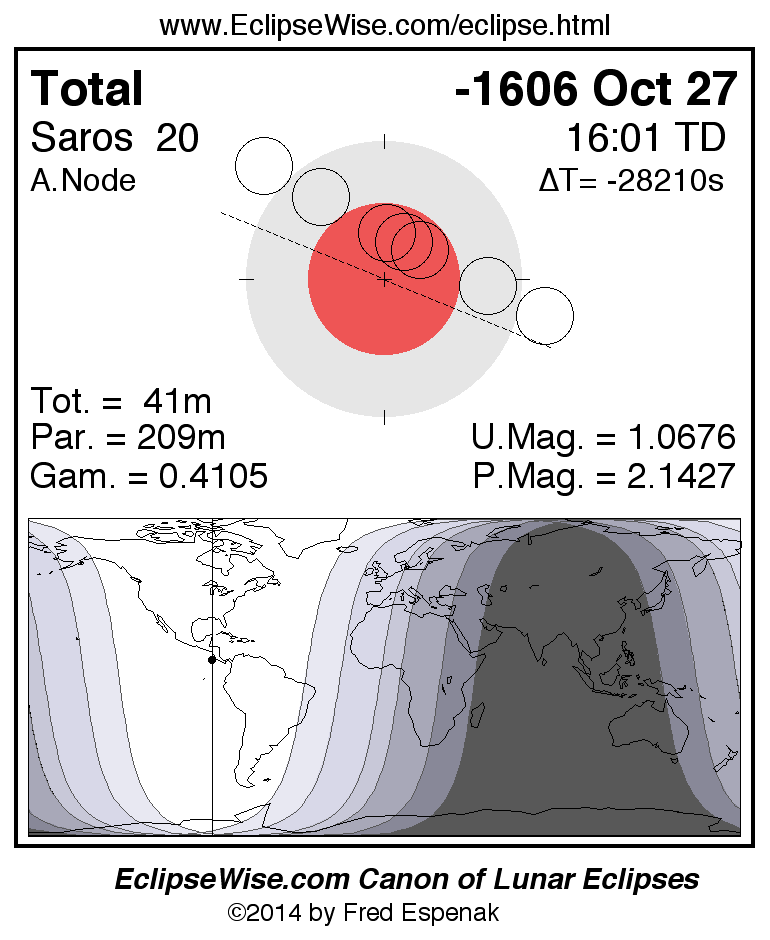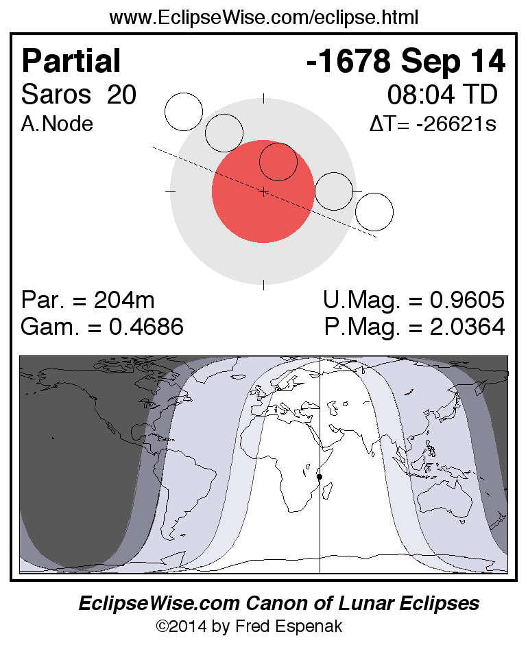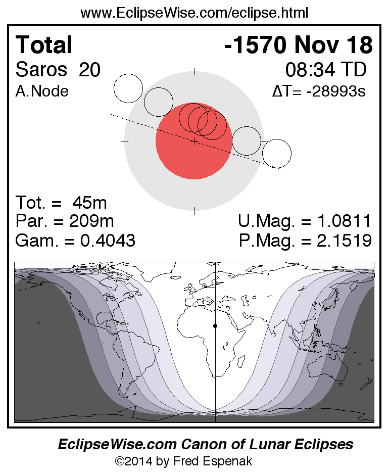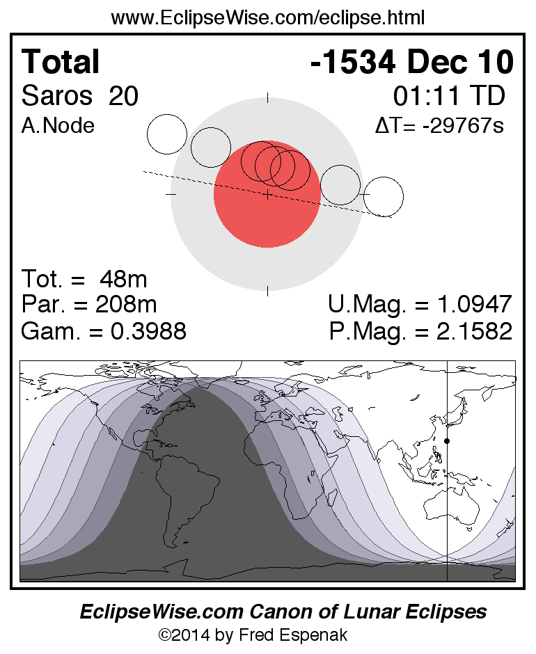 A panorama of all lunar eclipses belonging to Saros 20 is presented here. Each figure shows the Moon's path with respect to Earth's penumbral and umbral shadows. Below the path is a map depicting the geographic region of visibility for the eclipse. The date and time are given for the instant of Greatest Eclipse. Every figure serves as a hyperlink to the EclipseWise Prime page for that eclipse with a larger figure and complete details for the eclipse. Visit the Key to Lunar Eclipse Figures for a detailed explanation of these diagrams. Near the bottom of this page are a series of hyperlinks for more on lunar eclipses.