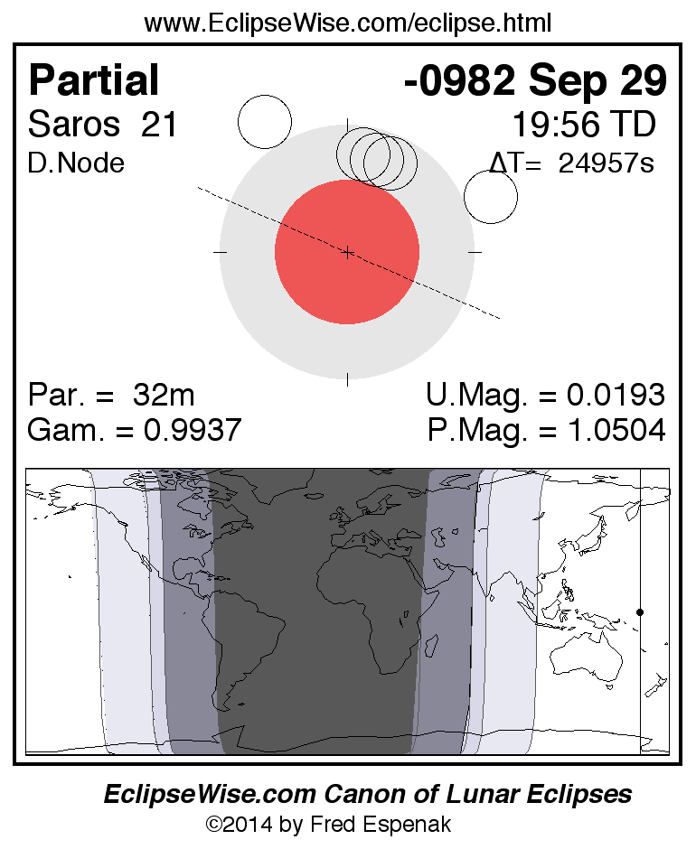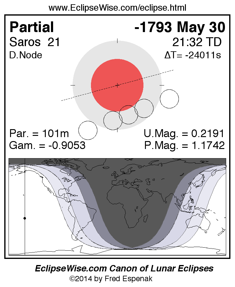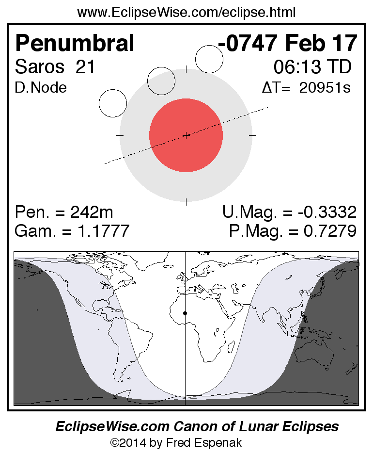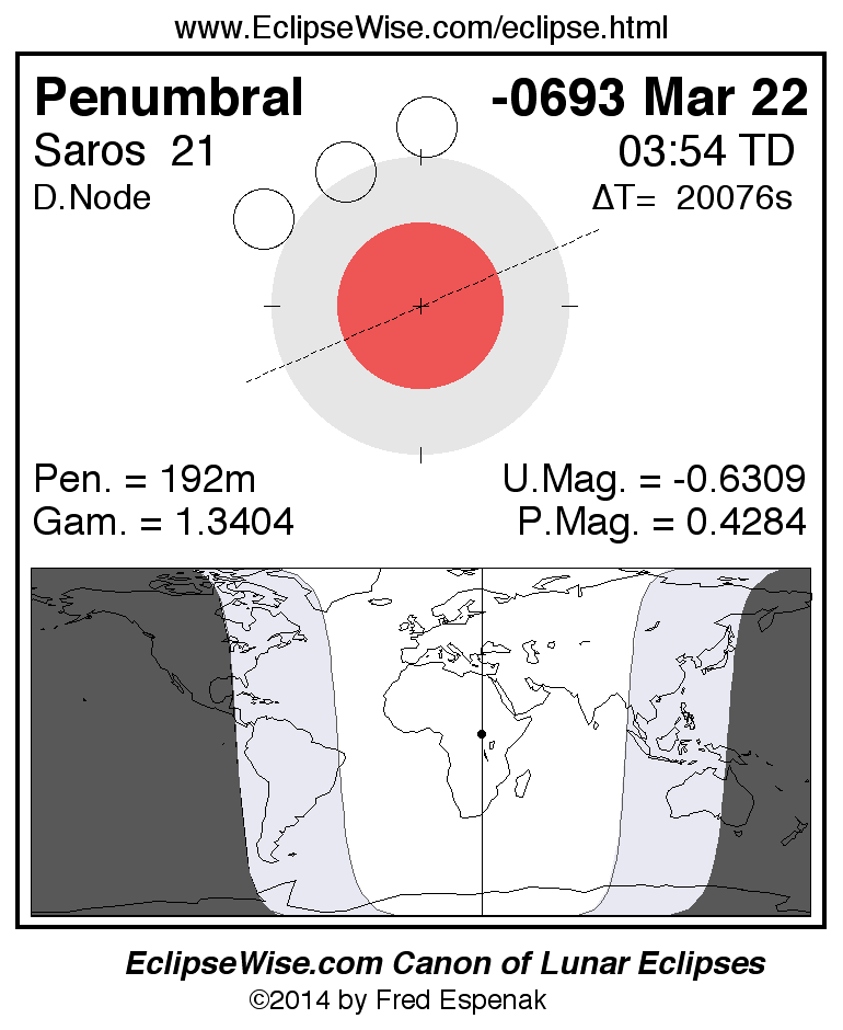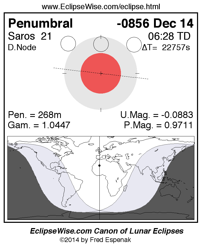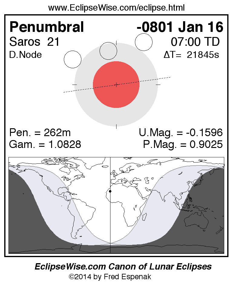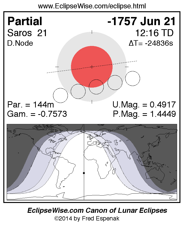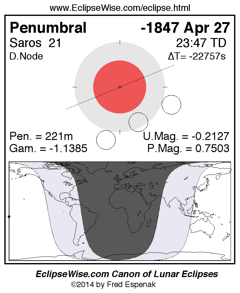 A panorama of all lunar eclipses belonging to Saros 21 is presented here. Each figure shows the Moon's path with respect to Earth's penumbral and umbral shadows. Below the path is a map depicting the geographic region of visibility for the eclipse. The date and time are given for the instant of Greatest Eclipse. Every figure serves as a hyperlink to the EclipseWise Prime page for that eclipse with a larger figure and complete details for the eclipse. Visit the Key to Lunar Eclipse Figures for a detailed explanation of these diagrams. Near the bottom of this page are a series of hyperlinks for more on lunar eclipses.
