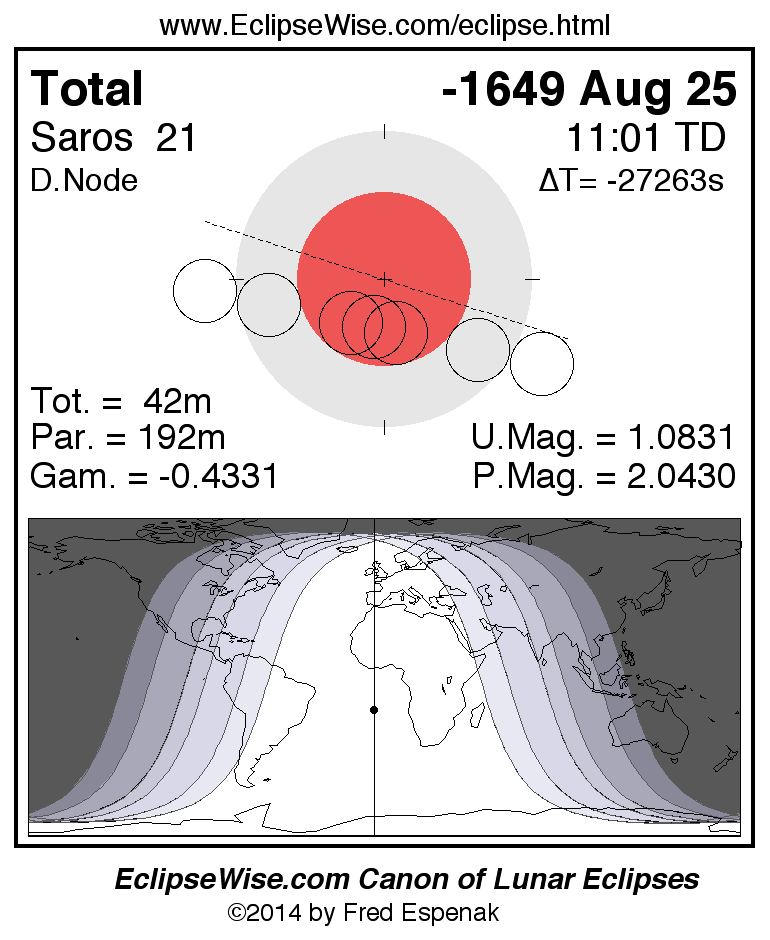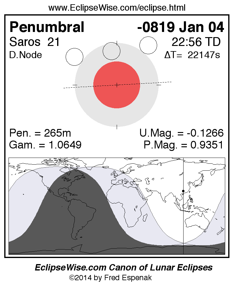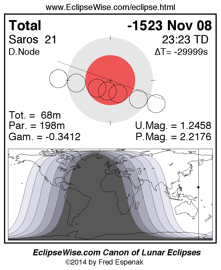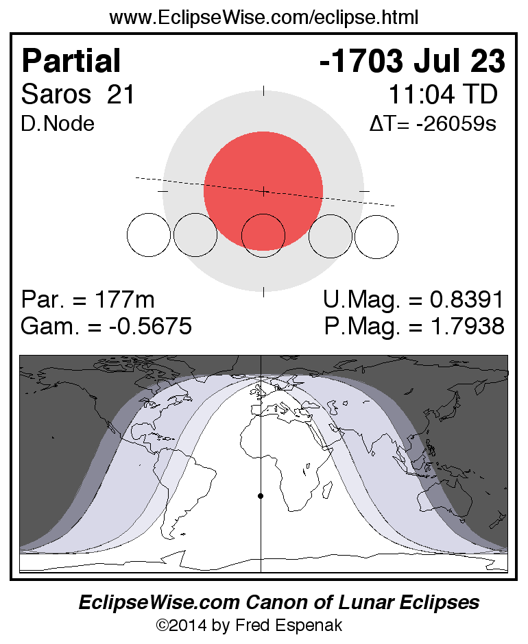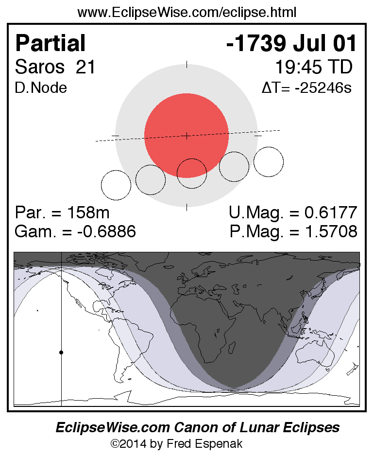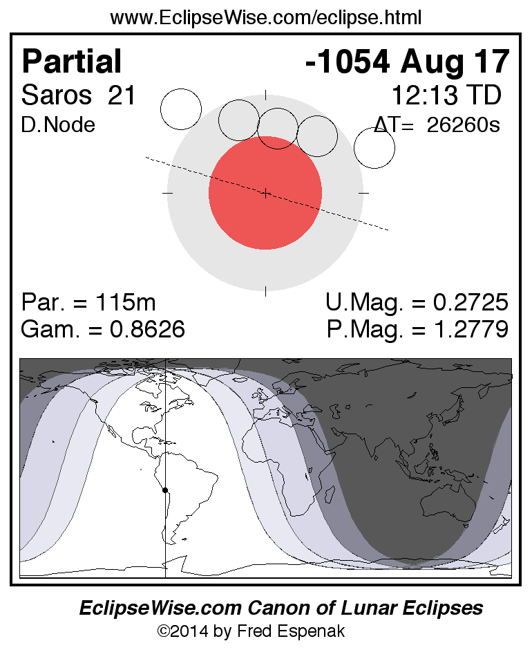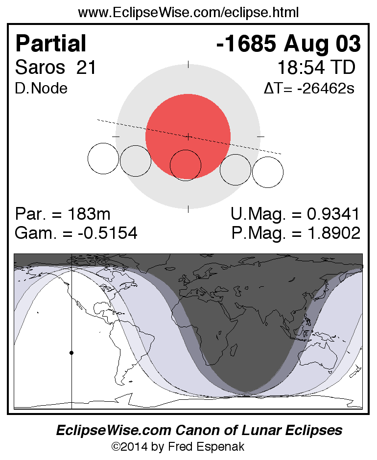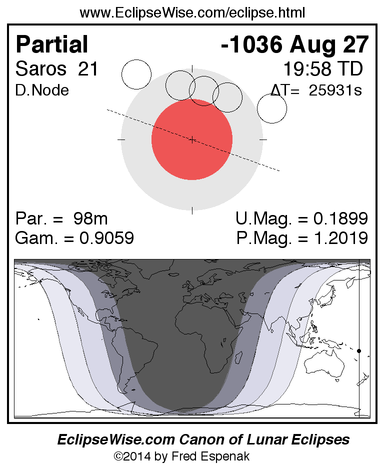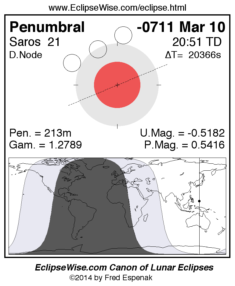A panorama of all lunar eclipses belonging to Saros 21 is presented here. Each figure shows the Moon's path with respect to Earth's penumbral and umbral shadows. Below the path is a map depicting the geographic region of visibility for the eclipse. The date and time are given for the instant of Greatest Eclipse. Every figure serves as a hyperlink to the EclipseWise Prime page for that eclipse with a larger figure and complete details for the eclipse. Visit the Key to Lunar Eclipse Figures for a detailed explanation of these diagrams. Near the bottom of this page are a series of hyperlinks for more on lunar eclipses.