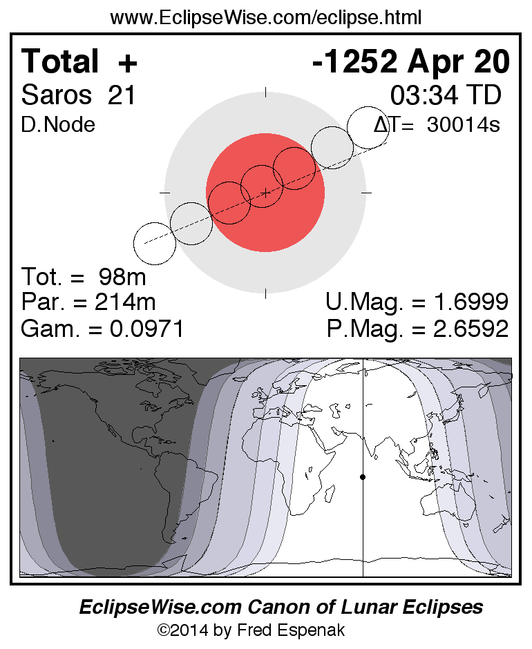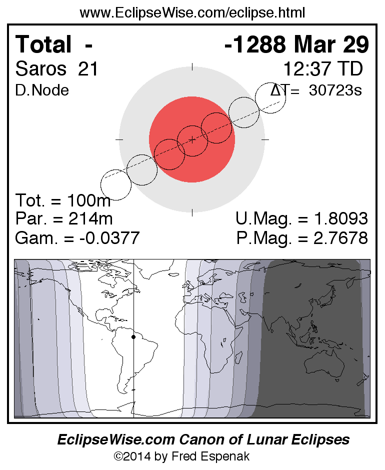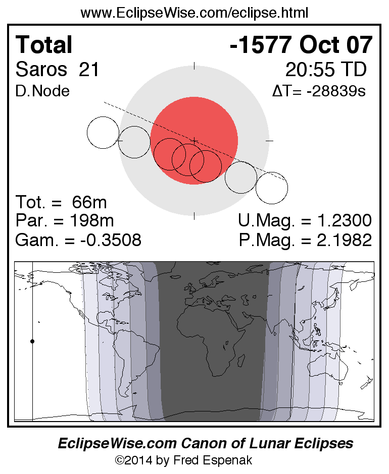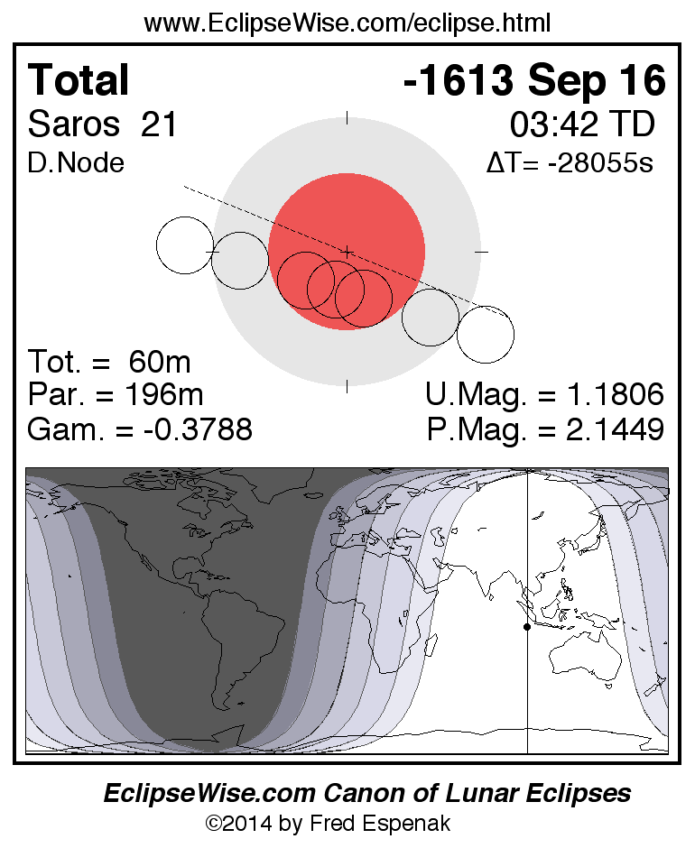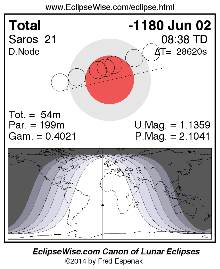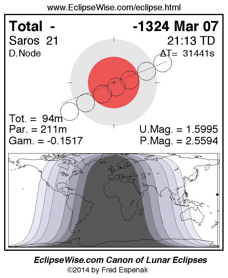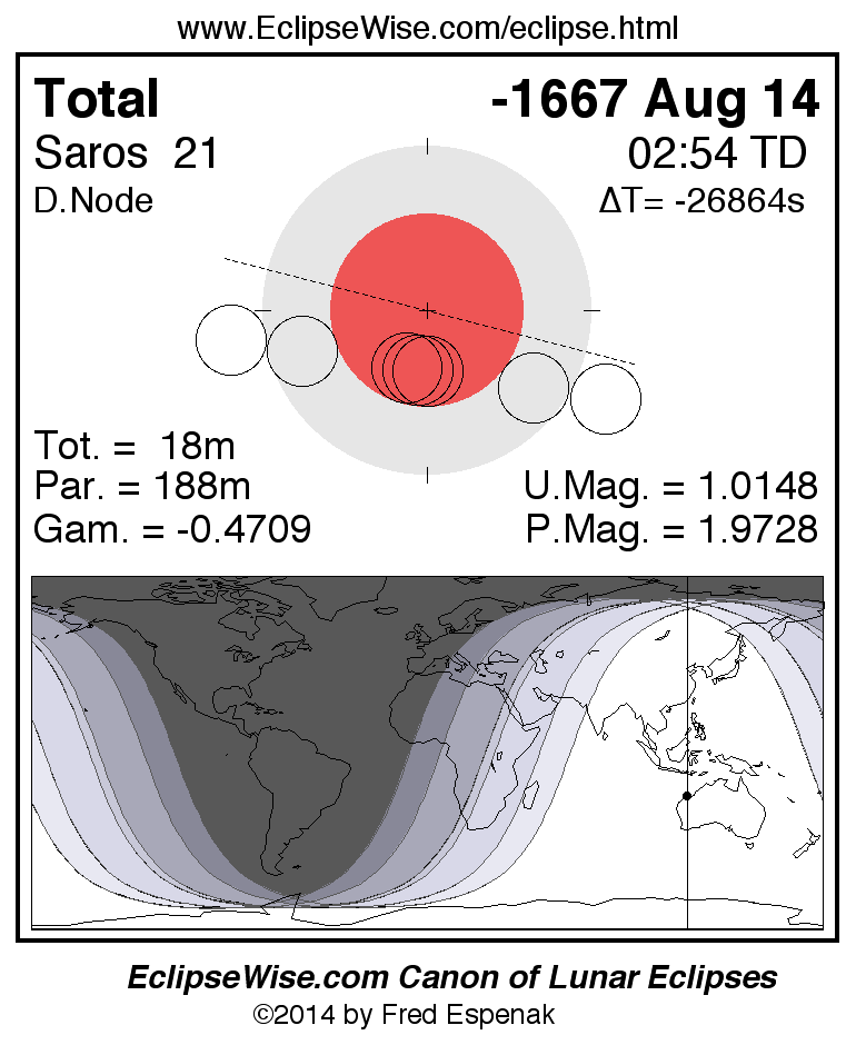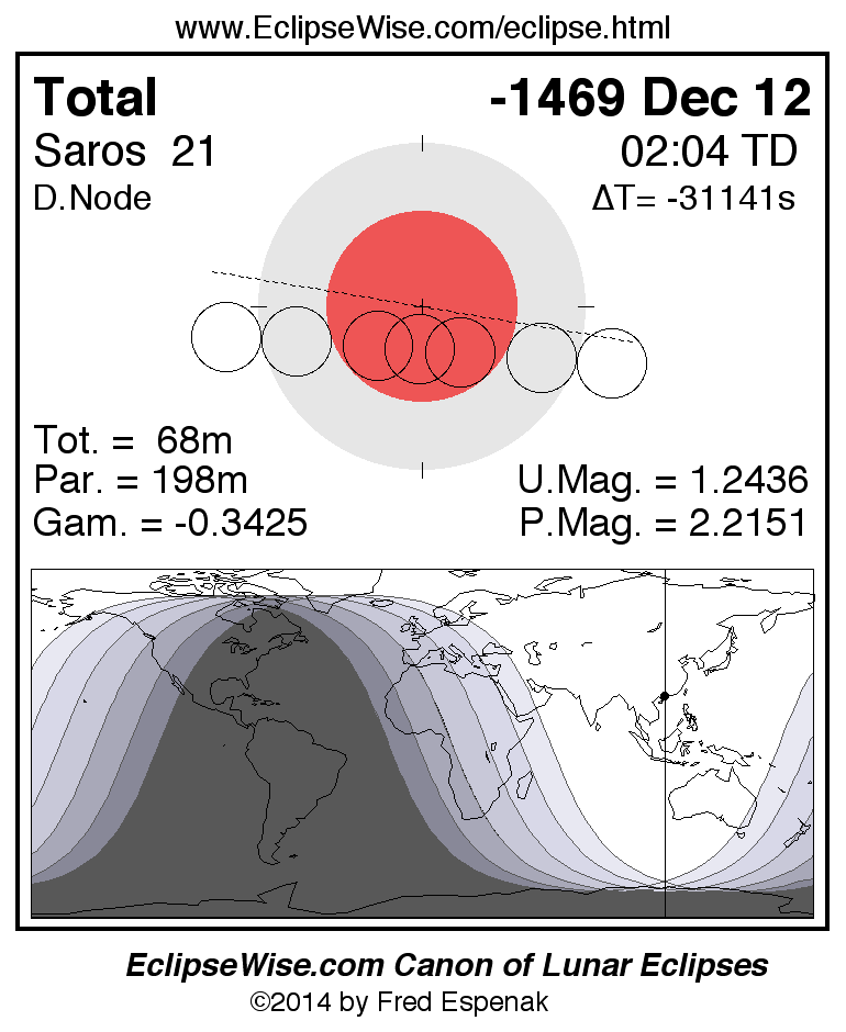A panorama of all lunar eclipses belonging to Saros 21 is presented here. Each figure shows the Moon's path with respect to Earth's penumbral and umbral shadows. Below the path is a map depicting the geographic region of visibility for the eclipse. The date and time are given for the instant of Greatest Eclipse. Every figure serves as a hyperlink to the EclipseWise Prime page for that eclipse with a larger figure and complete details for the eclipse. Visit the Key to Lunar Eclipse Figures for a detailed explanation of these diagrams. Near the bottom of this page are a series of hyperlinks for more on lunar eclipses.