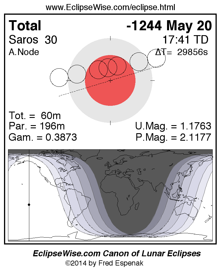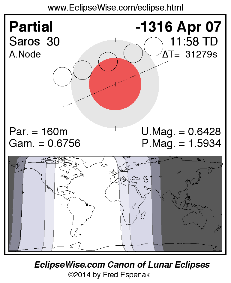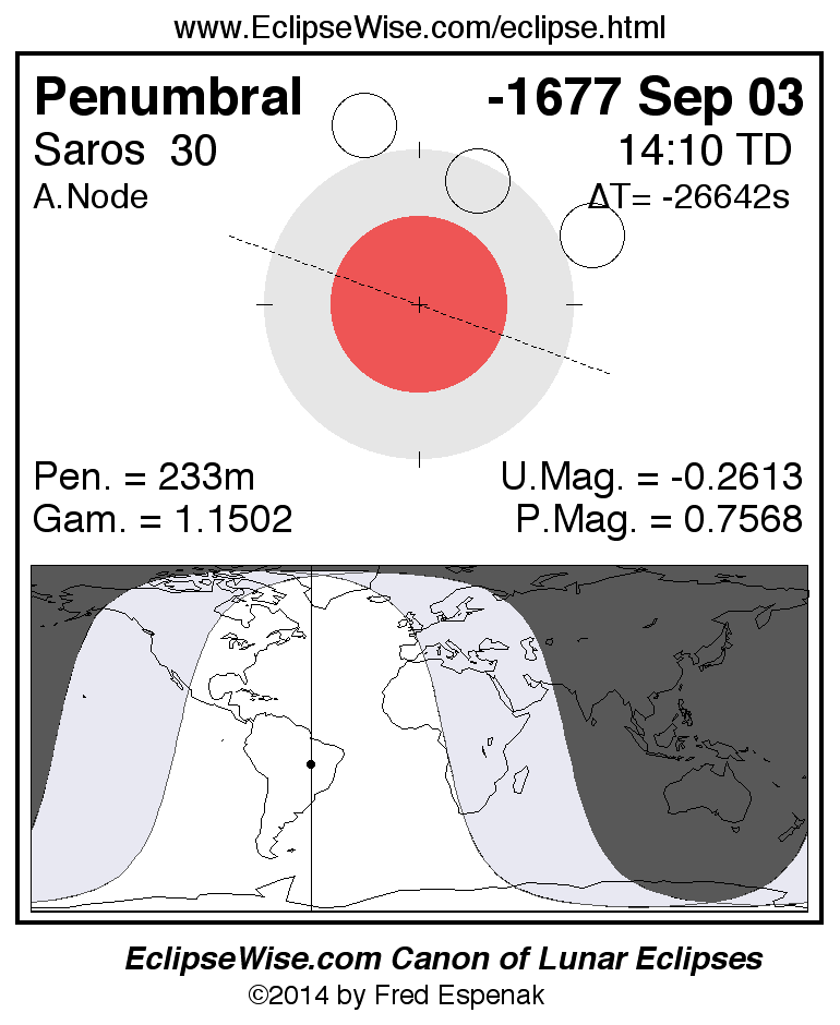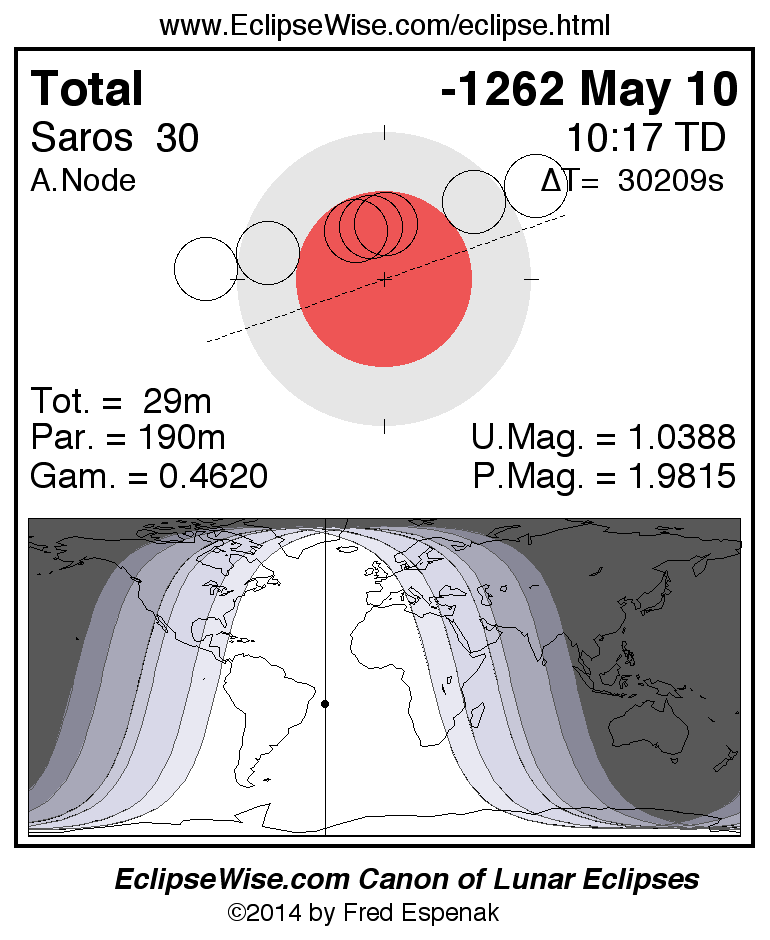 A panorama of all lunar eclipses belonging to Saros 30 is presented here. Each figure shows the Moon's path with respect to Earth's penumbral and umbral shadows. Below the path is a map depicting the geographic region of visibility for the eclipse. The date and time are given for the instant of Greatest Eclipse. Every figure serves as a hyperlink to the EclipseWise Prime page for that eclipse with a larger figure and complete details for the eclipse. Visit the Key to Lunar Eclipse Figures for a detailed explanation of these diagrams. Near the bottom of this page are a series of hyperlinks for more on lunar eclipses.