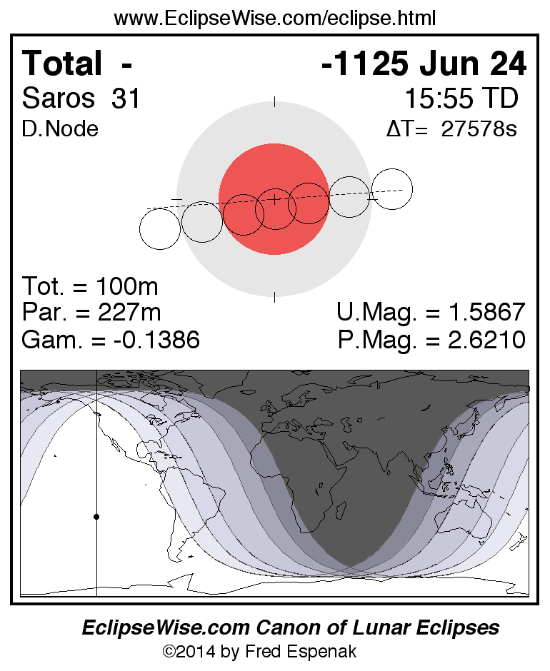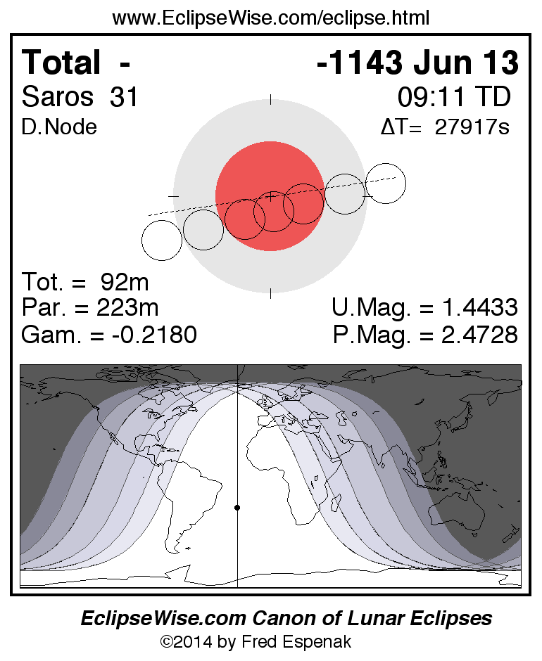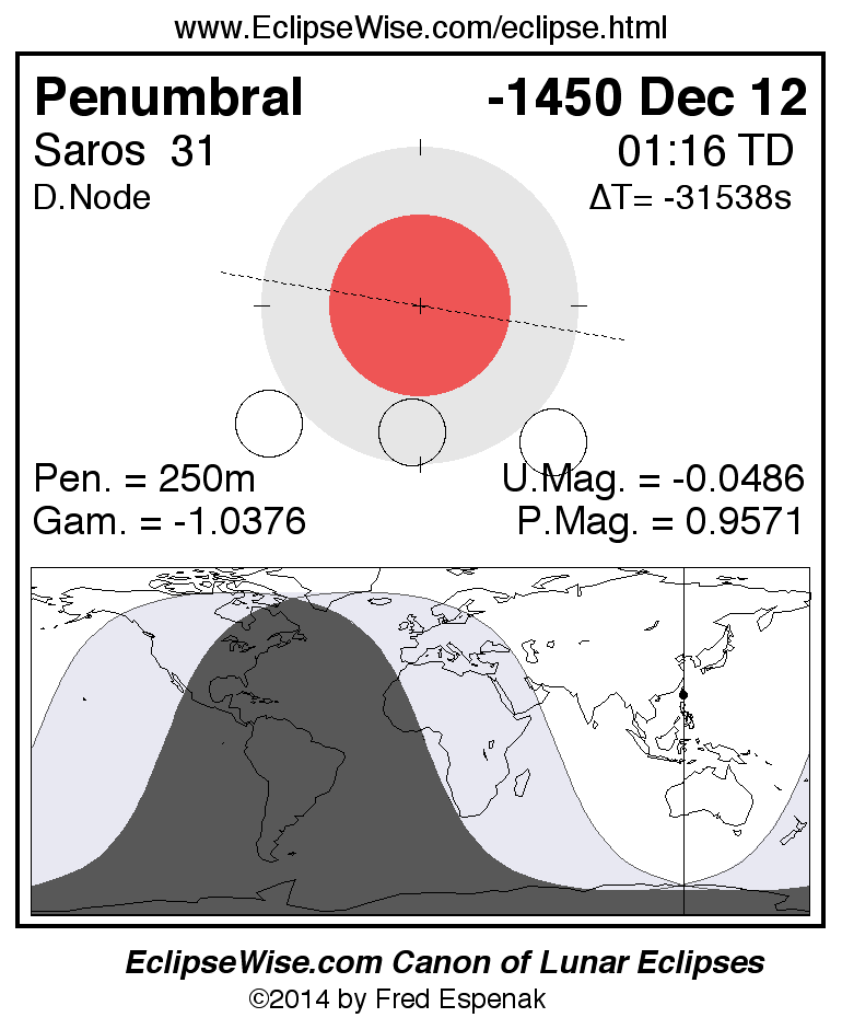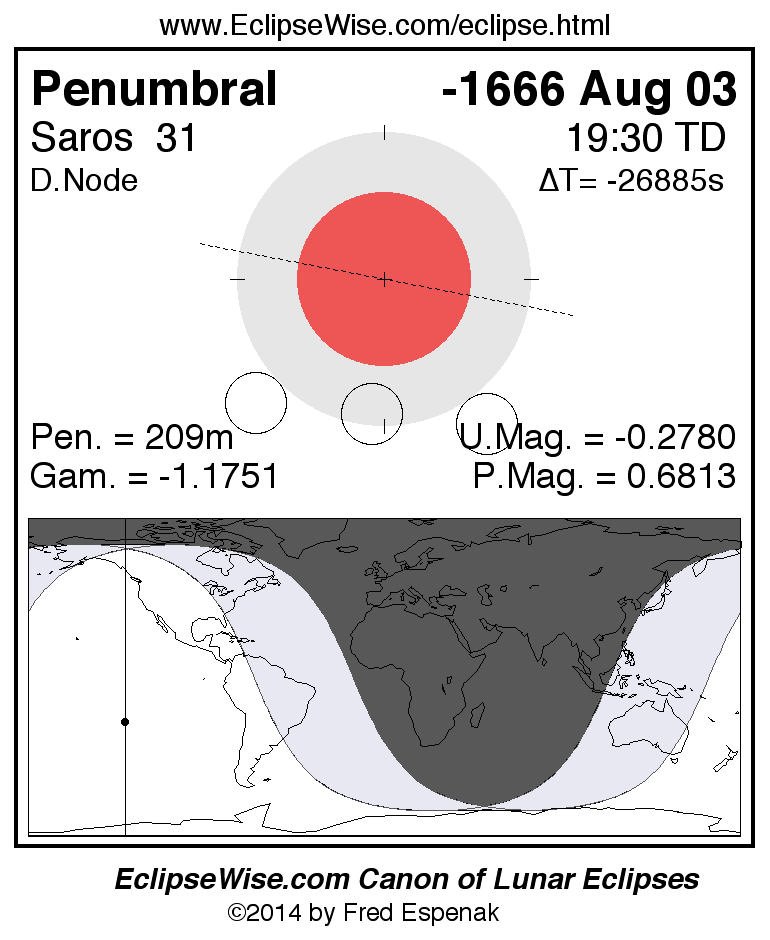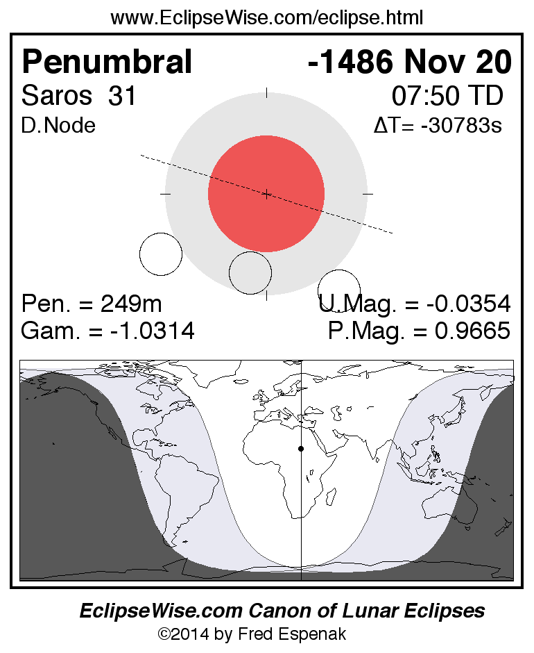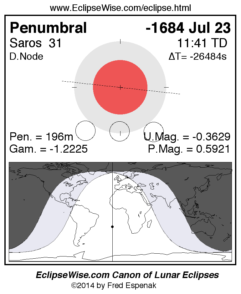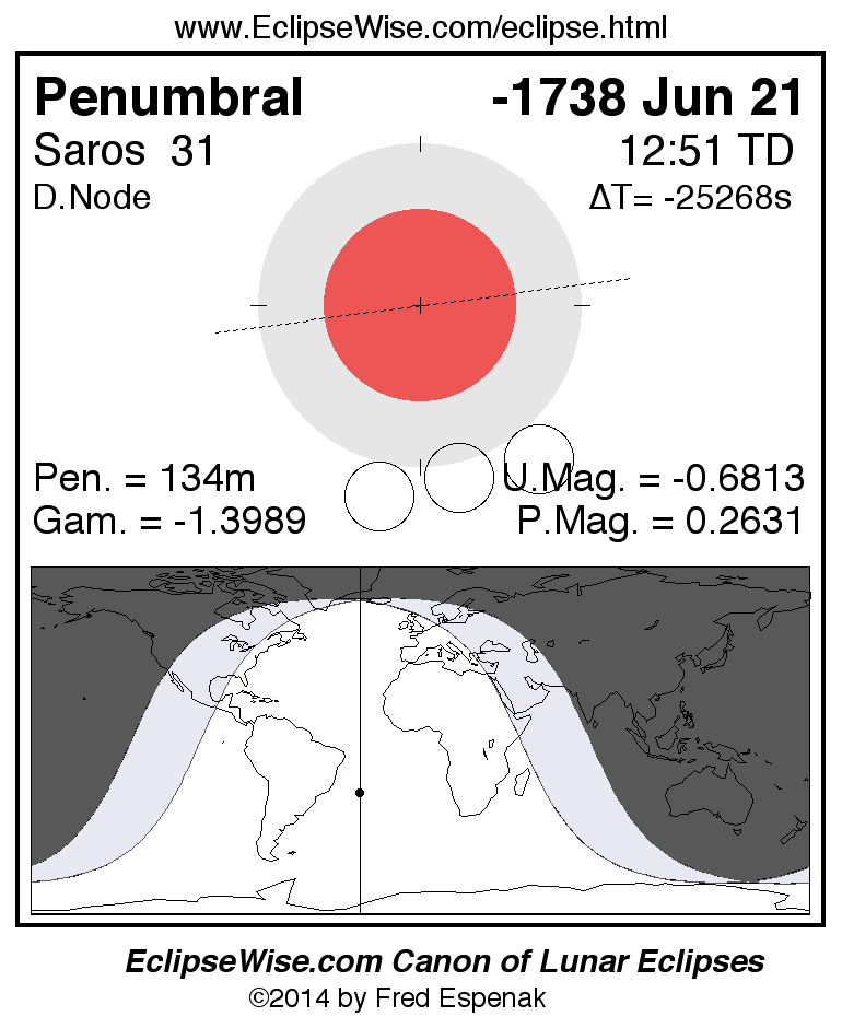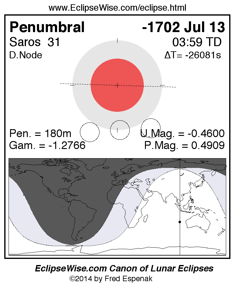 A panorama of all lunar eclipses belonging to Saros 31 is presented here. Each figure shows the Moon's path with respect to Earth's penumbral and umbral shadows. Below the path is a map depicting the geographic region of visibility for the eclipse. The date and time are given for the instant of Greatest Eclipse. Every figure serves as a hyperlink to the EclipseWise Prime page for that eclipse with a larger figure and complete details for the eclipse. Visit the Key to Lunar Eclipse Figures for a detailed explanation of these diagrams. Near the bottom of this page are a series of hyperlinks for more on lunar eclipses.