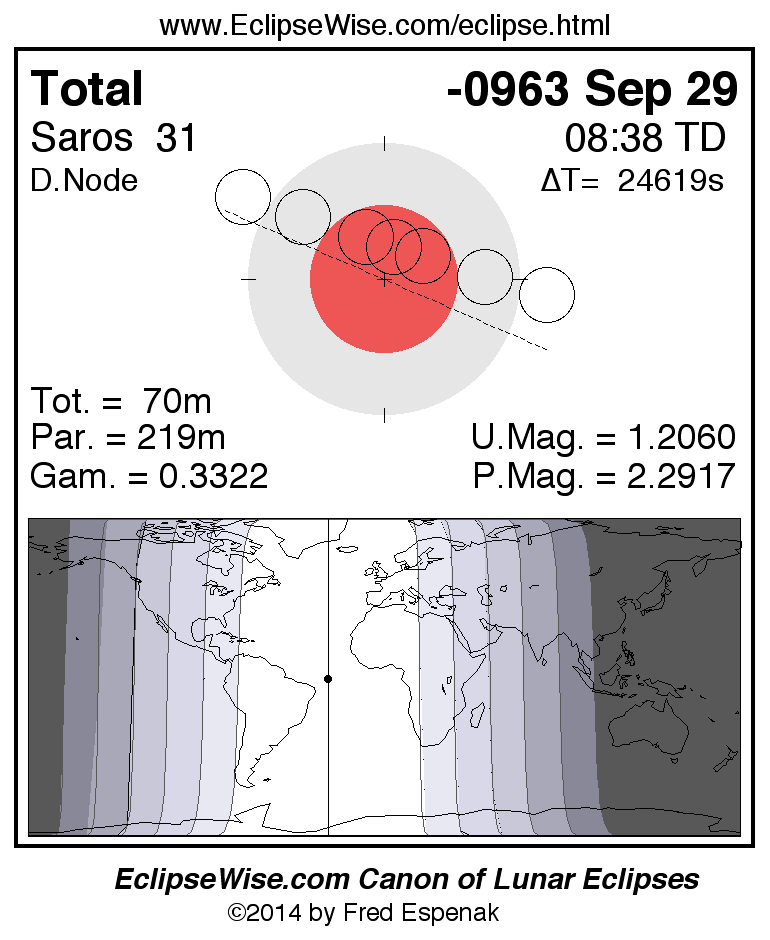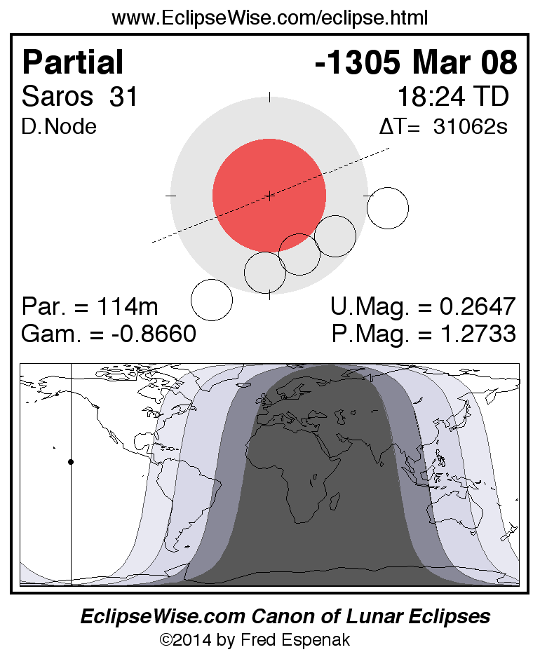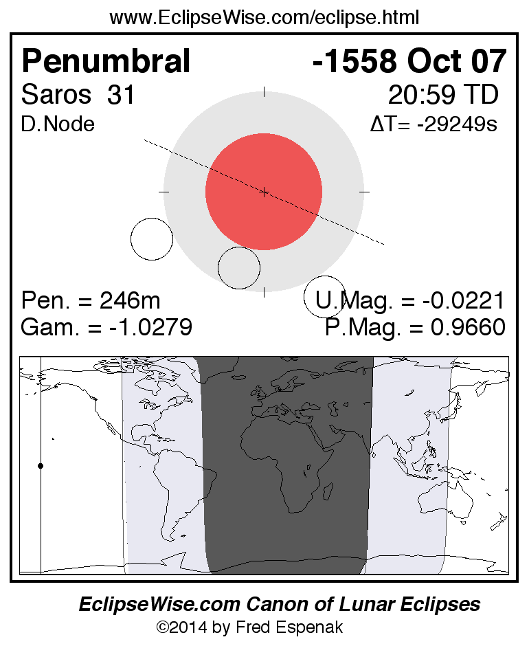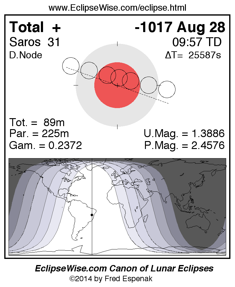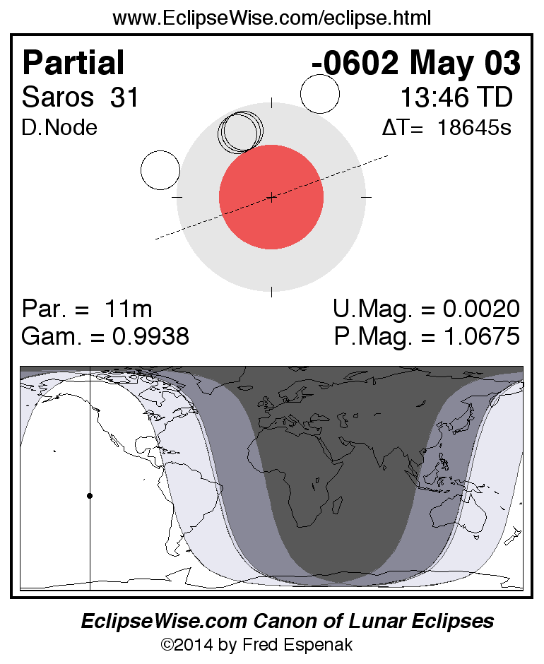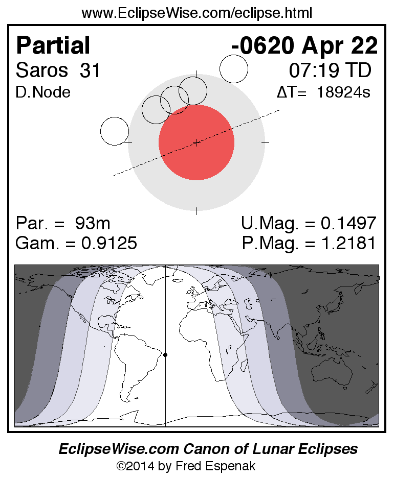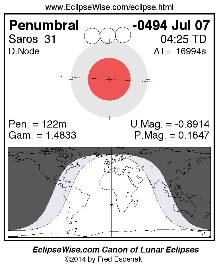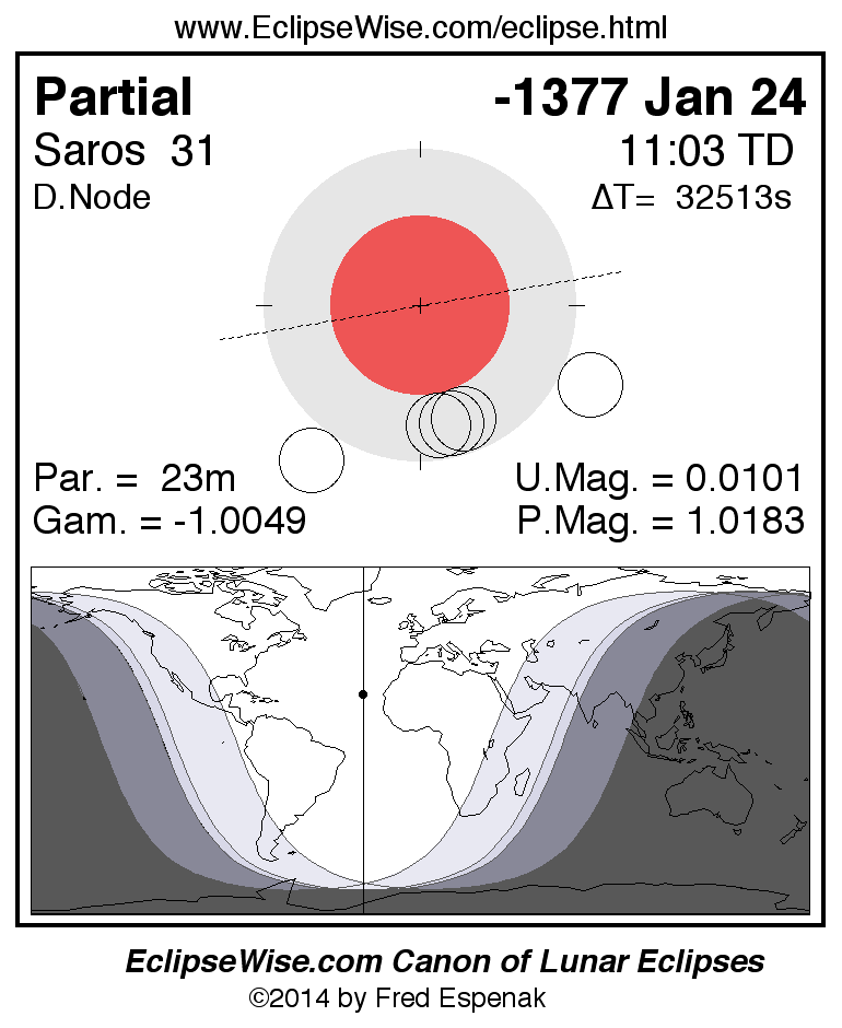 A panorama of all lunar eclipses belonging to Saros 31 is presented here. Each figure shows the Moon's path with respect to Earth's penumbral and umbral shadows. Below the path is a map depicting the geographic region of visibility for the eclipse. The date and time are given for the instant of Greatest Eclipse. Every figure serves as a hyperlink to the EclipseWise Prime page for that eclipse with a larger figure and complete details for the eclipse. Visit the Key to Lunar Eclipse Figures for a detailed explanation of these diagrams. Near the bottom of this page are a series of hyperlinks for more on lunar eclipses.