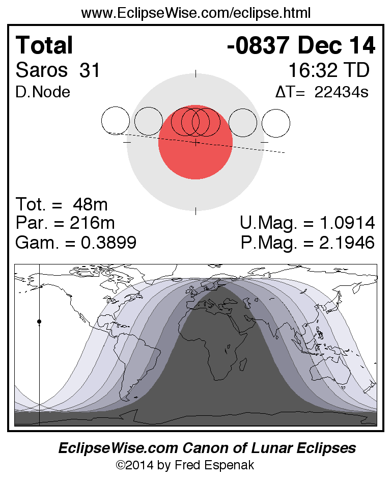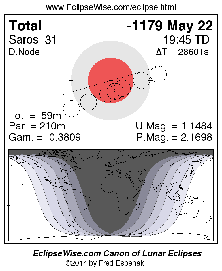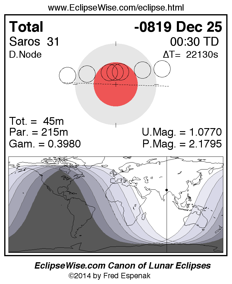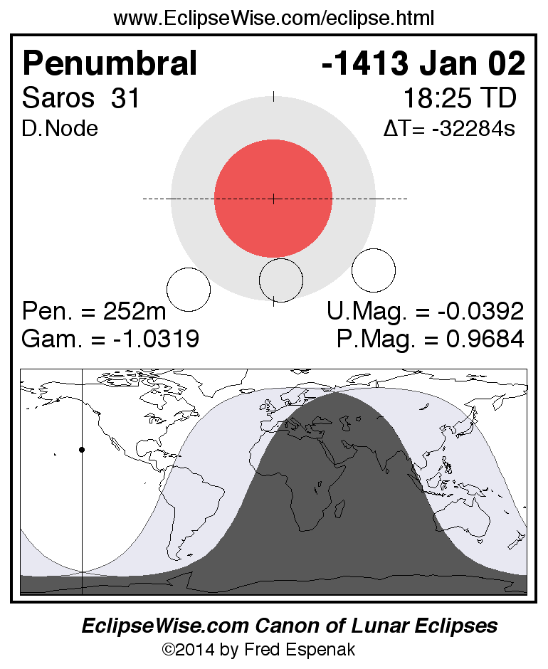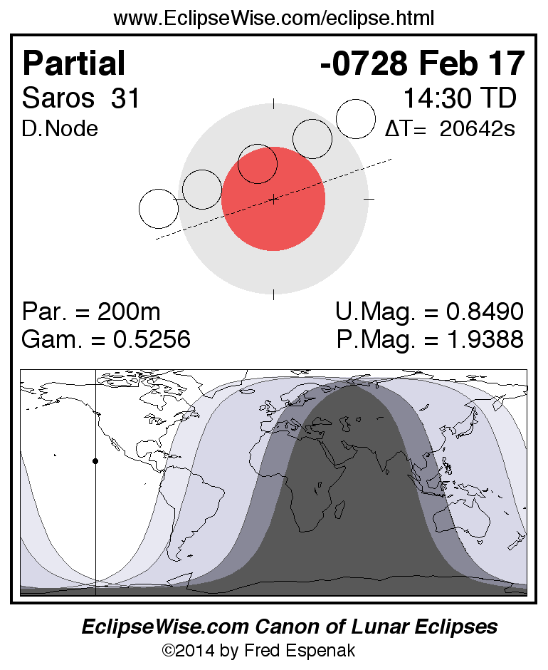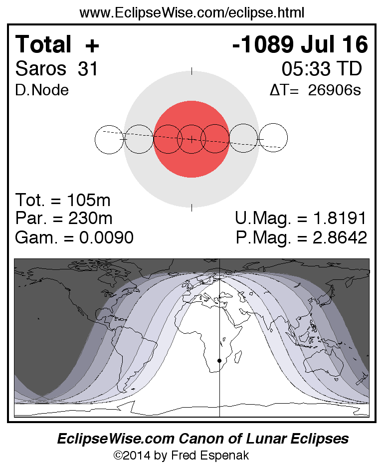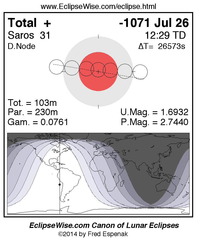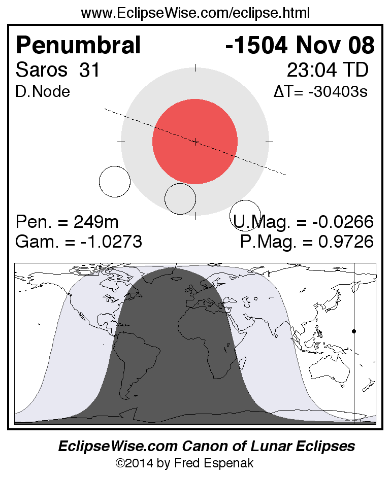 A panorama of all lunar eclipses belonging to Saros 31 is presented here. Each figure shows the Moon's path with respect to Earth's penumbral and umbral shadows. Below the path is a map depicting the geographic region of visibility for the eclipse. The date and time are given for the instant of Greatest Eclipse. Every figure serves as a hyperlink to the EclipseWise Prime page for that eclipse with a larger figure and complete details for the eclipse. Visit the Key to Lunar Eclipse Figures for a detailed explanation of these diagrams. Near the bottom of this page are a series of hyperlinks for more on lunar eclipses.