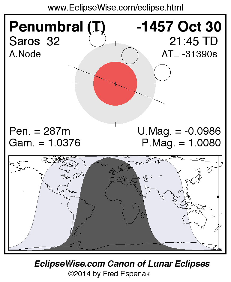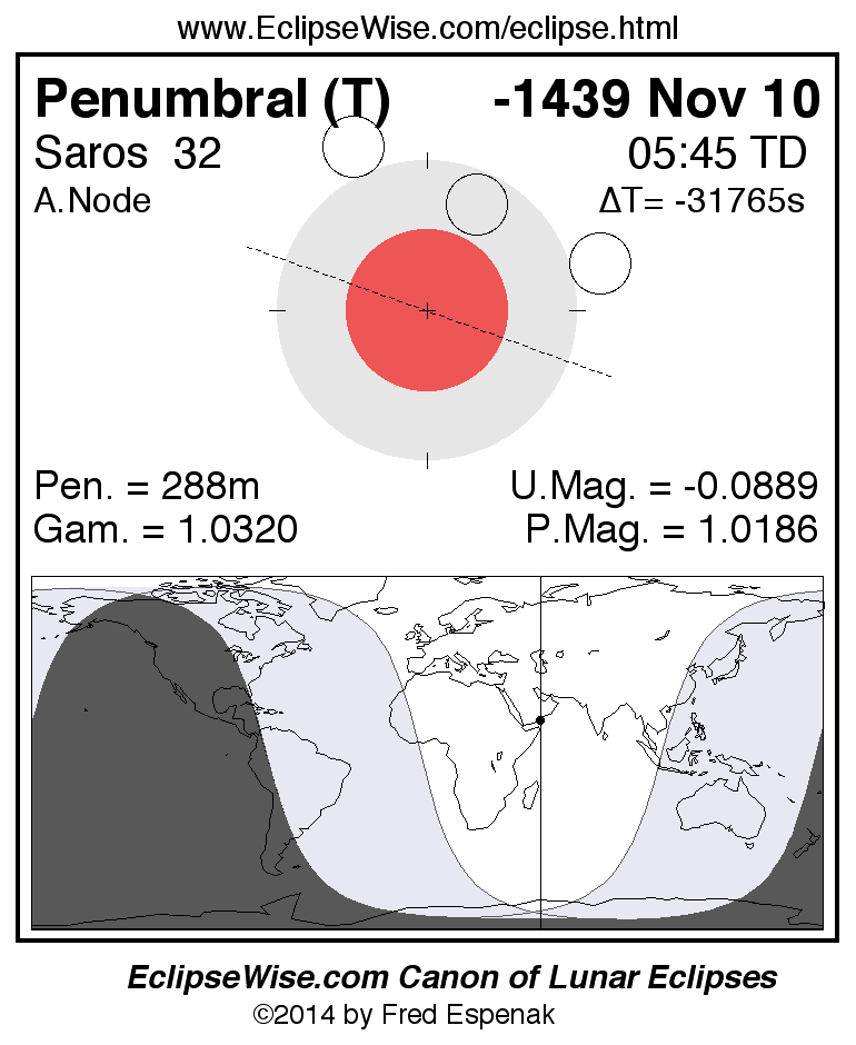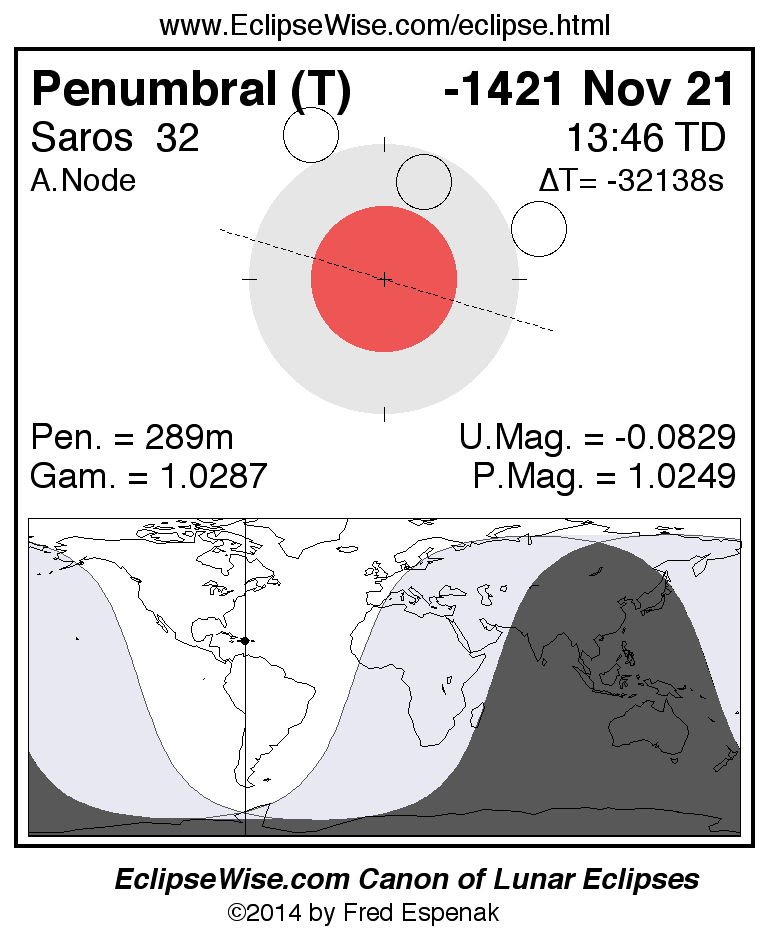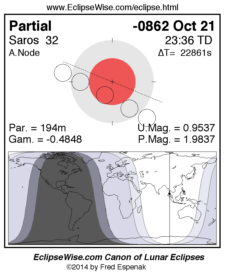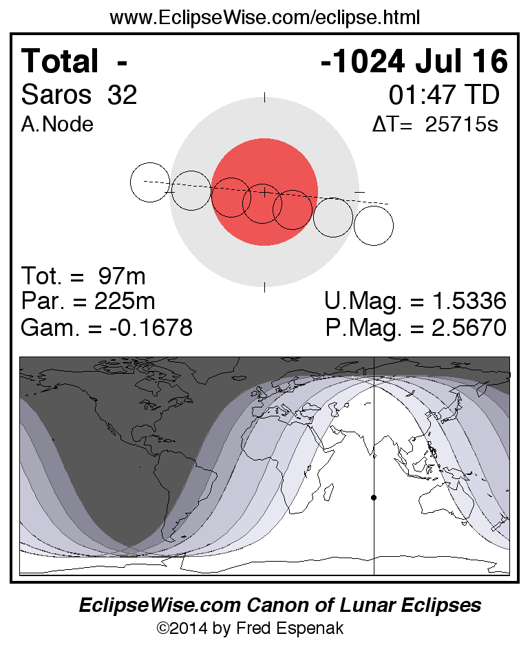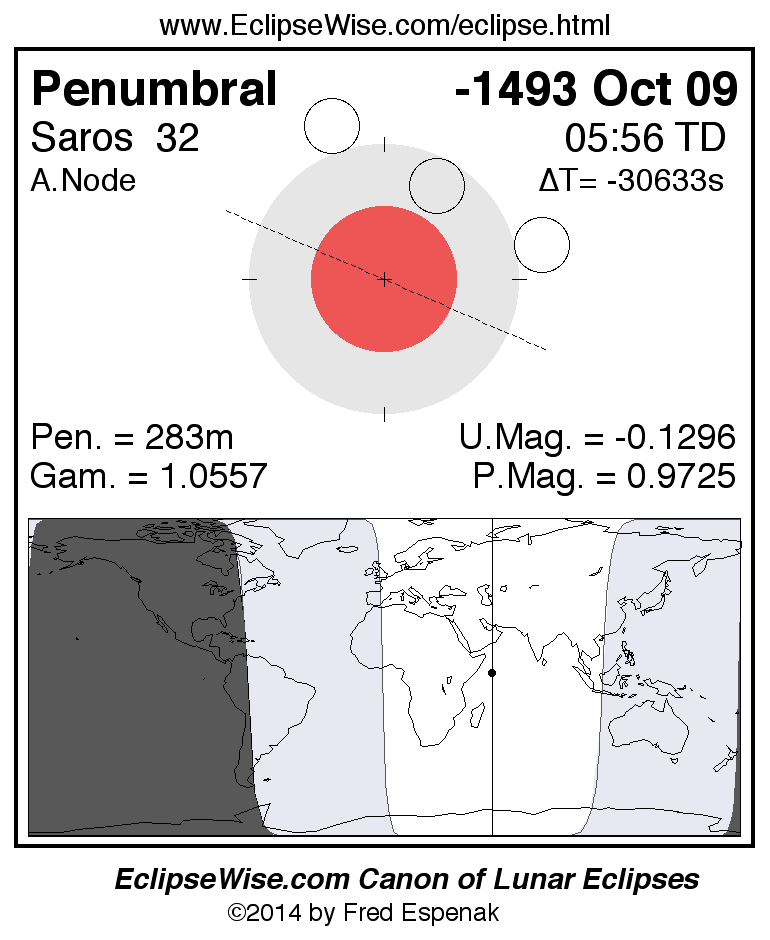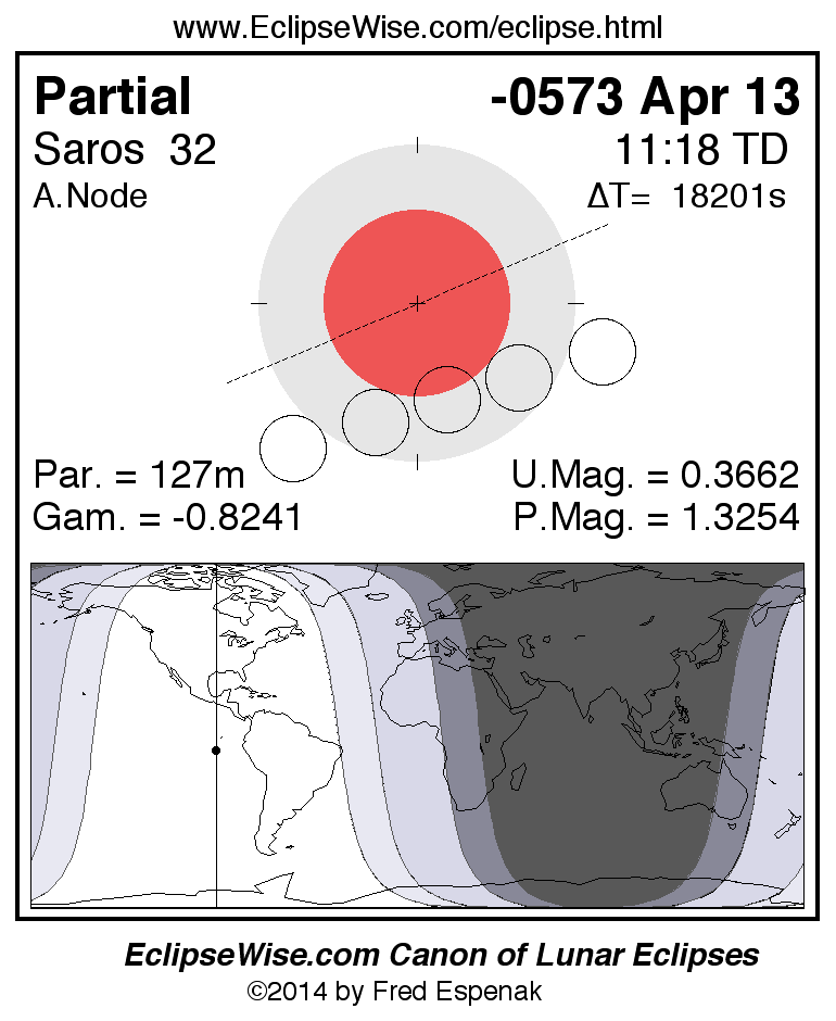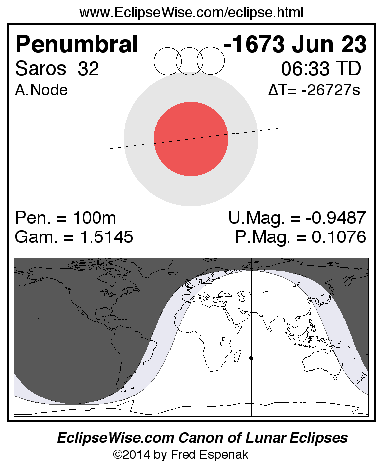 A panorama of all lunar eclipses belonging to Saros 32 is presented here. Each figure shows the Moon's path with respect to Earth's penumbral and umbral shadows. Below the path is a map depicting the geographic region of visibility for the eclipse. The date and time are given for the instant of Greatest Eclipse. Every figure serves as a hyperlink to the EclipseWise Prime page for that eclipse with a larger figure and complete details for the eclipse. Visit the Key to Lunar Eclipse Figures for a detailed explanation of these diagrams. Near the bottom of this page are a series of hyperlinks for more on lunar eclipses.