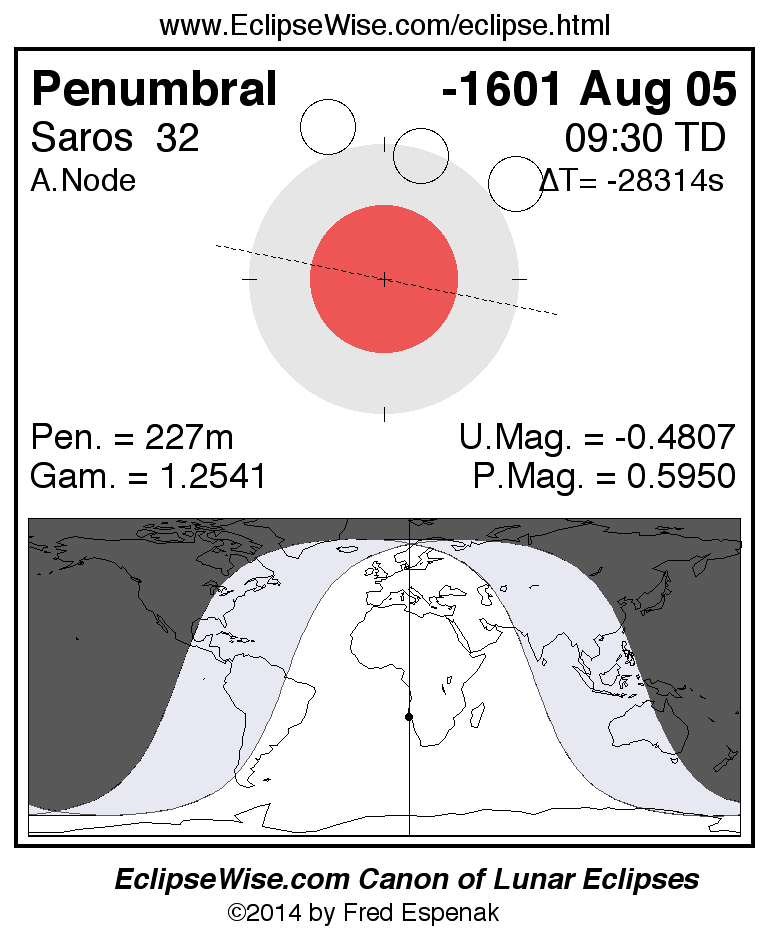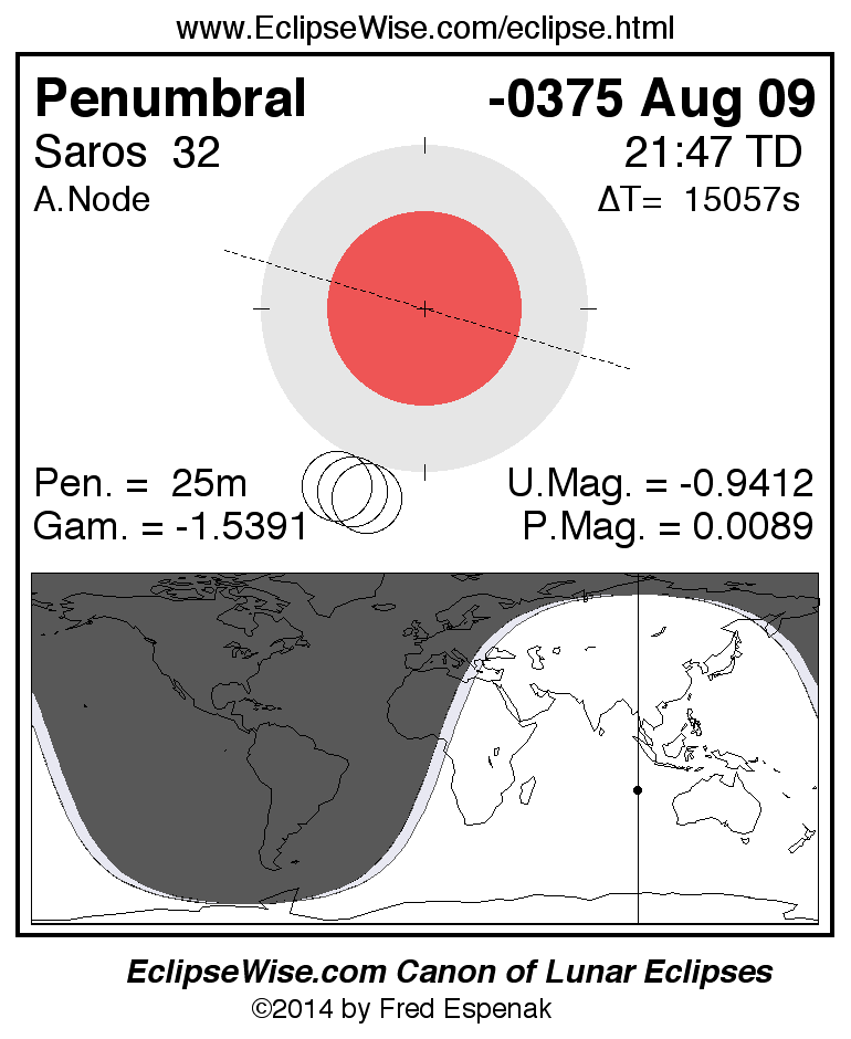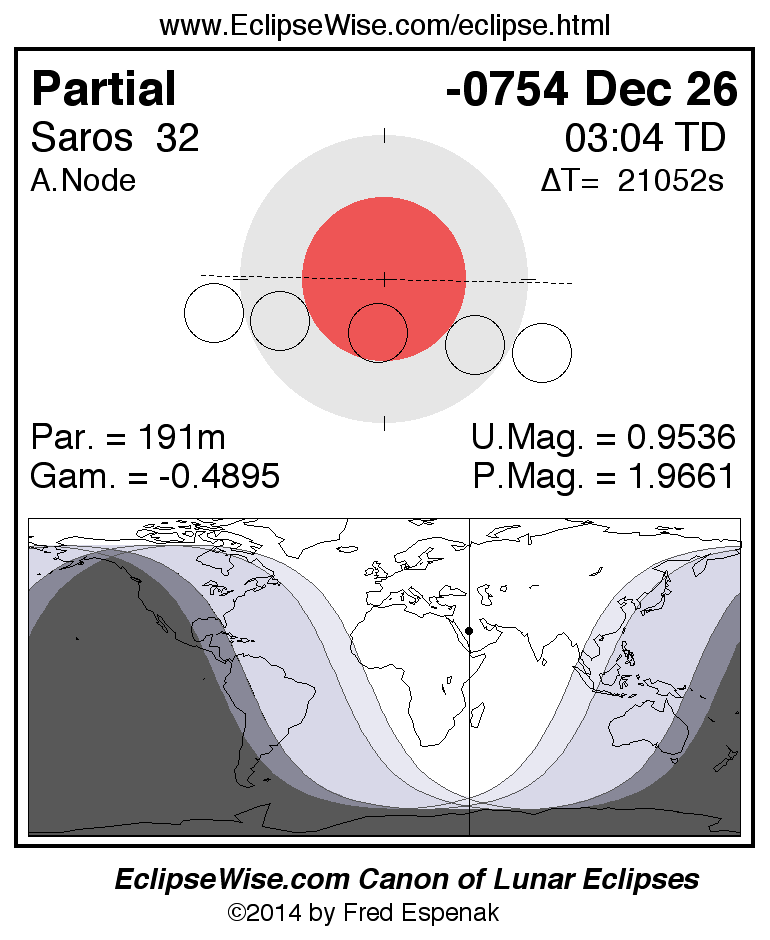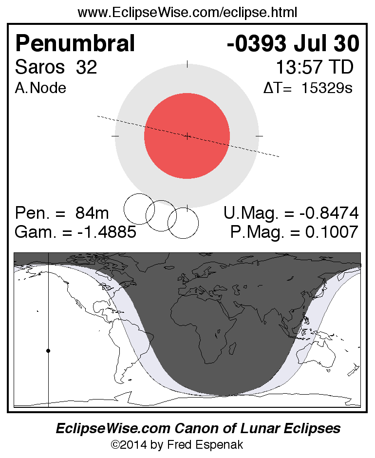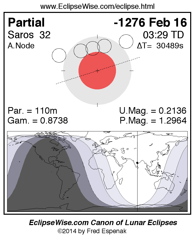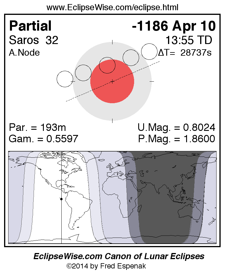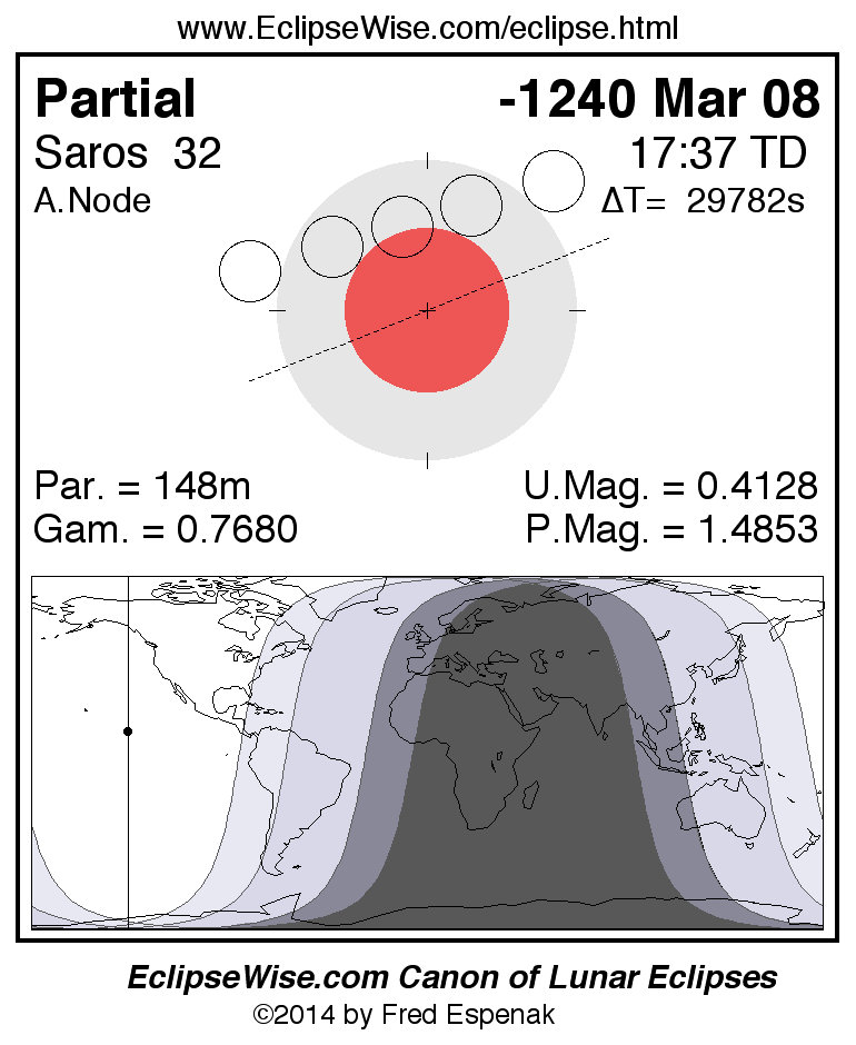 A panorama of all lunar eclipses belonging to Saros 32 is presented here. Each figure shows the Moon's path with respect to Earth's penumbral and umbral shadows. Below the path is a map depicting the geographic region of visibility for the eclipse. The date and time are given for the instant of Greatest Eclipse. Every figure serves as a hyperlink to the EclipseWise Prime page for that eclipse with a larger figure and complete details for the eclipse. Visit the Key to Lunar Eclipse Figures for a detailed explanation of these diagrams. Near the bottom of this page are a series of hyperlinks for more on lunar eclipses.