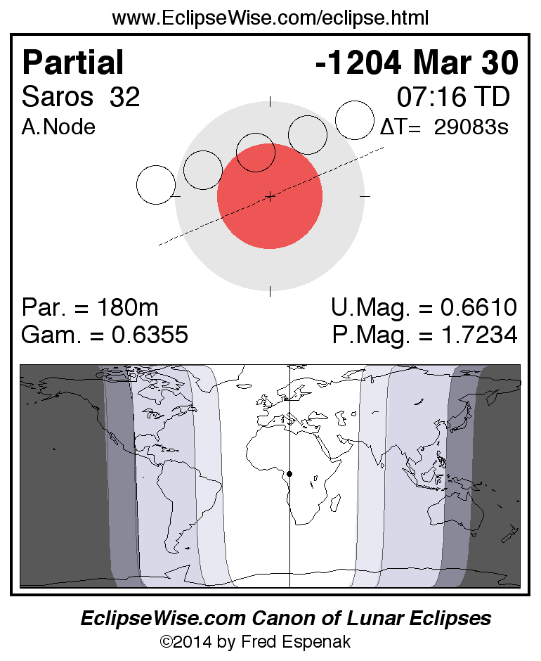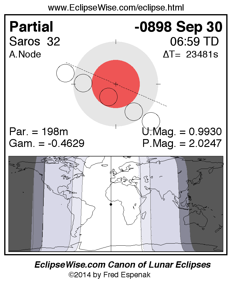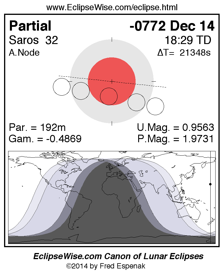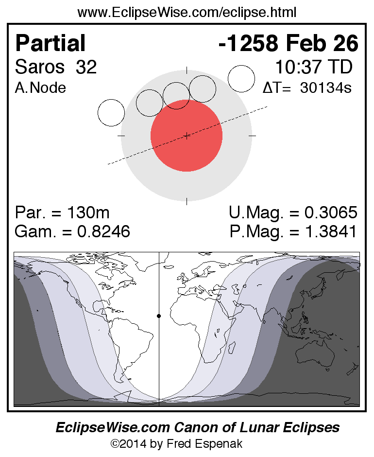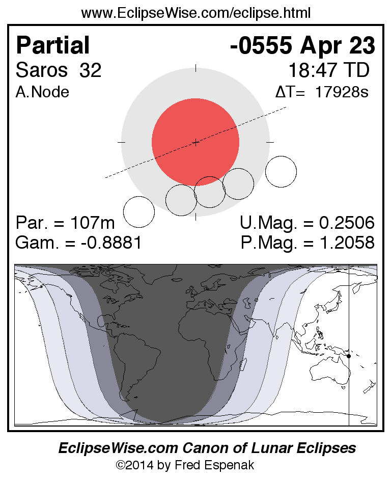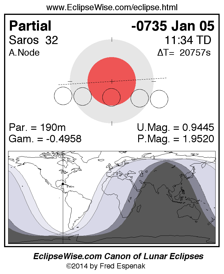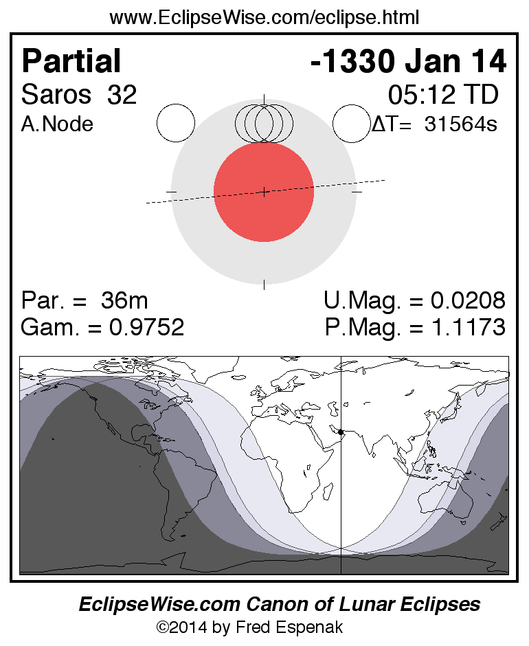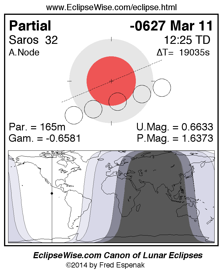 A panorama of all lunar eclipses belonging to Saros 32 is presented here. Each figure shows the Moon's path with respect to Earth's penumbral and umbral shadows. Below the path is a map depicting the geographic region of visibility for the eclipse. The date and time are given for the instant of Greatest Eclipse. Every figure serves as a hyperlink to the EclipseWise Prime page for that eclipse with a larger figure and complete details for the eclipse. Visit the Key to Lunar Eclipse Figures for a detailed explanation of these diagrams. Near the bottom of this page are a series of hyperlinks for more on lunar eclipses.