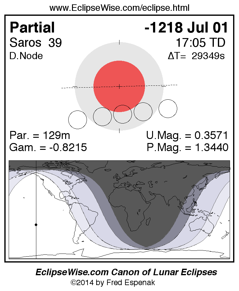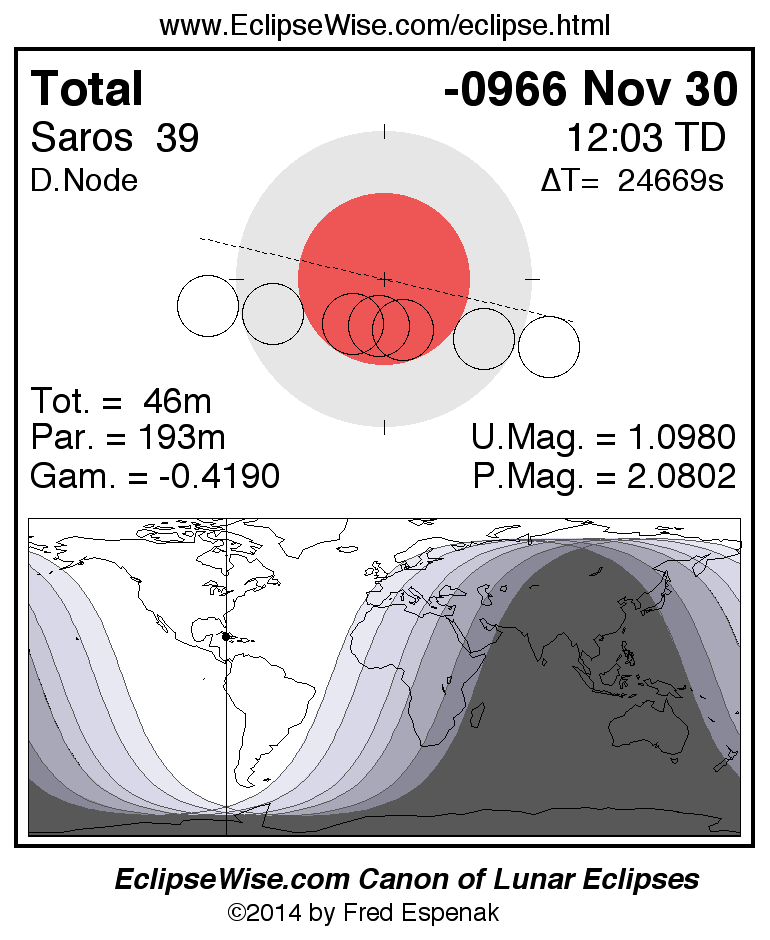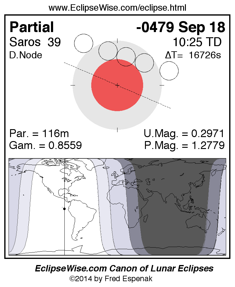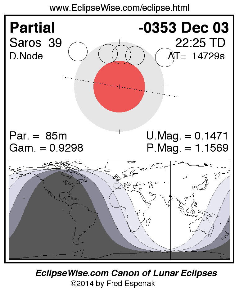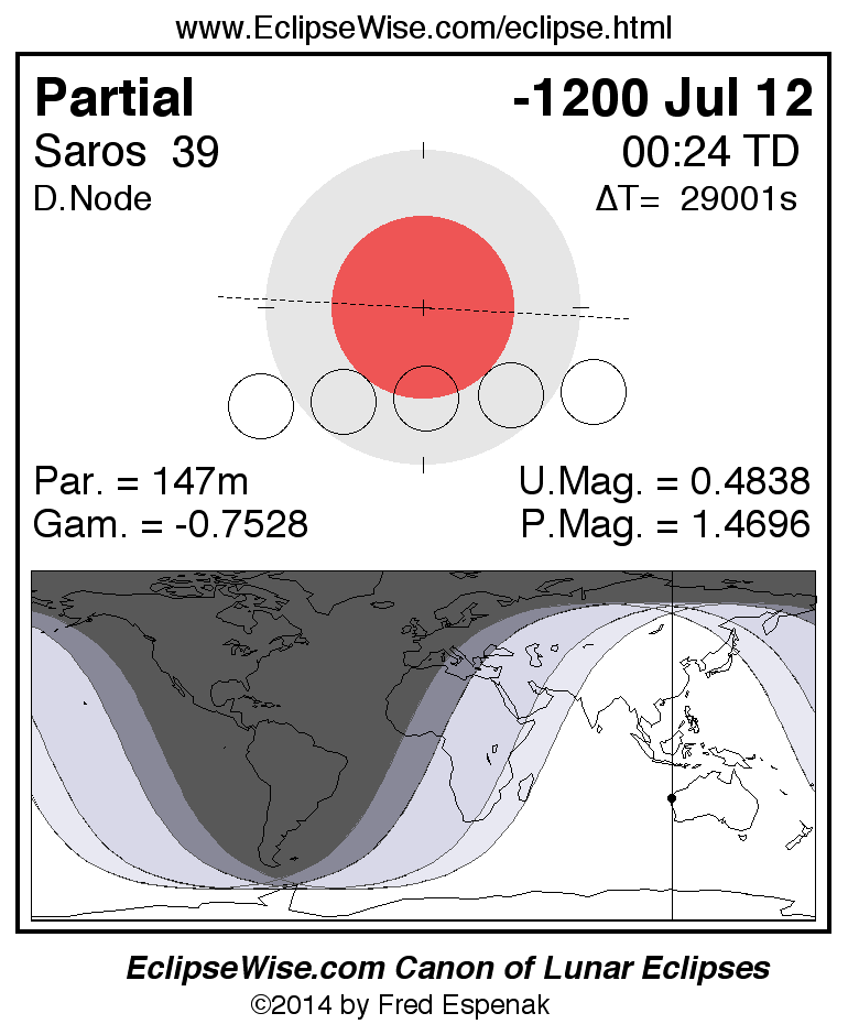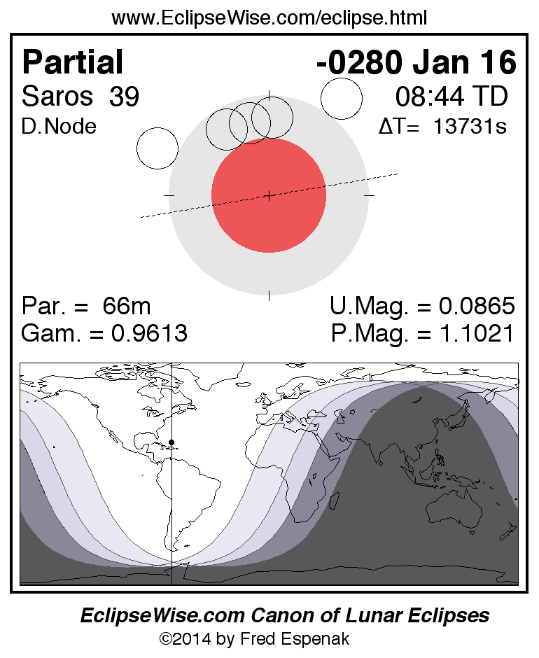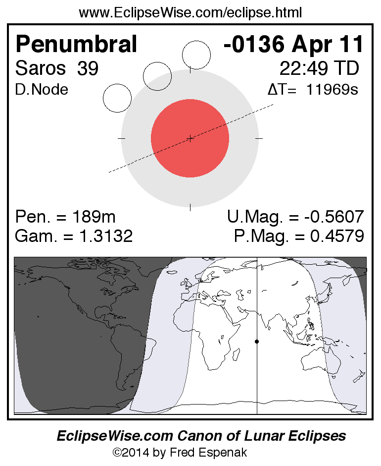 A panorama of all lunar eclipses belonging to Saros 39 is presented here. Each figure shows the Moon's path with respect to Earth's penumbral and umbral shadows. Below the path is a map depicting the geographic region of visibility for the eclipse. The date and time are given for the instant of Greatest Eclipse. Every figure serves as a hyperlink to the EclipseWise Prime page for that eclipse with a larger figure and complete details for the eclipse. Visit the Key to Lunar Eclipse Figures for a detailed explanation of these diagrams. Near the bottom of this page are a series of hyperlinks for more on lunar eclipses.