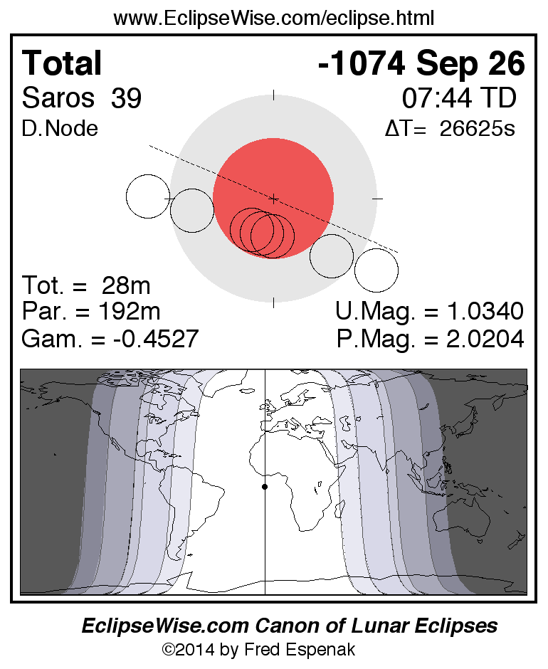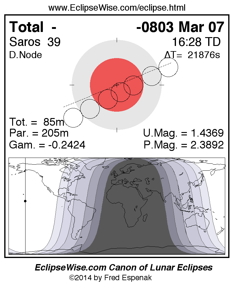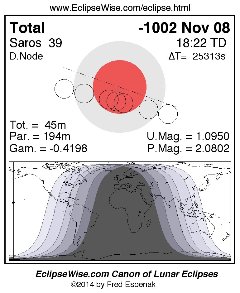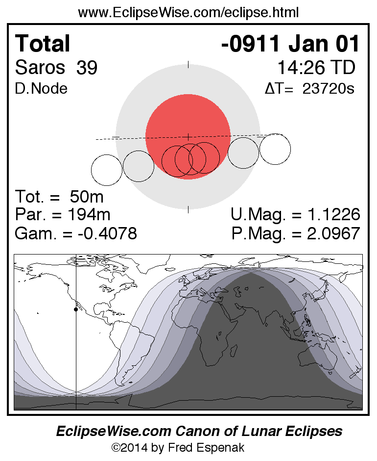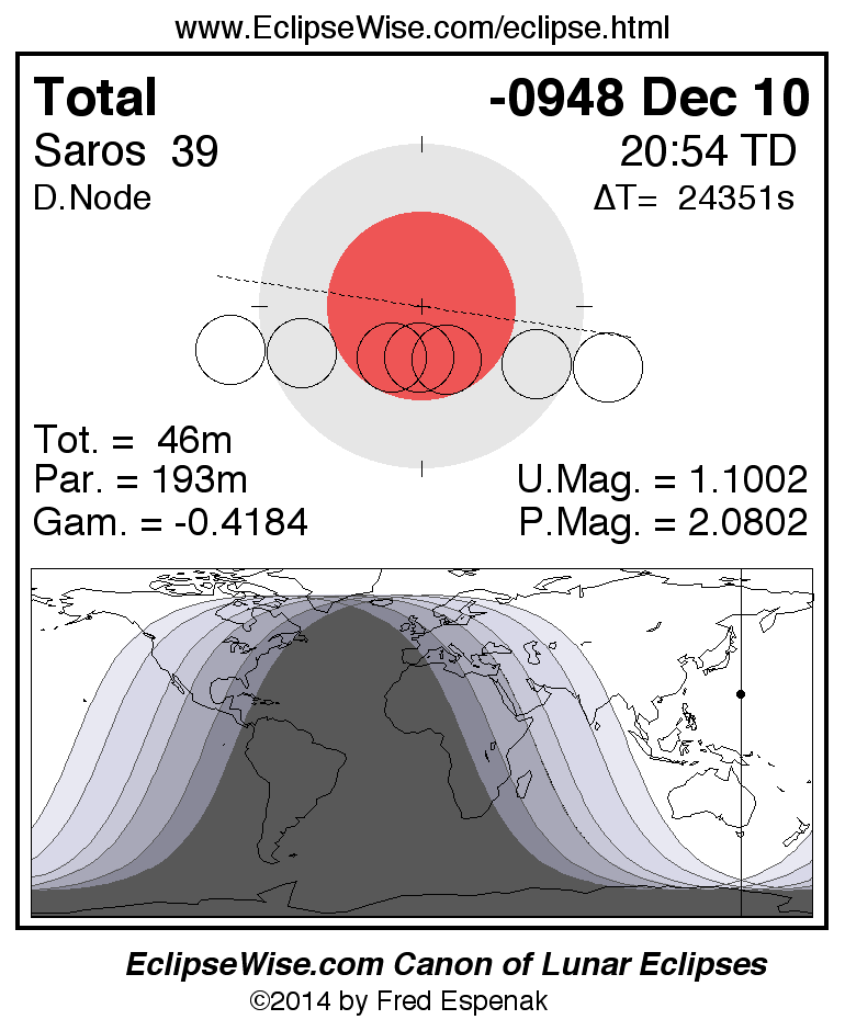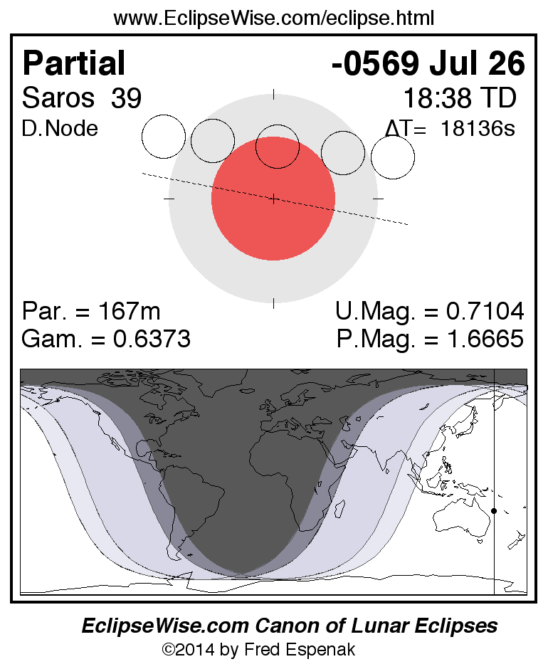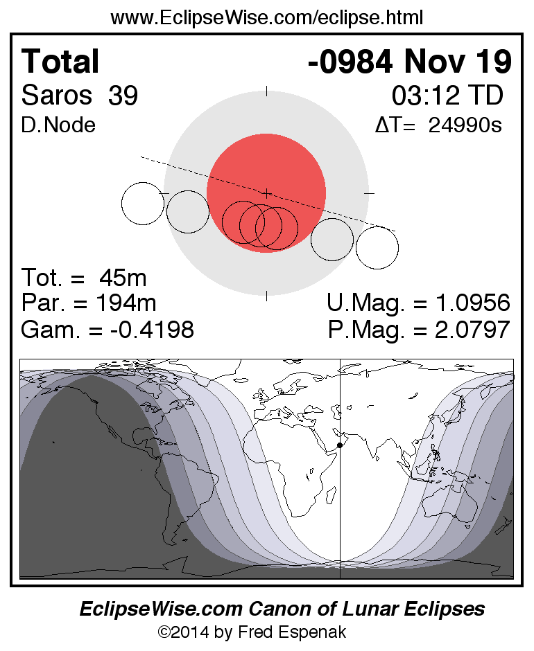A panorama of all lunar eclipses belonging to Saros 39 is presented here. Each figure shows the Moon's path with respect to Earth's penumbral and umbral shadows. Below the path is a map depicting the geographic region of visibility for the eclipse. The date and time are given for the instant of Greatest Eclipse. Every figure serves as a hyperlink to the EclipseWise Prime page for that eclipse with a larger figure and complete details for the eclipse. Visit the Key to Lunar Eclipse Figures for a detailed explanation of these diagrams. Near the bottom of this page are a series of hyperlinks for more on lunar eclipses.