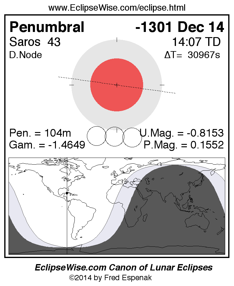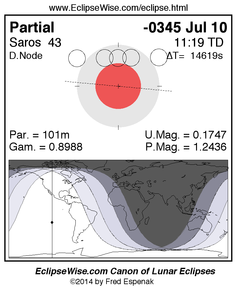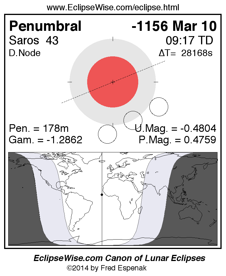 A panorama of all lunar eclipses belonging to Saros 43 is presented here. Each figure shows the Moon's path with respect to Earth's penumbral and umbral shadows. Below the path is a map depicting the geographic region of visibility for the eclipse. The date and time are given for the instant of Greatest Eclipse. Every figure serves as a hyperlink to the EclipseWise Prime page for that eclipse with a larger figure and complete details for the eclipse. Visit the Key to Lunar Eclipse Figures for a detailed explanation of these diagrams. Near the bottom of this page are a series of hyperlinks for more on lunar eclipses.