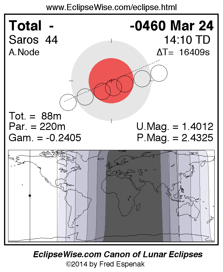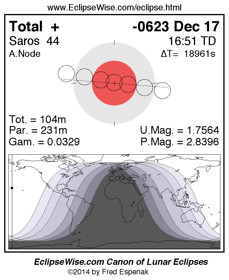 A panorama of all lunar eclipses belonging to Saros 44 is presented here. Each figure shows the Moon's path with respect to Earth's penumbral and umbral shadows. Below the path is a map depicting the geographic region of visibility for the eclipse. The date and time are given for the instant of Greatest Eclipse. Every figure serves as a hyperlink to the EclipseWise Prime page for that eclipse with a larger figure and complete details for the eclipse. Visit the Key to Lunar Eclipse Figures for a detailed explanation of these diagrams. Near the bottom of this page are a series of hyperlinks for more on lunar eclipses.