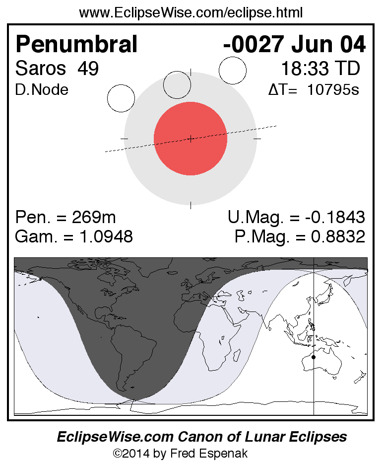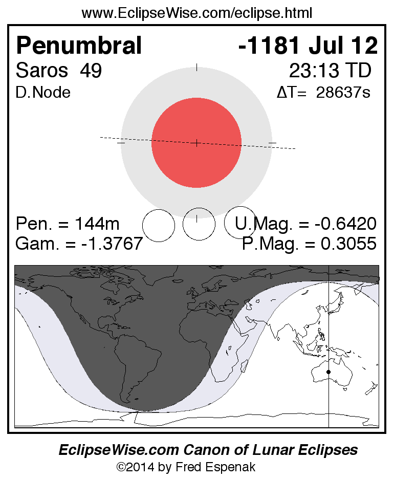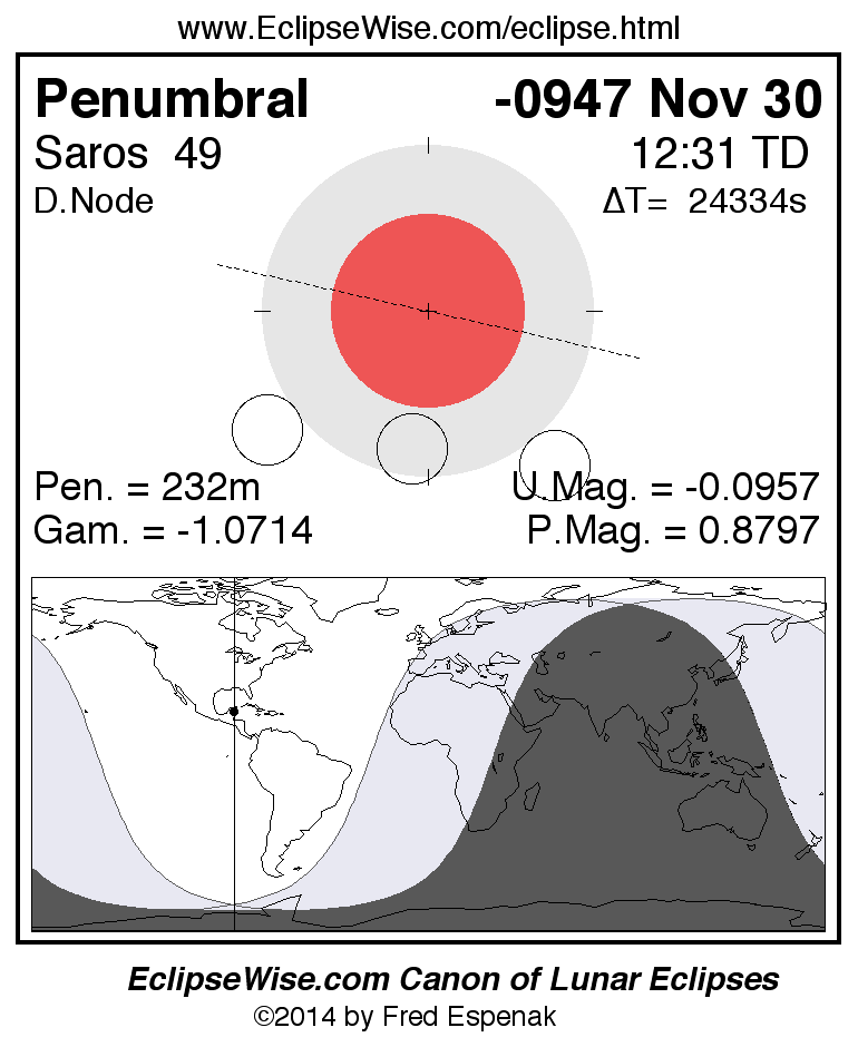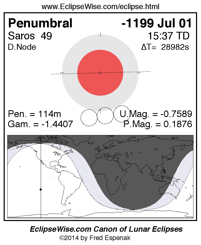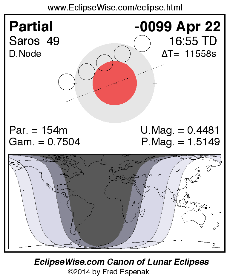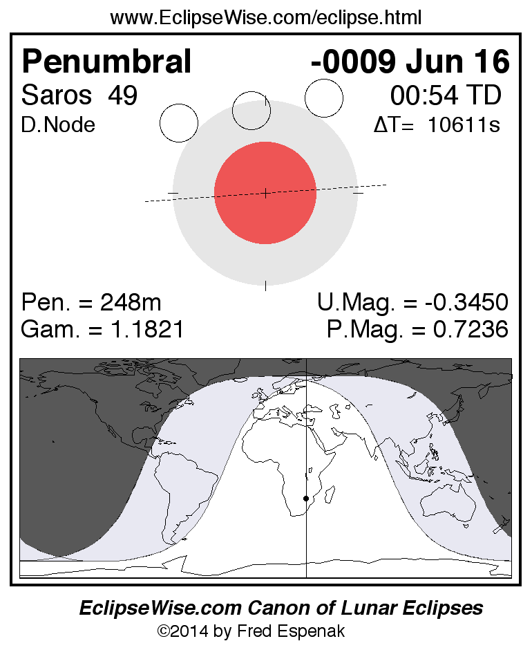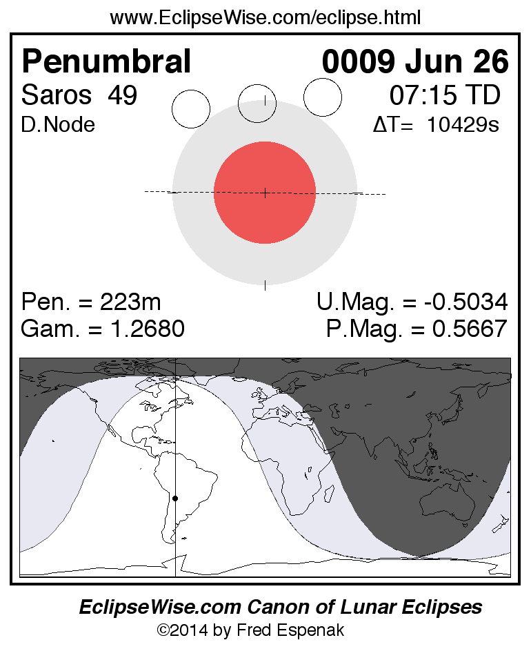 A panorama of all lunar eclipses belonging to Saros 49 is presented here. Each figure shows the Moon's path with respect to Earth's penumbral and umbral shadows. Below the path is a map depicting the geographic region of visibility for the eclipse. The date and time are given for the instant of Greatest Eclipse. Every figure serves as a hyperlink to the EclipseWise Prime page for that eclipse with a larger figure and complete details for the eclipse. Visit the Key to Lunar Eclipse Figures for a detailed explanation of these diagrams. Near the bottom of this page are a series of hyperlinks for more on lunar eclipses.