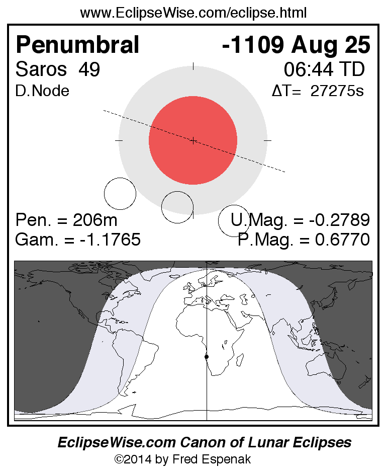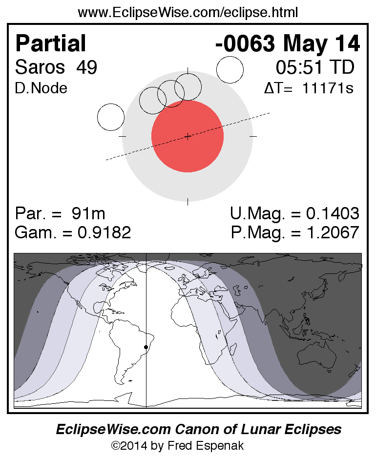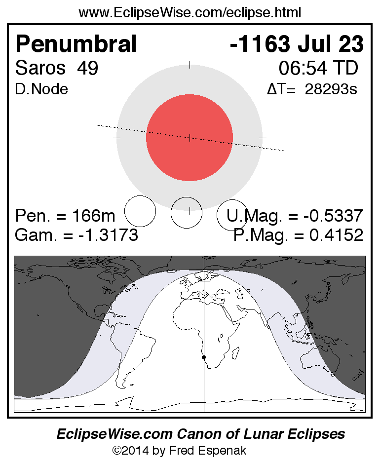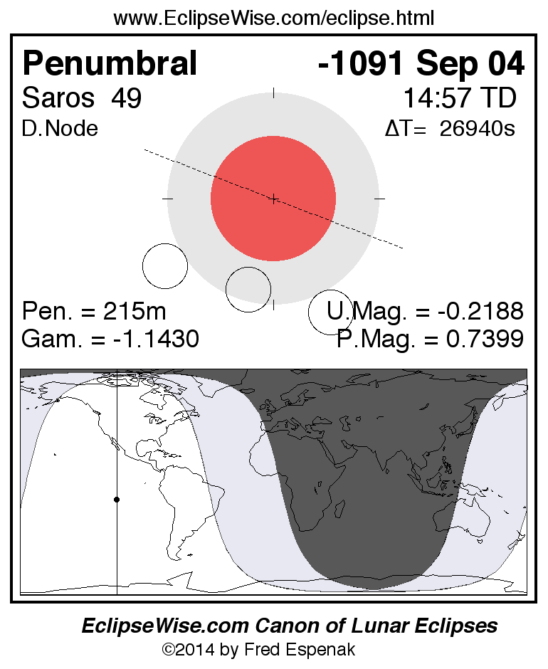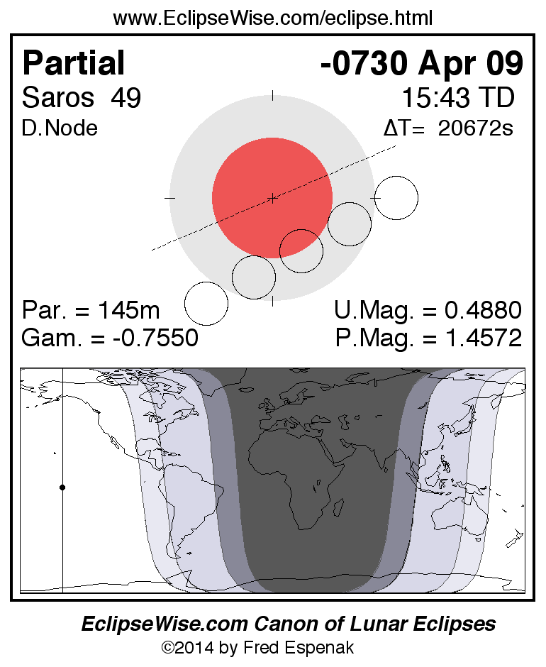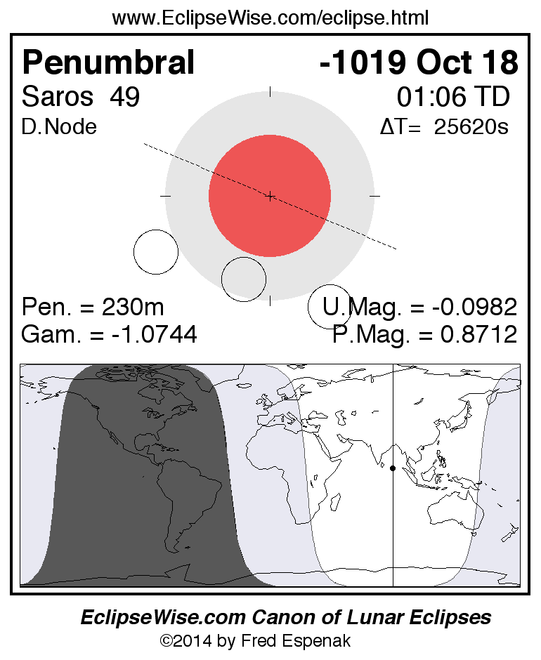 A panorama of all lunar eclipses belonging to Saros 49 is presented here. Each figure shows the Moon's path with respect to Earth's penumbral and umbral shadows. Below the path is a map depicting the geographic region of visibility for the eclipse. The date and time are given for the instant of Greatest Eclipse. Every figure serves as a hyperlink to the EclipseWise Prime page for that eclipse with a larger figure and complete details for the eclipse. Visit the Key to Lunar Eclipse Figures for a detailed explanation of these diagrams. Near the bottom of this page are a series of hyperlinks for more on lunar eclipses.