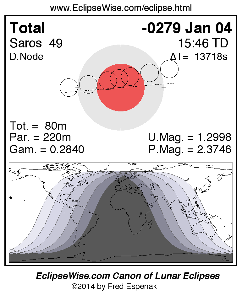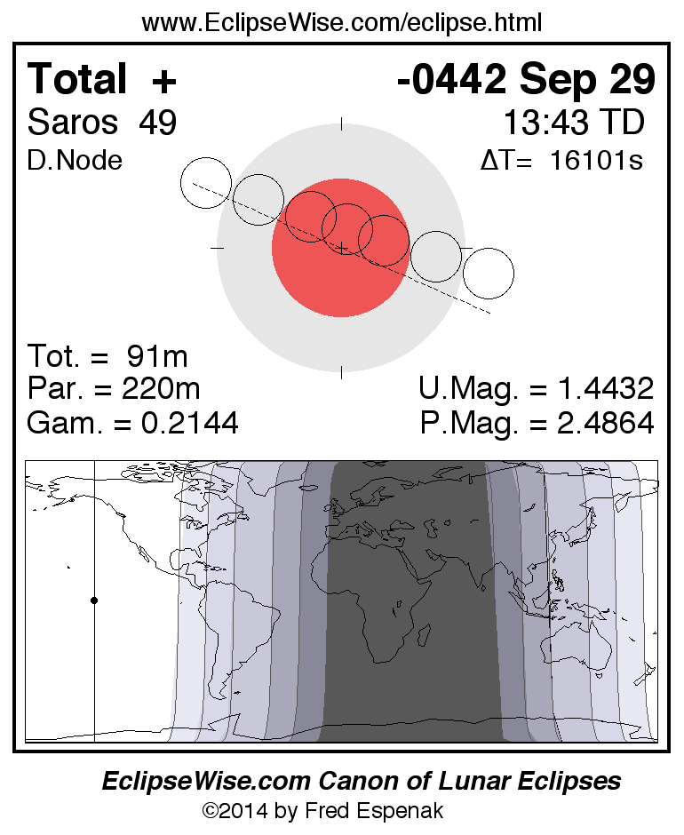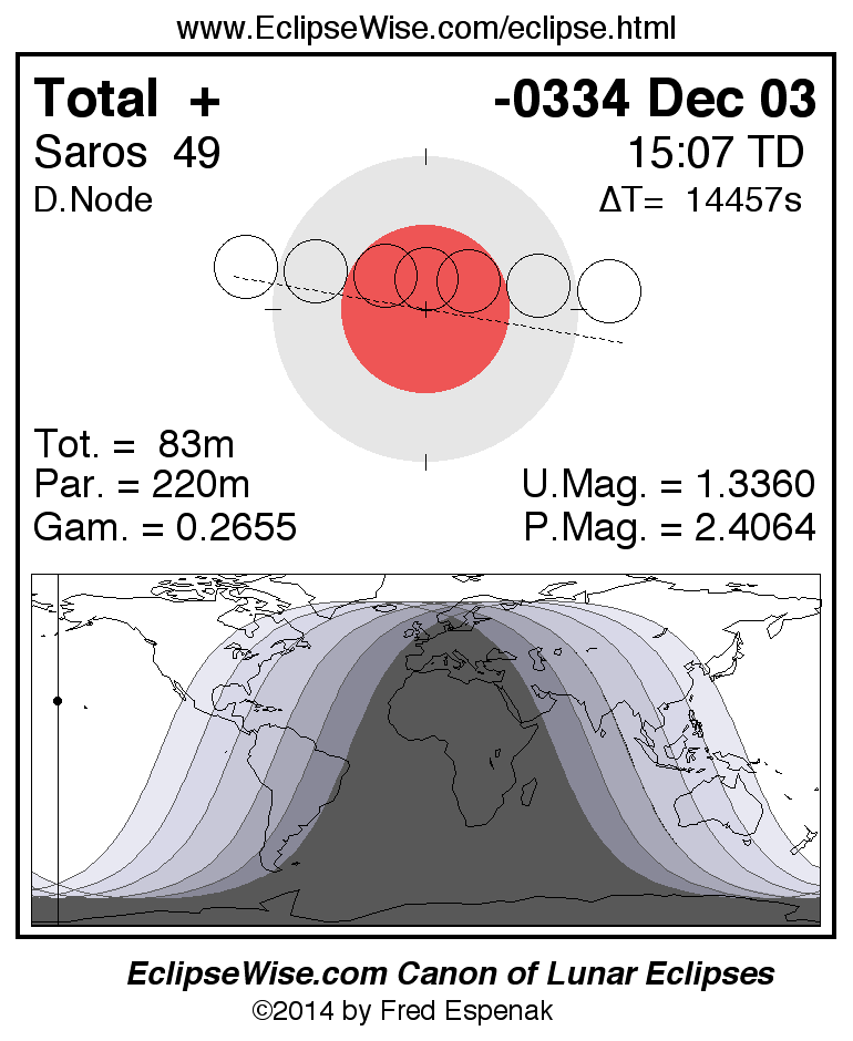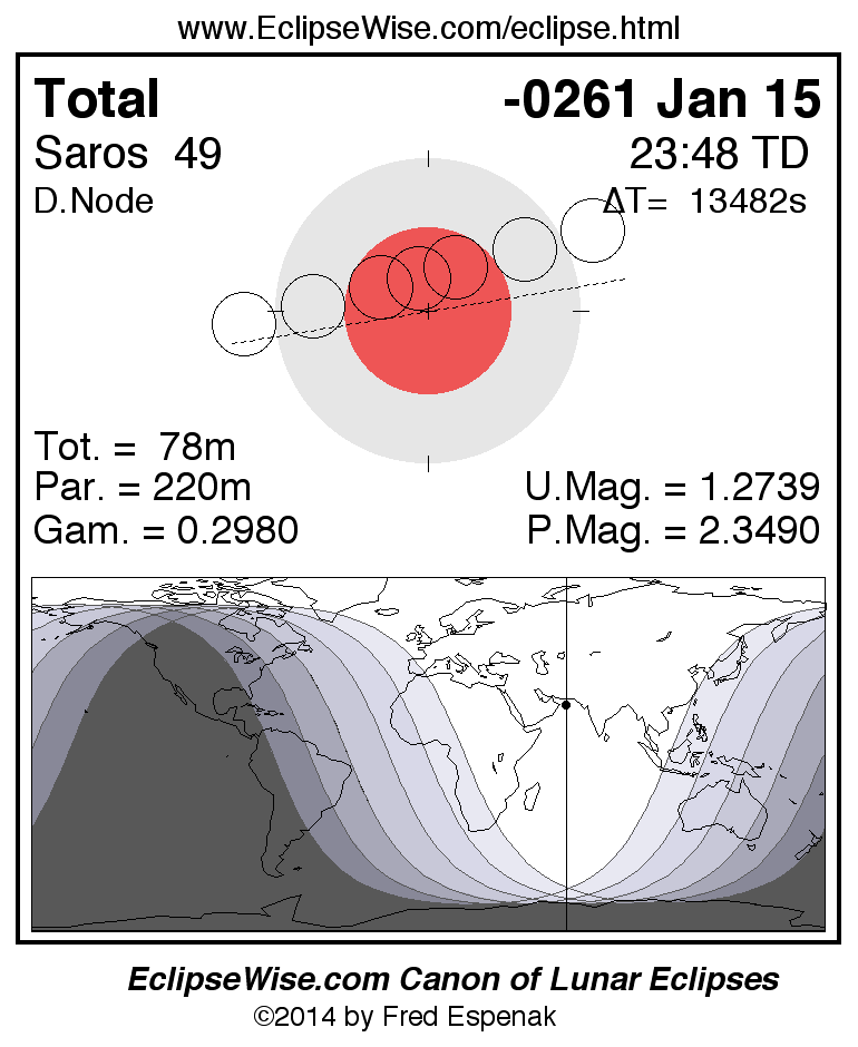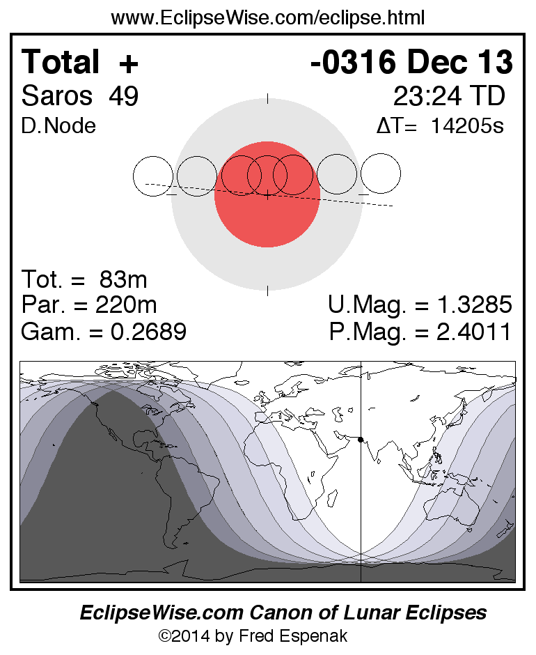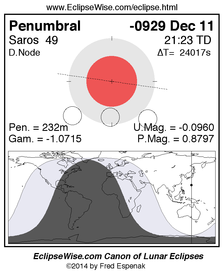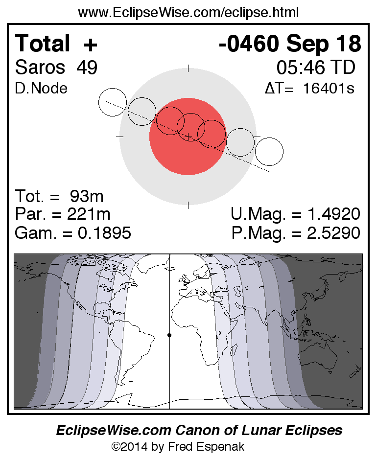 A panorama of all lunar eclipses belonging to Saros 49 is presented here. Each figure shows the Moon's path with respect to Earth's penumbral and umbral shadows. Below the path is a map depicting the geographic region of visibility for the eclipse. The date and time are given for the instant of Greatest Eclipse. Every figure serves as a hyperlink to the EclipseWise Prime page for that eclipse with a larger figure and complete details for the eclipse. Visit the Key to Lunar Eclipse Figures for a detailed explanation of these diagrams. Near the bottom of this page are a series of hyperlinks for more on lunar eclipses.
