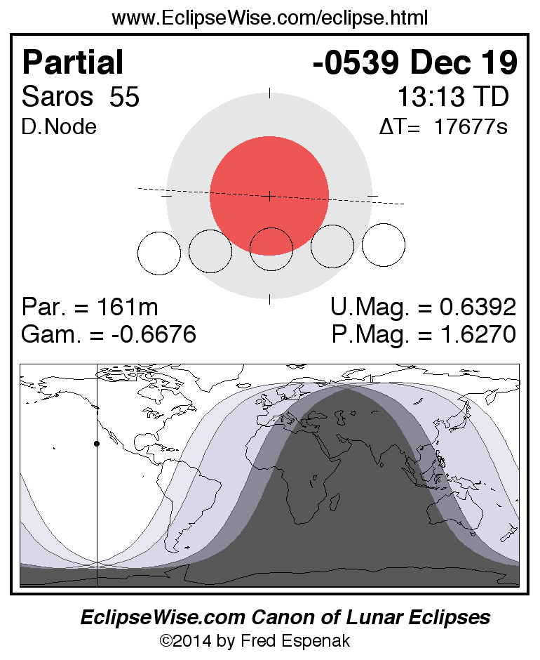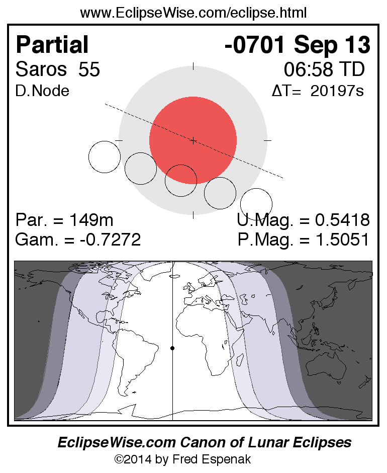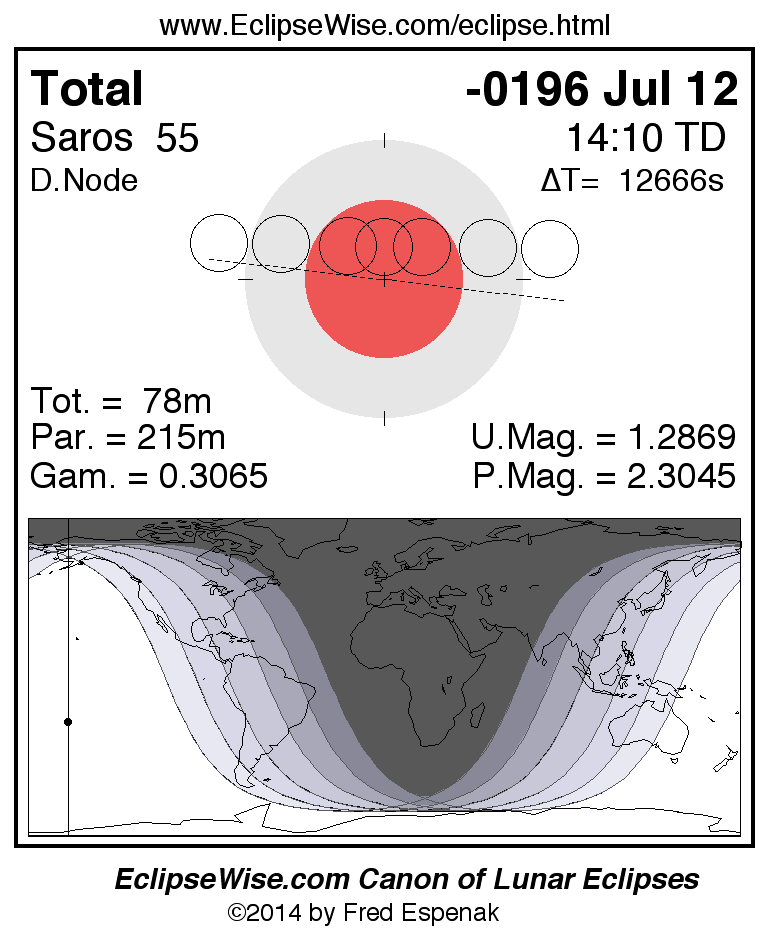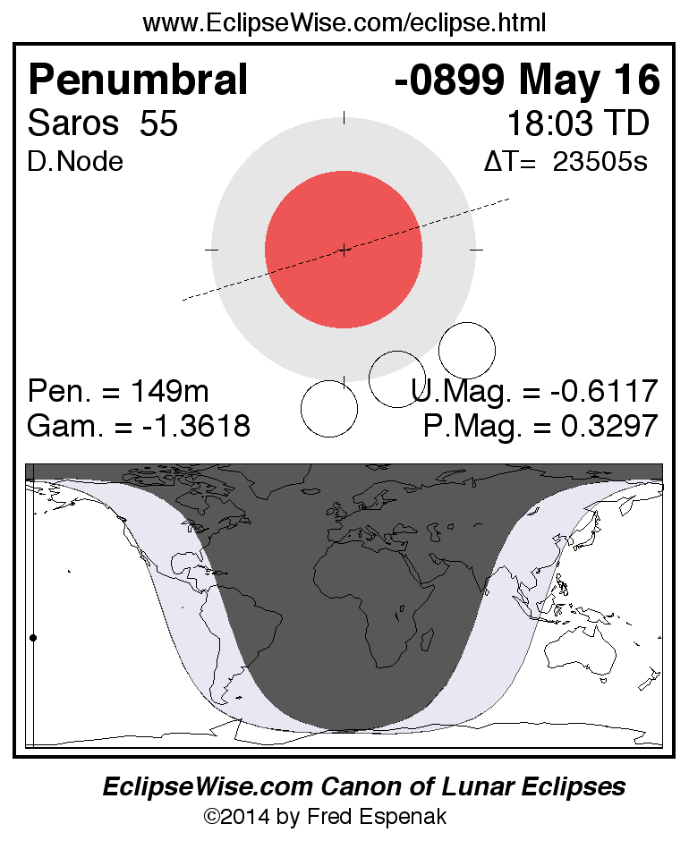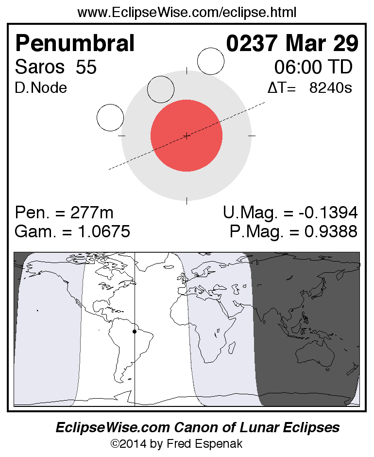 A panorama of all lunar eclipses belonging to Saros 55 is presented here. Each figure shows the Moon's path with respect to Earth's penumbral and umbral shadows. Below the path is a map depicting the geographic region of visibility for the eclipse. The date and time are given for the instant of Greatest Eclipse. Every figure serves as a hyperlink to the EclipseWise Prime page for that eclipse with a larger figure and complete details for the eclipse. Visit the Key to Lunar Eclipse Figures for a detailed explanation of these diagrams. Near the bottom of this page are a series of hyperlinks for more on lunar eclipses.