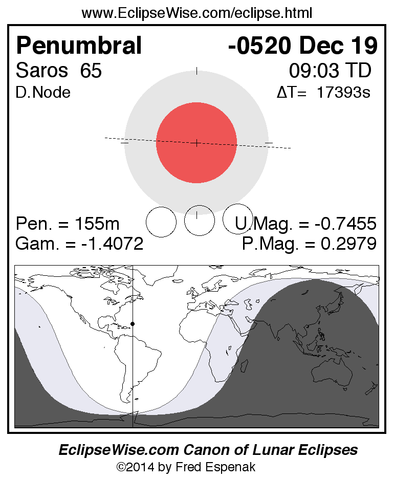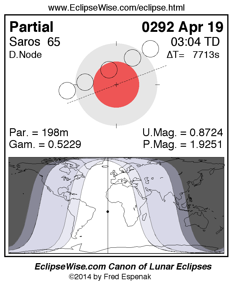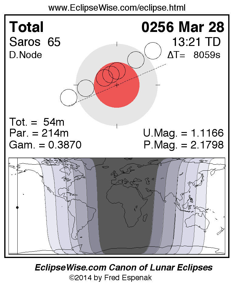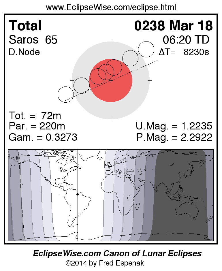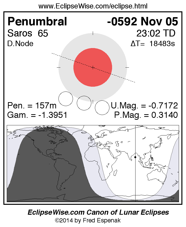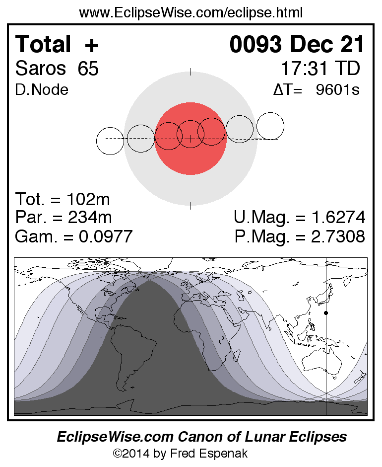 A panorama of all lunar eclipses belonging to Saros 65 is presented here. Each figure shows the Moon's path with respect to Earth's penumbral and umbral shadows. Below the path is a map depicting the geographic region of visibility for the eclipse. The date and time are given for the instant of Greatest Eclipse. Every figure serves as a hyperlink to the EclipseWise Prime page for that eclipse with a larger figure and complete details for the eclipse. Visit the Key to Lunar Eclipse Figures for a detailed explanation of these diagrams. Near the bottom of this page are a series of hyperlinks for more on lunar eclipses.