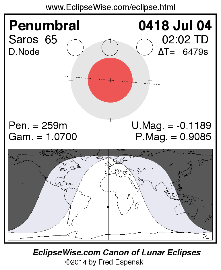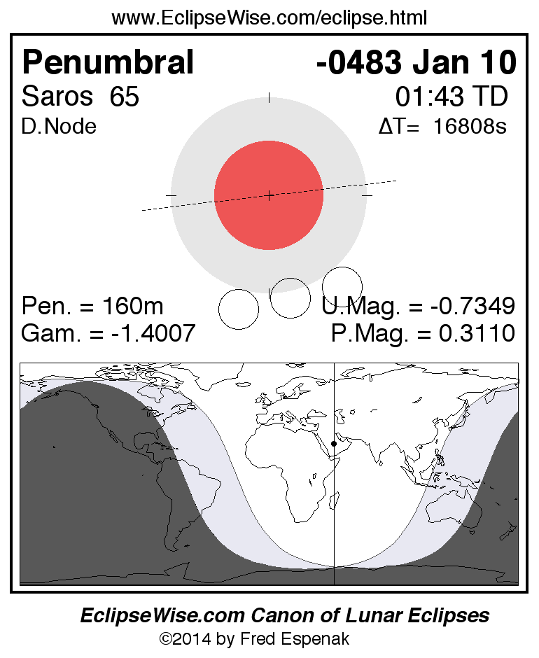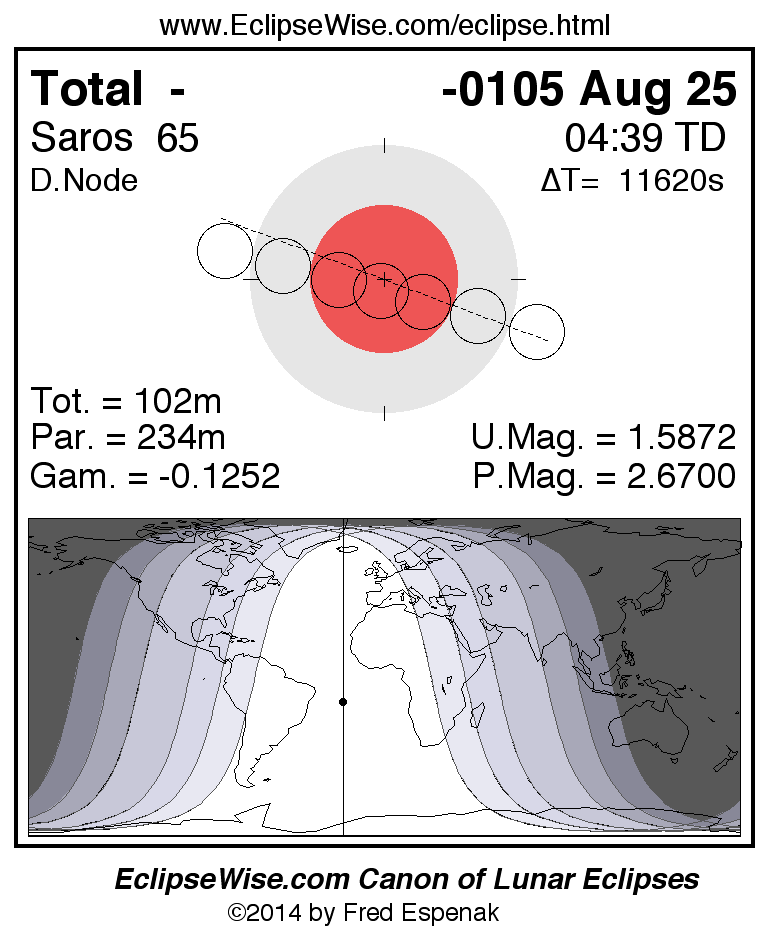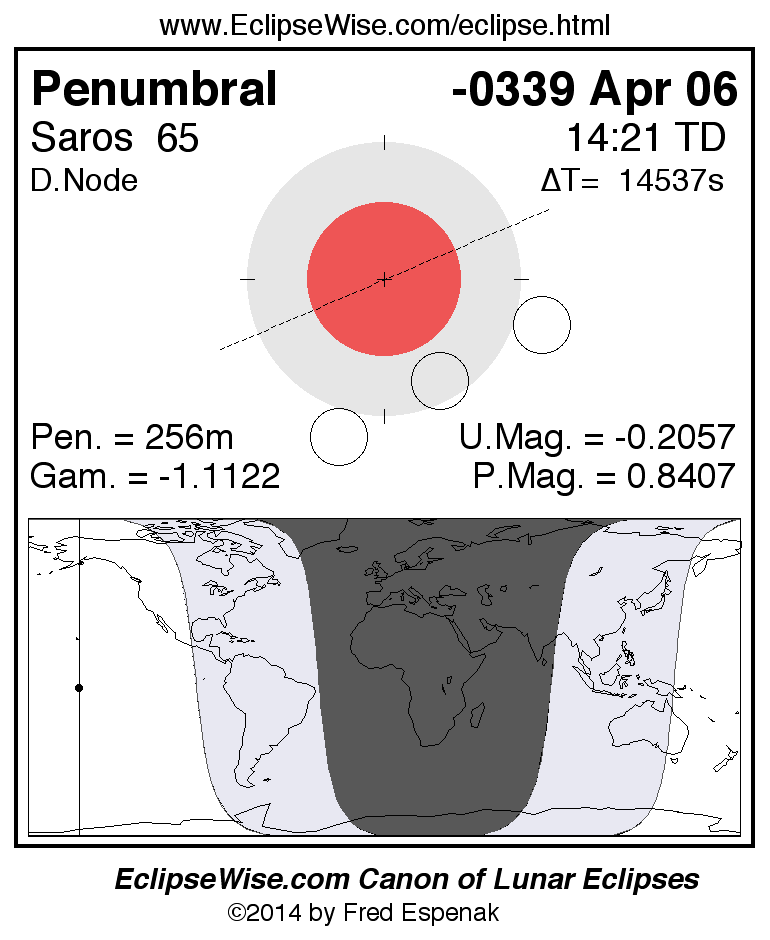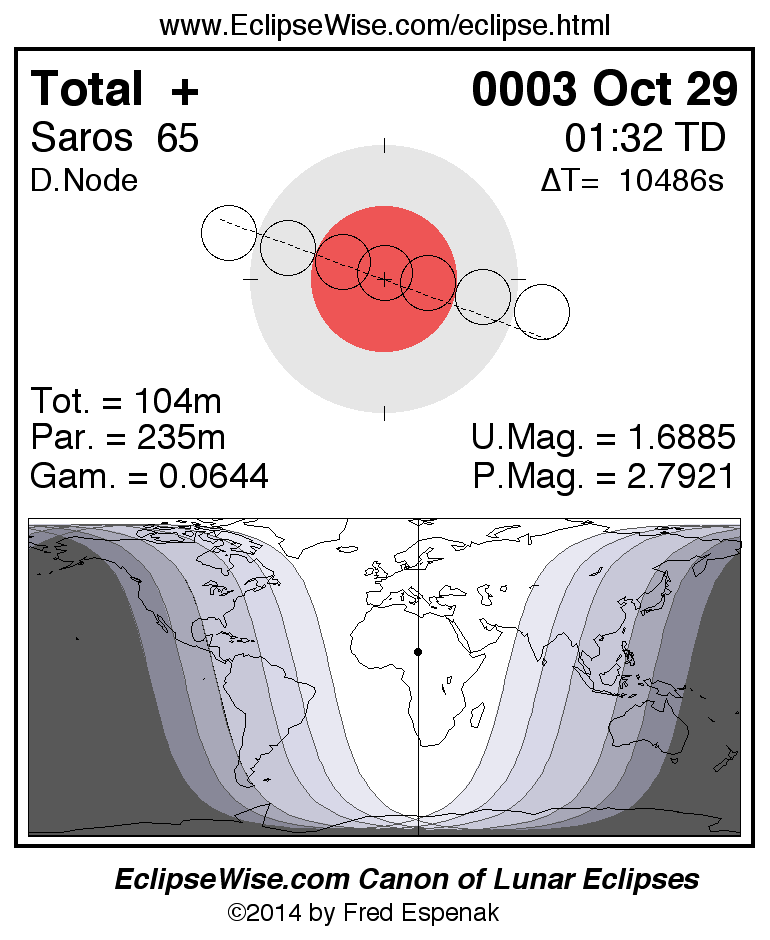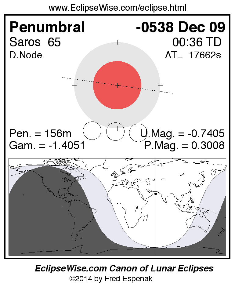 A panorama of all lunar eclipses belonging to Saros 65 is presented here. Each figure shows the Moon's path with respect to Earth's penumbral and umbral shadows. Below the path is a map depicting the geographic region of visibility for the eclipse. The date and time are given for the instant of Greatest Eclipse. Every figure serves as a hyperlink to the EclipseWise Prime page for that eclipse with a larger figure and complete details for the eclipse. Visit the Key to Lunar Eclipse Figures for a detailed explanation of these diagrams. Near the bottom of this page are a series of hyperlinks for more on lunar eclipses.