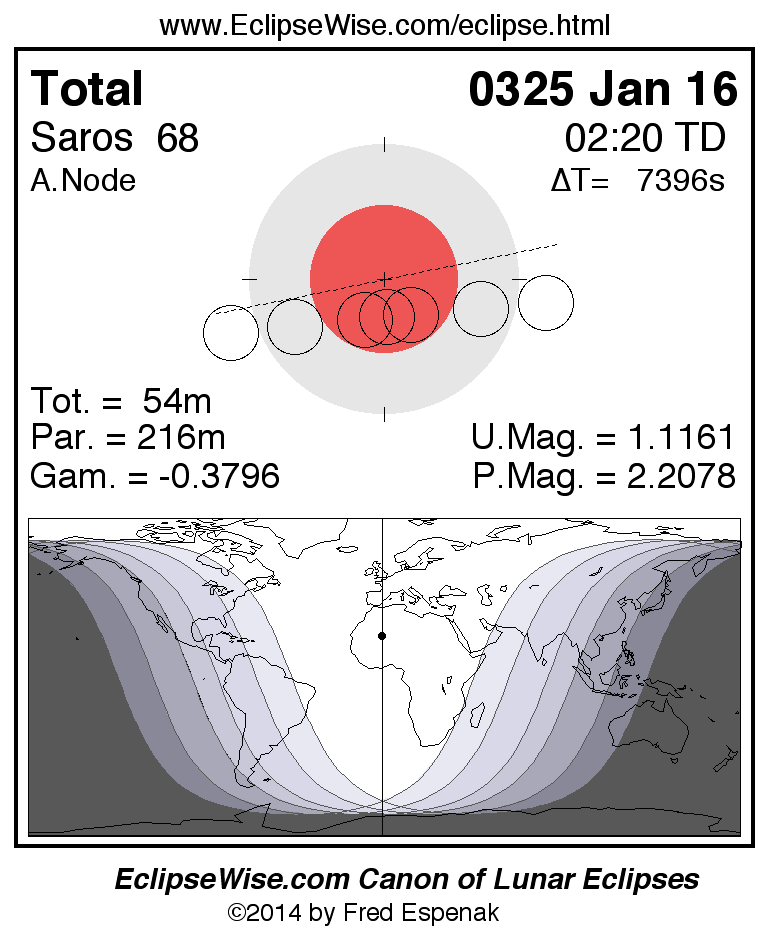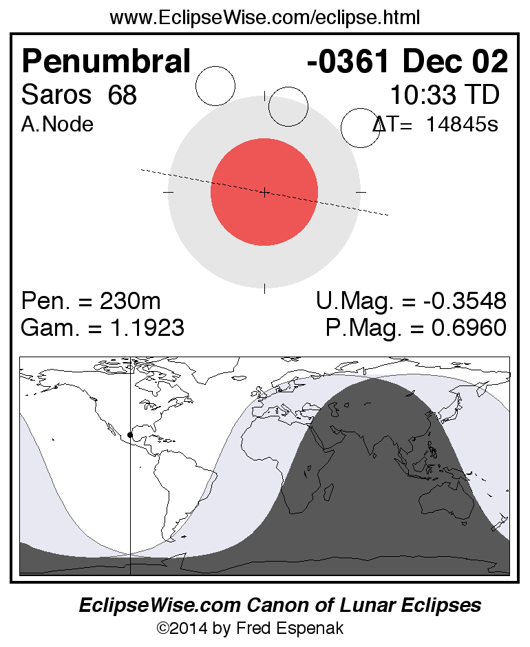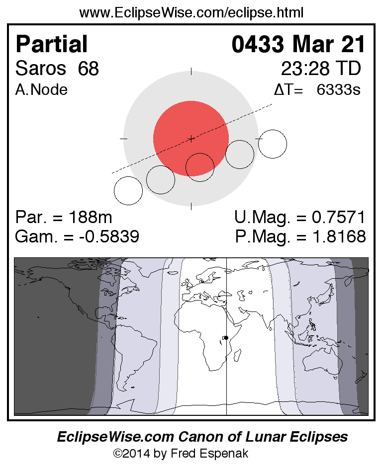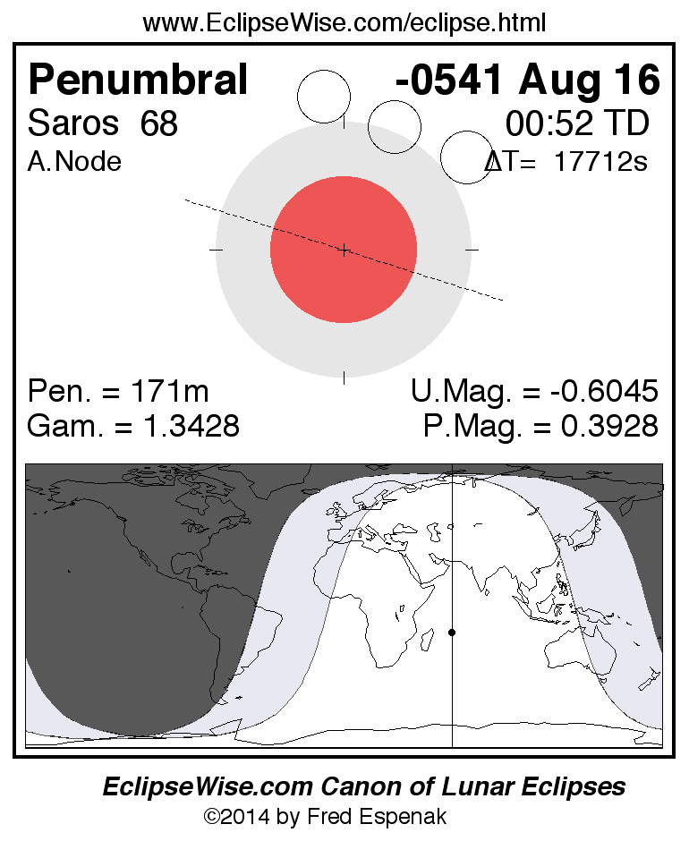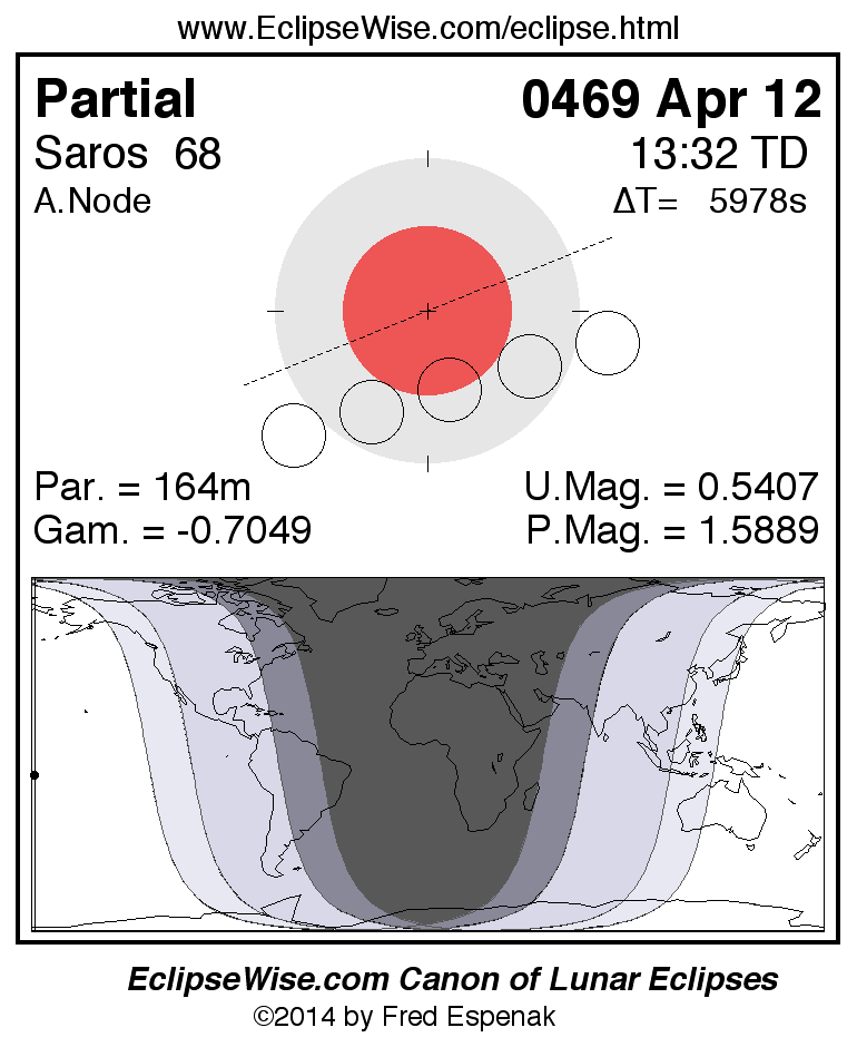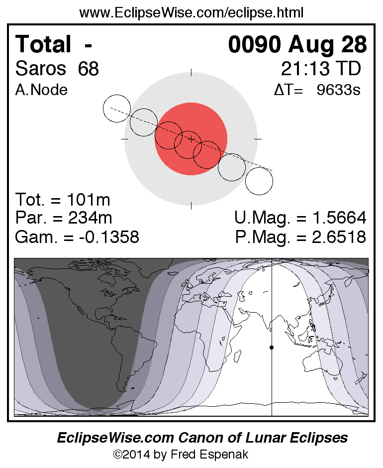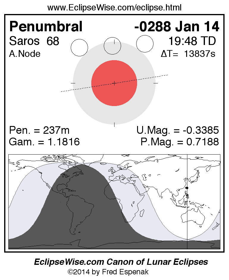 A panorama of all lunar eclipses belonging to Saros 68 is presented here. Each figure shows the Moon's path with respect to Earth's penumbral and umbral shadows. Below the path is a map depicting the geographic region of visibility for the eclipse. The date and time are given for the instant of Greatest Eclipse. Every figure serves as a hyperlink to the EclipseWise Prime page for that eclipse with a larger figure and complete details for the eclipse. Visit the Key to Lunar Eclipse Figures for a detailed explanation of these diagrams. Near the bottom of this page are a series of hyperlinks for more on lunar eclipses.