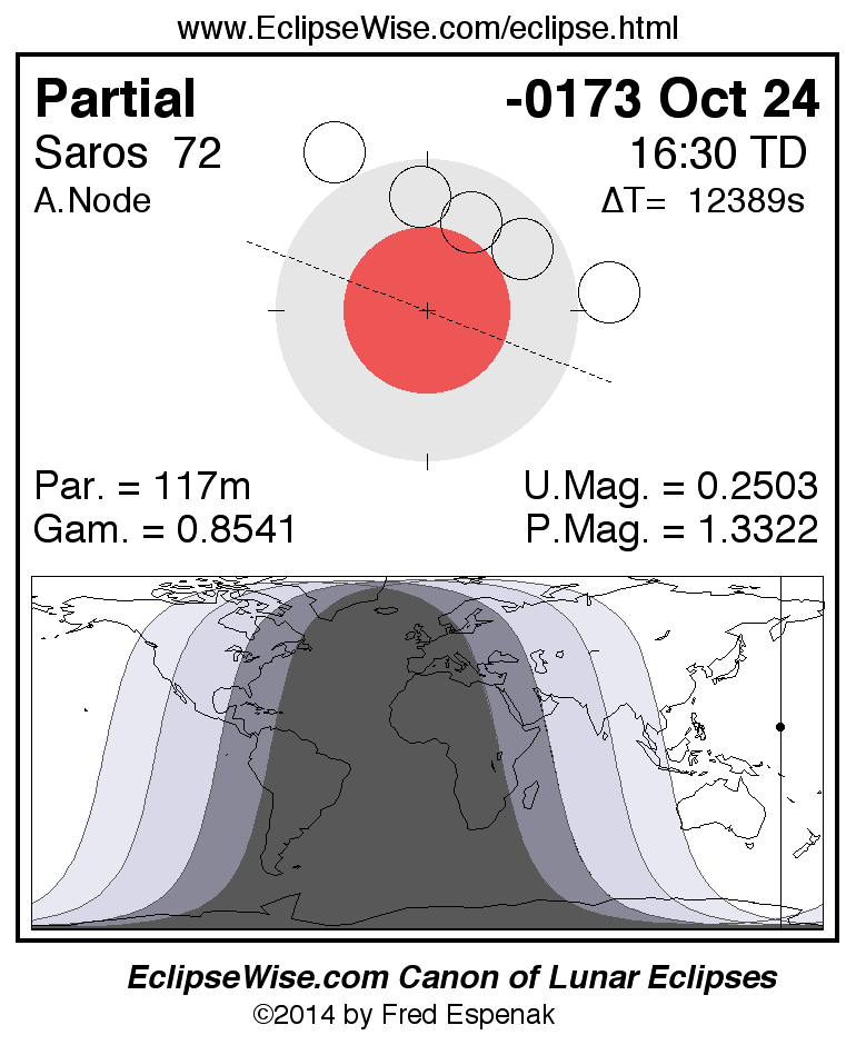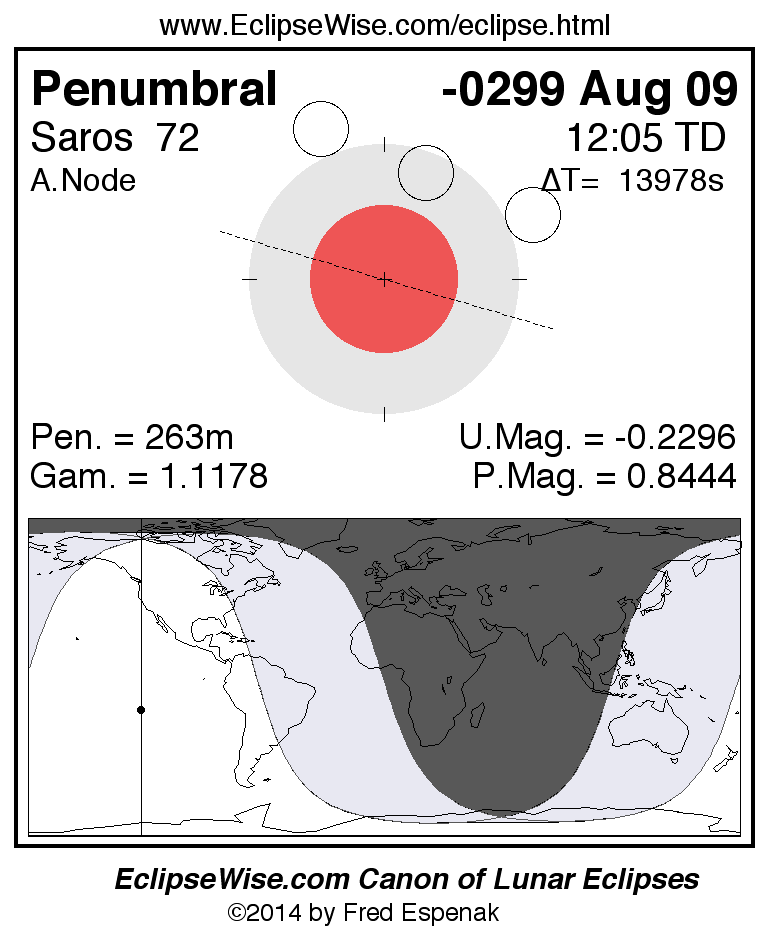 A panorama of all lunar eclipses belonging to Saros 72 is presented here. Each figure shows the Moon's path with respect to Earth's penumbral and umbral shadows. Below the path is a map depicting the geographic region of visibility for the eclipse. The date and time are given for the instant of Greatest Eclipse. Every figure serves as a hyperlink to the EclipseWise Prime page for that eclipse with a larger figure and complete details for the eclipse. Visit the Key to Lunar Eclipse Figures for a detailed explanation of these diagrams. Near the bottom of this page are a series of hyperlinks for more on lunar eclipses.