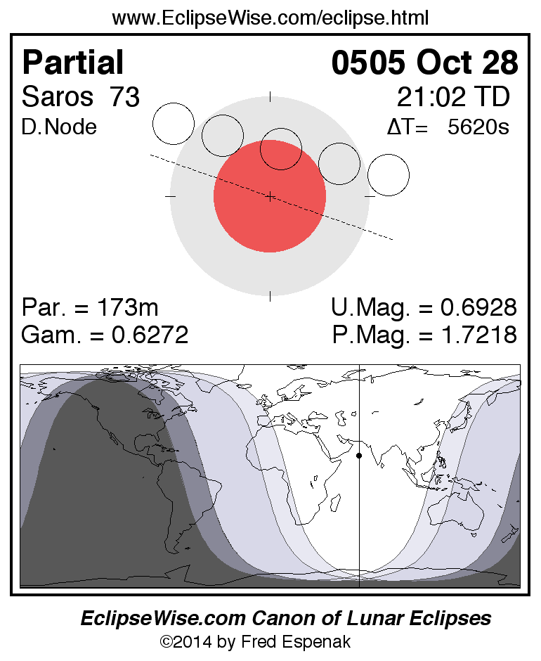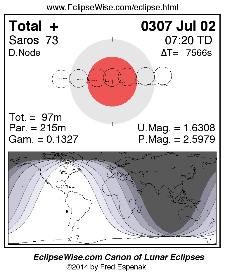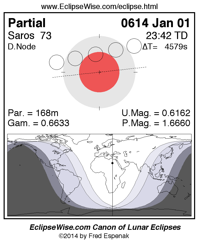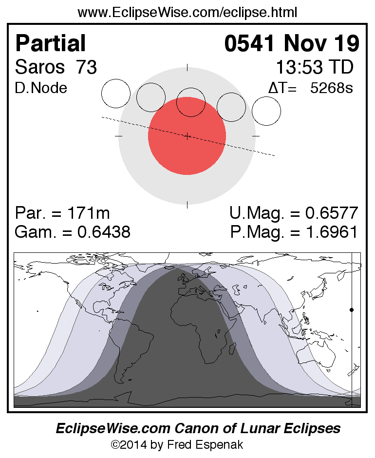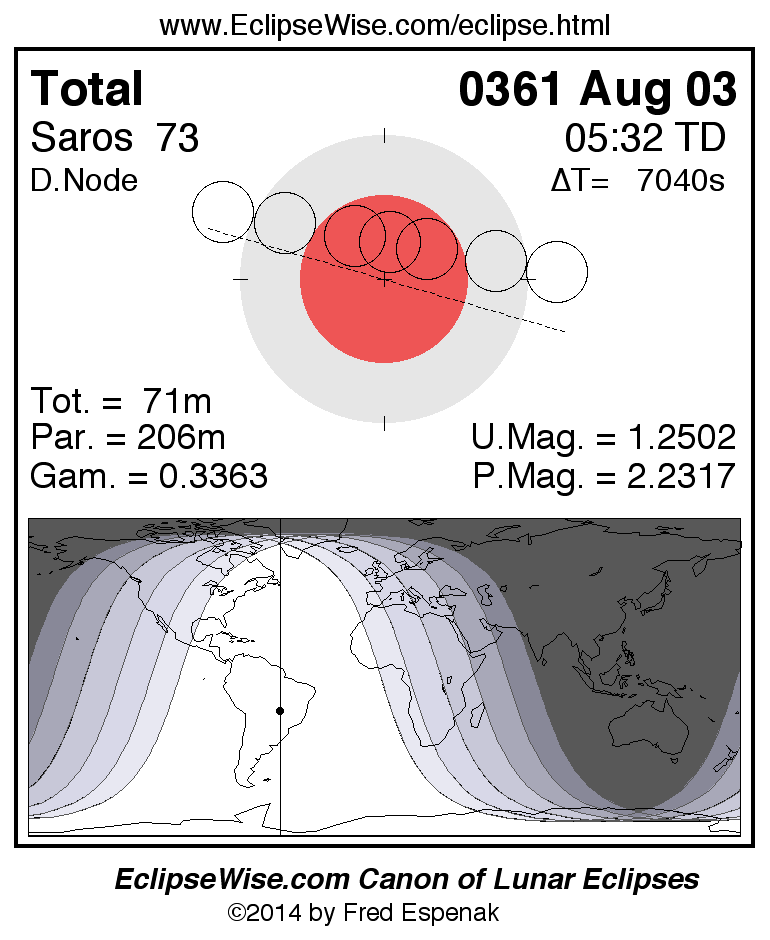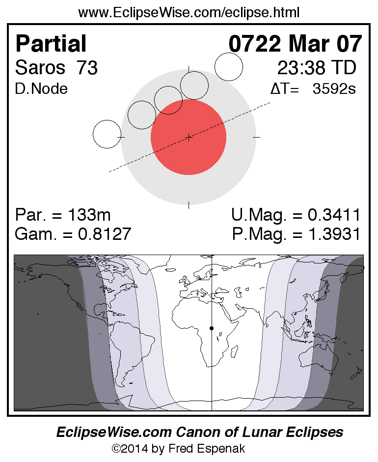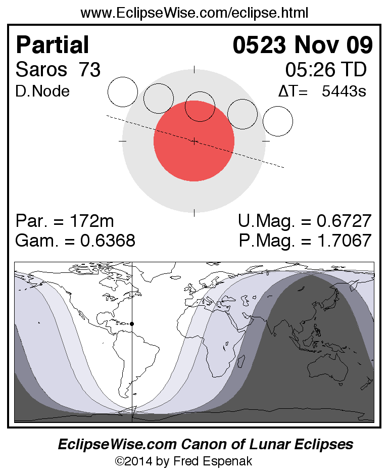 A panorama of all lunar eclipses belonging to Saros 73 is presented here. Each figure shows the Moon's path with respect to Earth's penumbral and umbral shadows. Below the path is a map depicting the geographic region of visibility for the eclipse. The date and time are given for the instant of Greatest Eclipse. Every figure serves as a hyperlink to the EclipseWise Prime page for that eclipse with a larger figure and complete details for the eclipse. Visit the Key to Lunar Eclipse Figures for a detailed explanation of these diagrams. Near the bottom of this page are a series of hyperlinks for more on lunar eclipses.