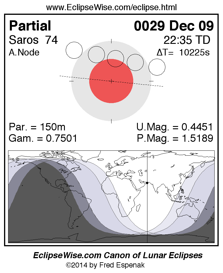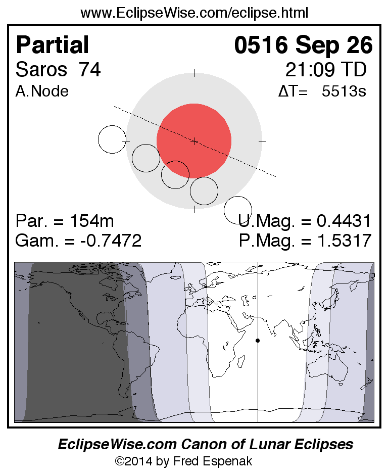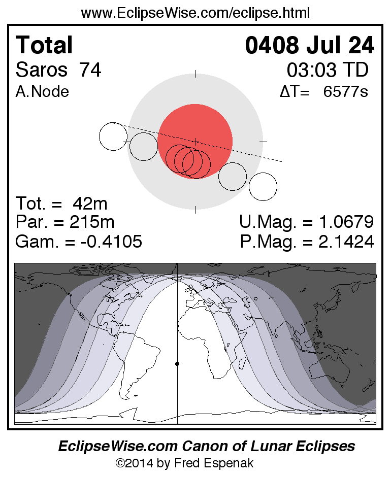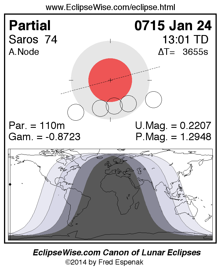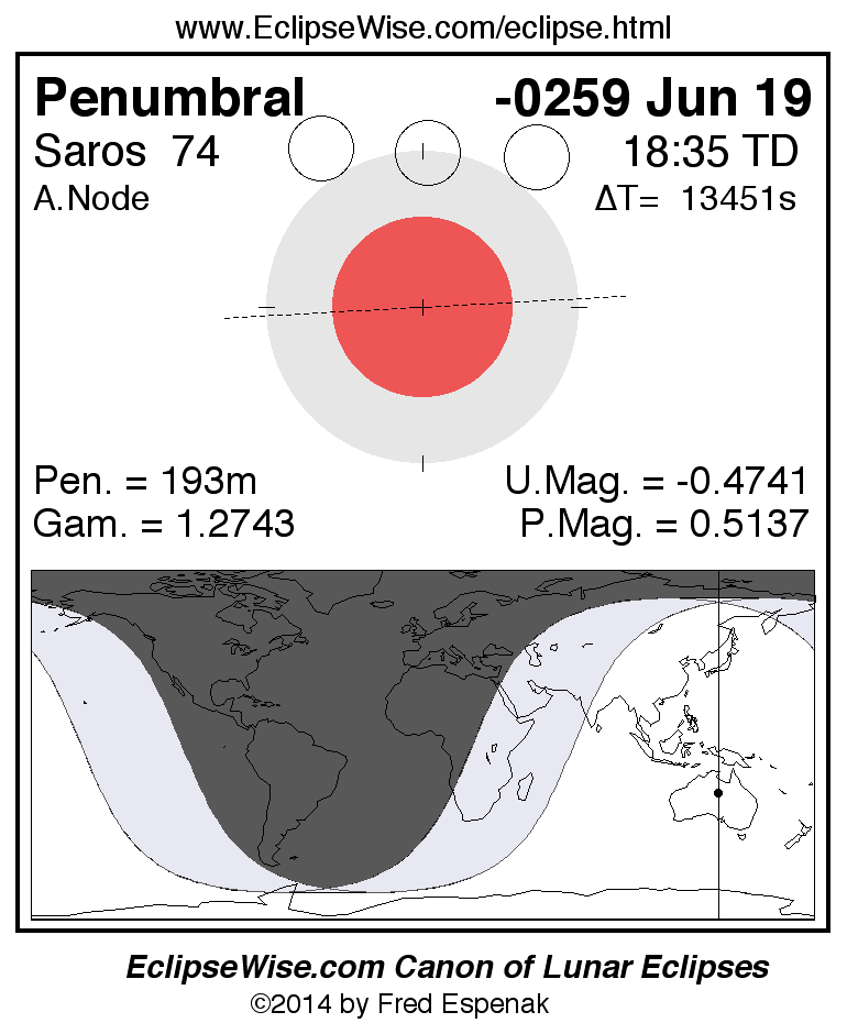 A panorama of all lunar eclipses belonging to Saros 74 is presented here. Each figure shows the Moon's path with respect to Earth's penumbral and umbral shadows. Below the path is a map depicting the geographic region of visibility for the eclipse. The date and time are given for the instant of Greatest Eclipse. Every figure serves as a hyperlink to the EclipseWise Prime page for that eclipse with a larger figure and complete details for the eclipse. Visit the Key to Lunar Eclipse Figures for a detailed explanation of these diagrams. Near the bottom of this page are a series of hyperlinks for more on lunar eclipses.