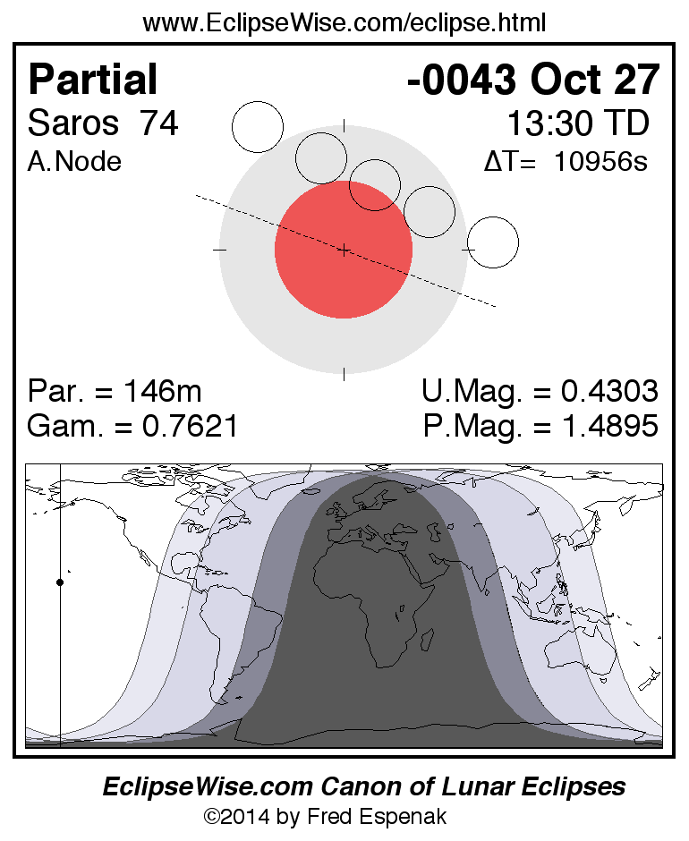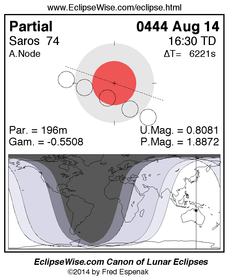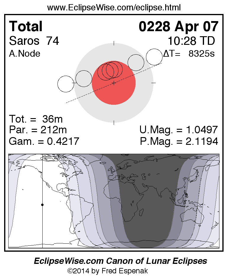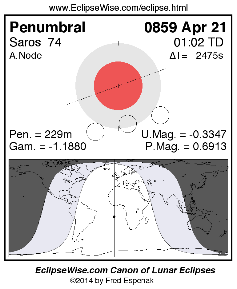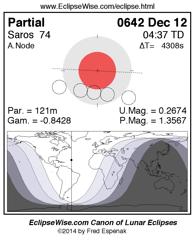 A panorama of all lunar eclipses belonging to Saros 74 is presented here. Each figure shows the Moon's path with respect to Earth's penumbral and umbral shadows. Below the path is a map depicting the geographic region of visibility for the eclipse. The date and time are given for the instant of Greatest Eclipse. Every figure serves as a hyperlink to the EclipseWise Prime page for that eclipse with a larger figure and complete details for the eclipse. Visit the Key to Lunar Eclipse Figures for a detailed explanation of these diagrams. Near the bottom of this page are a series of hyperlinks for more on lunar eclipses.